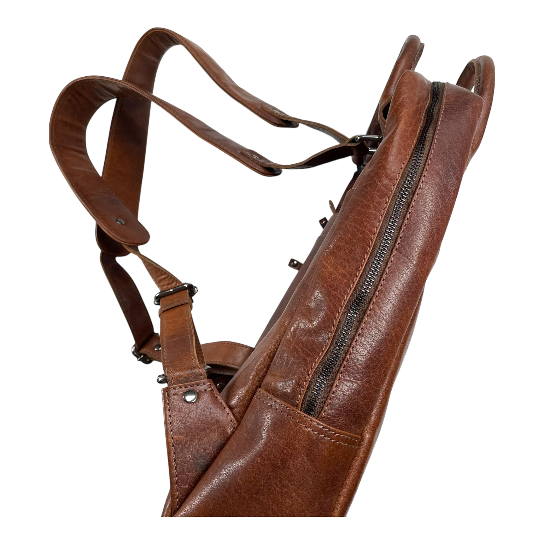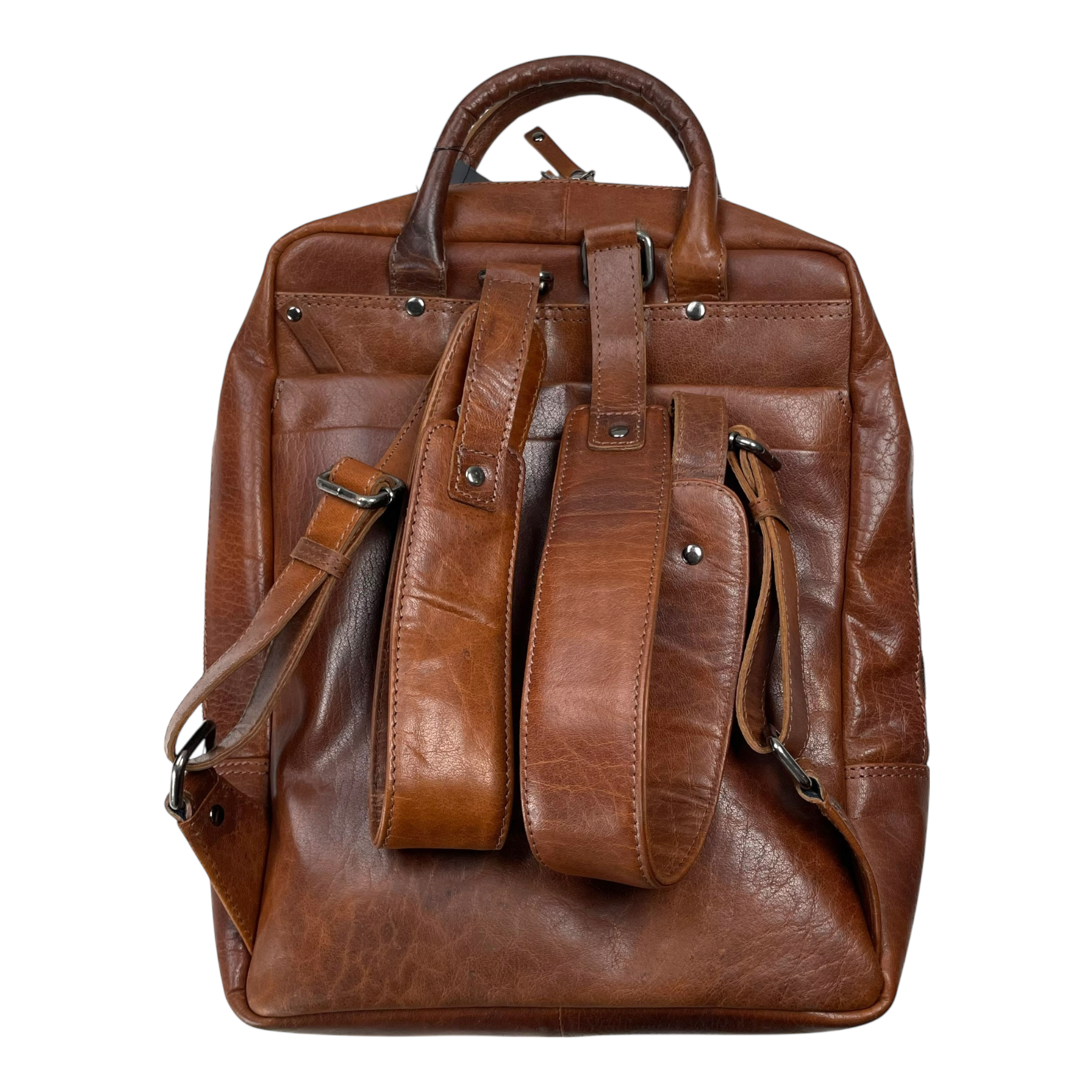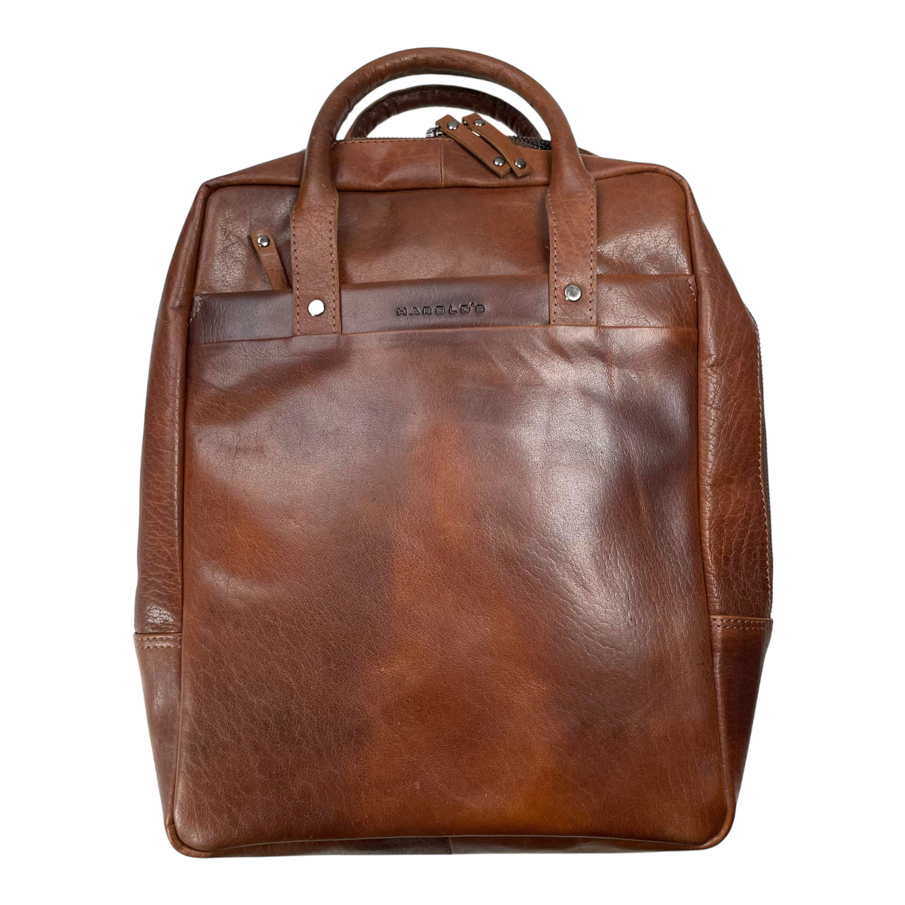 Harold's Bags Backpack is made of sturdy leather. There is adjustable straps, one small pocket in the front and the back. There is a zipper closure main compartment and two handles. Fits A4 documents.