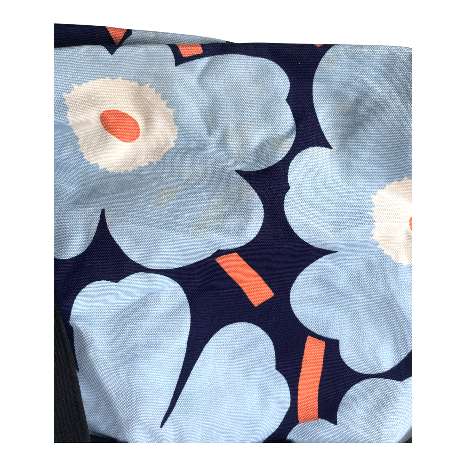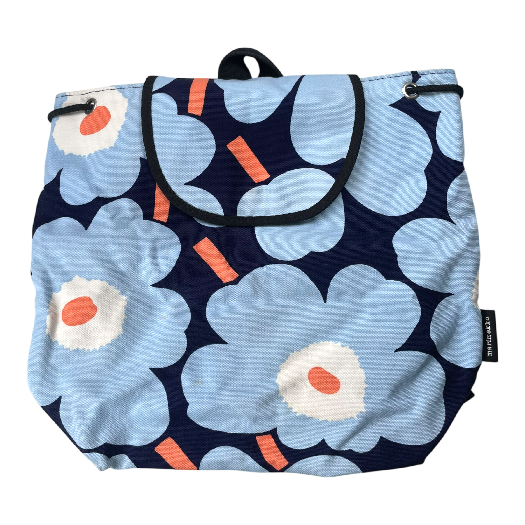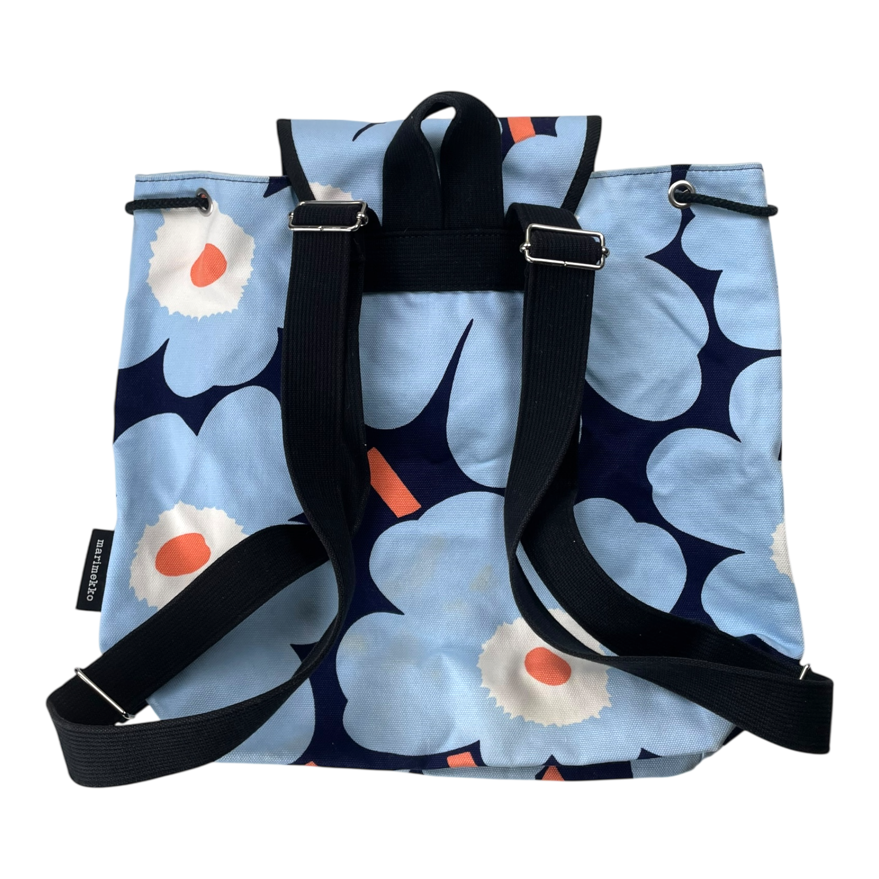 Marimekko Erika backpack in the Pieni Unikko print. The backpack has string and snap closure and adjustable straps. There is one smaller compartment with zipper on the inside.