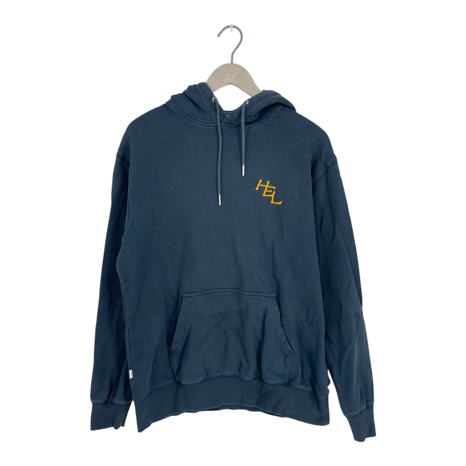 Makia HEL hoodie with a yellow HEL logo embroidered in the front. The string in the hood looks worn.