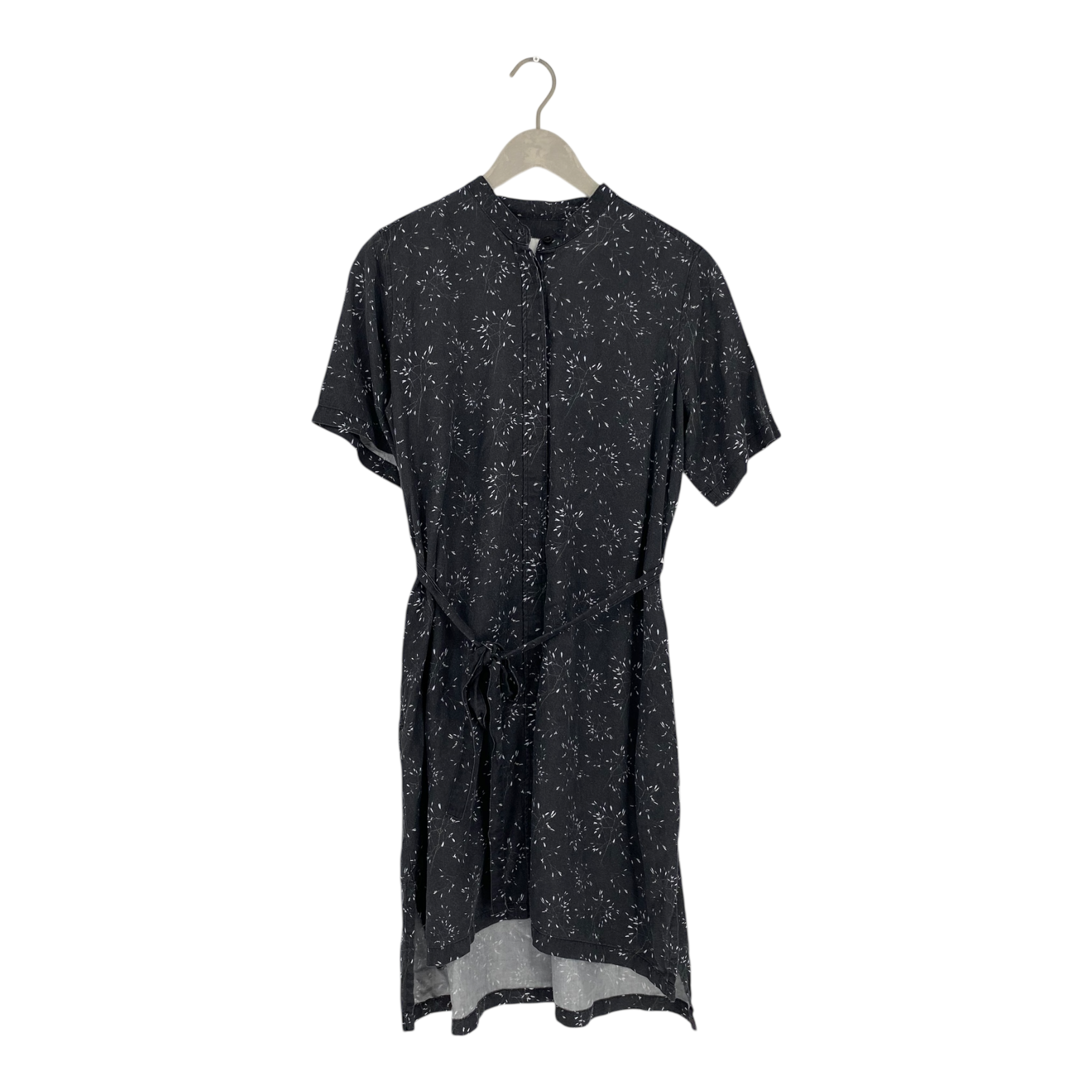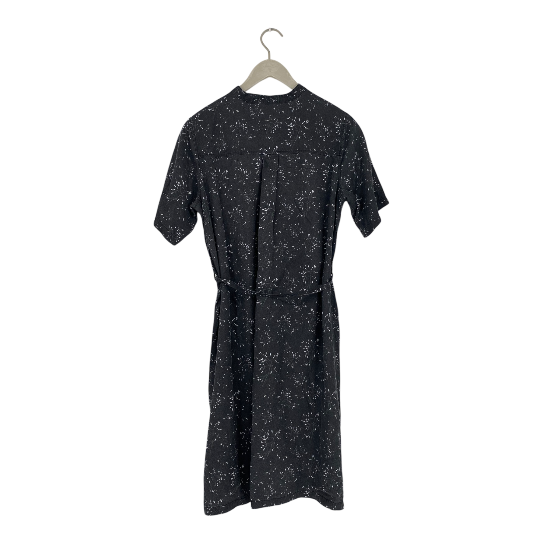 Makia woven short sleeve dress in grey flower print. The dress has buttons, a belt and pockets on the sides.