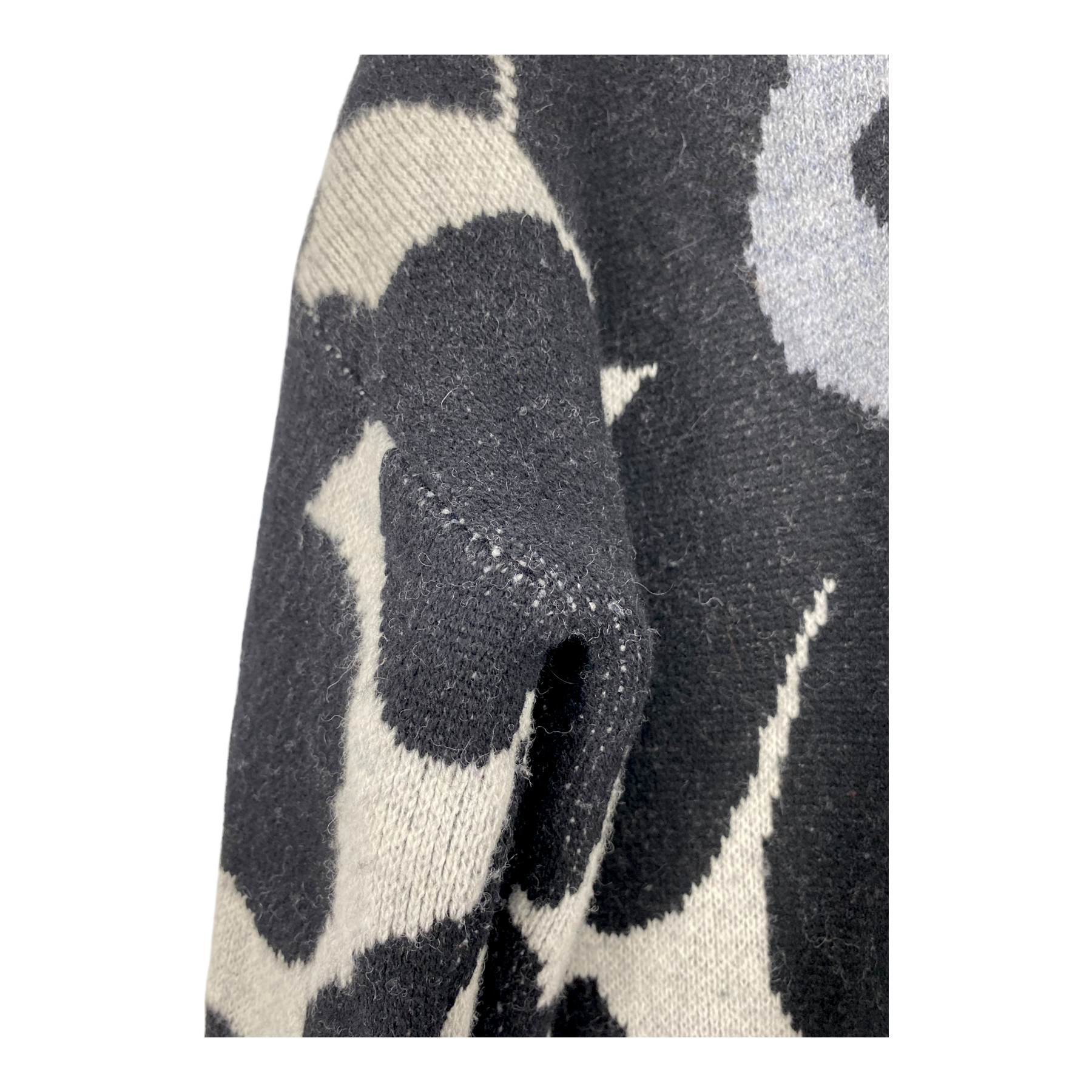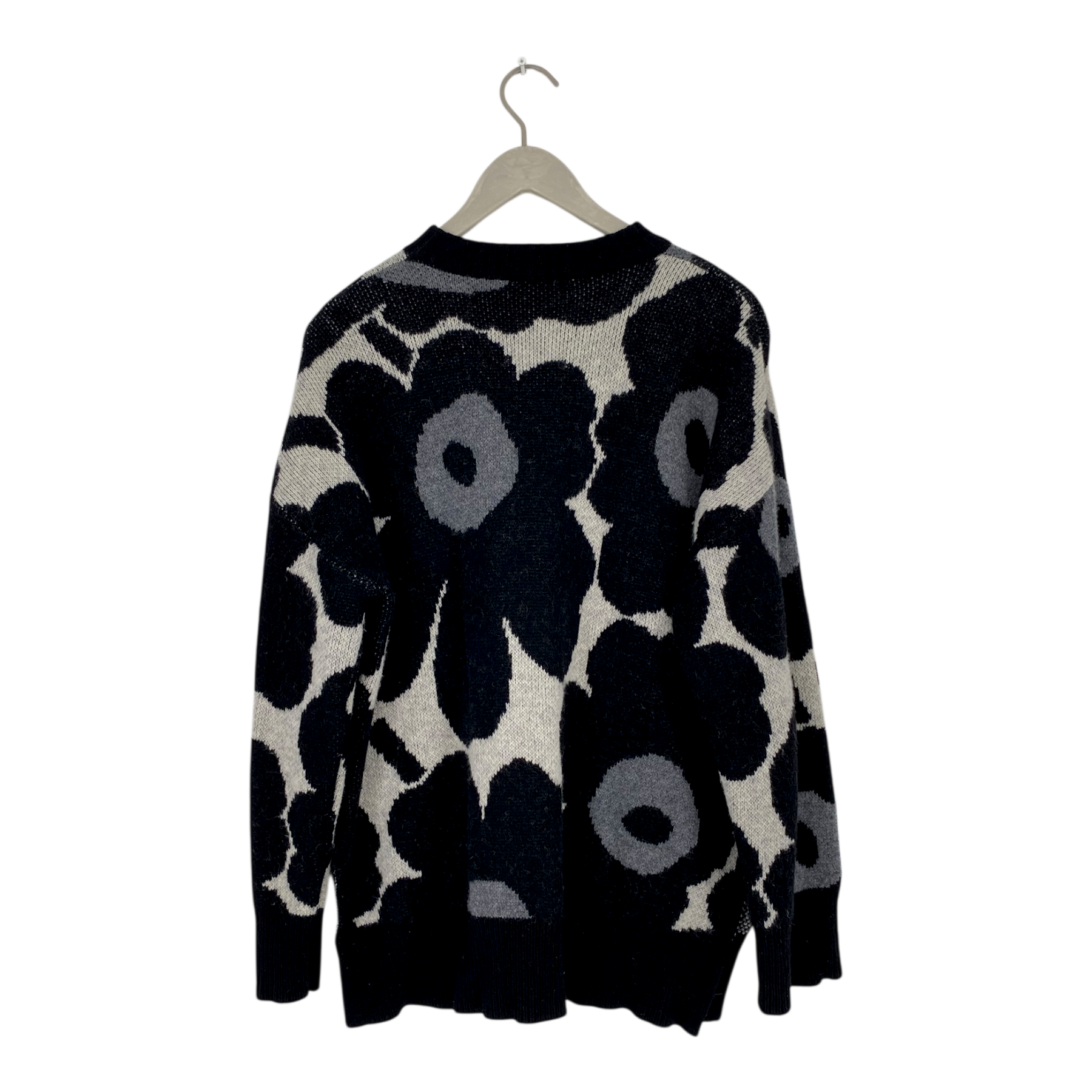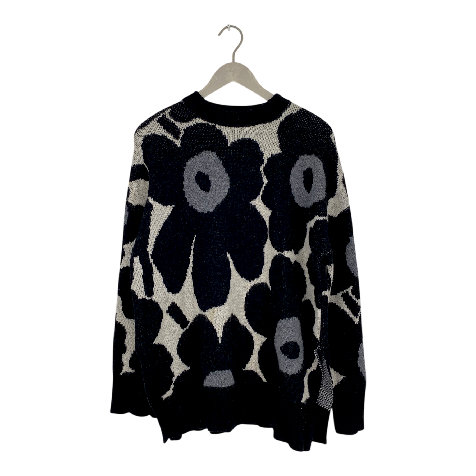 Marimekko Onnekas knit sweater with round neckline and slits on the sides in the classic Unikko print. The seams show signs of wear.