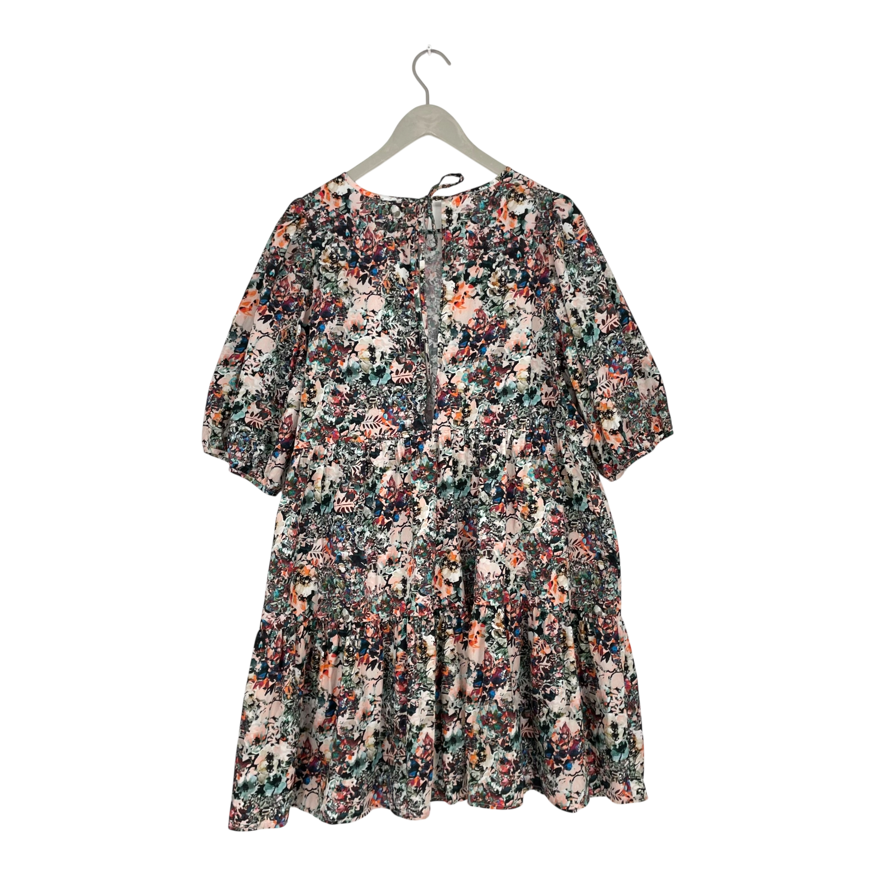 Kaiko women's Tiered Mini Dress is made from high-quality organic cotton poplin. The loose-fitting dress features three-quarter puffed sleeves and a voluminous tiered mini-length hem. It has a neck tie closure and a deep slit at the center back that extends to the waist seam.  The print is a layered, colorful Blooming Forest. Unlined.