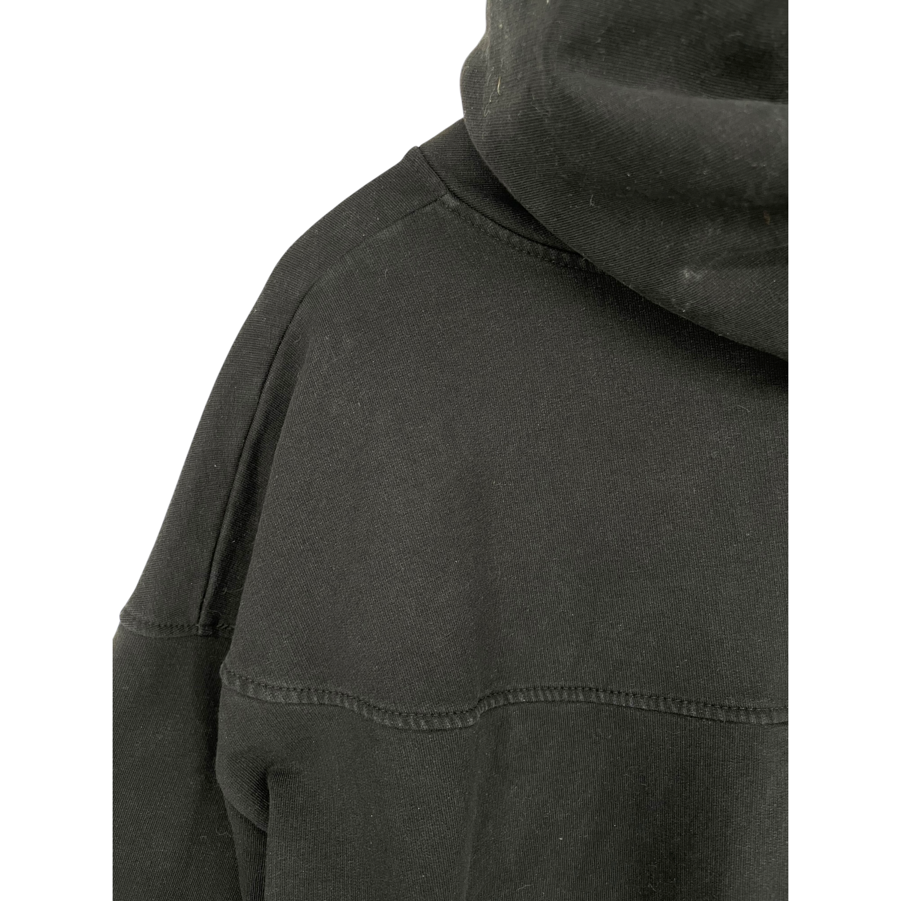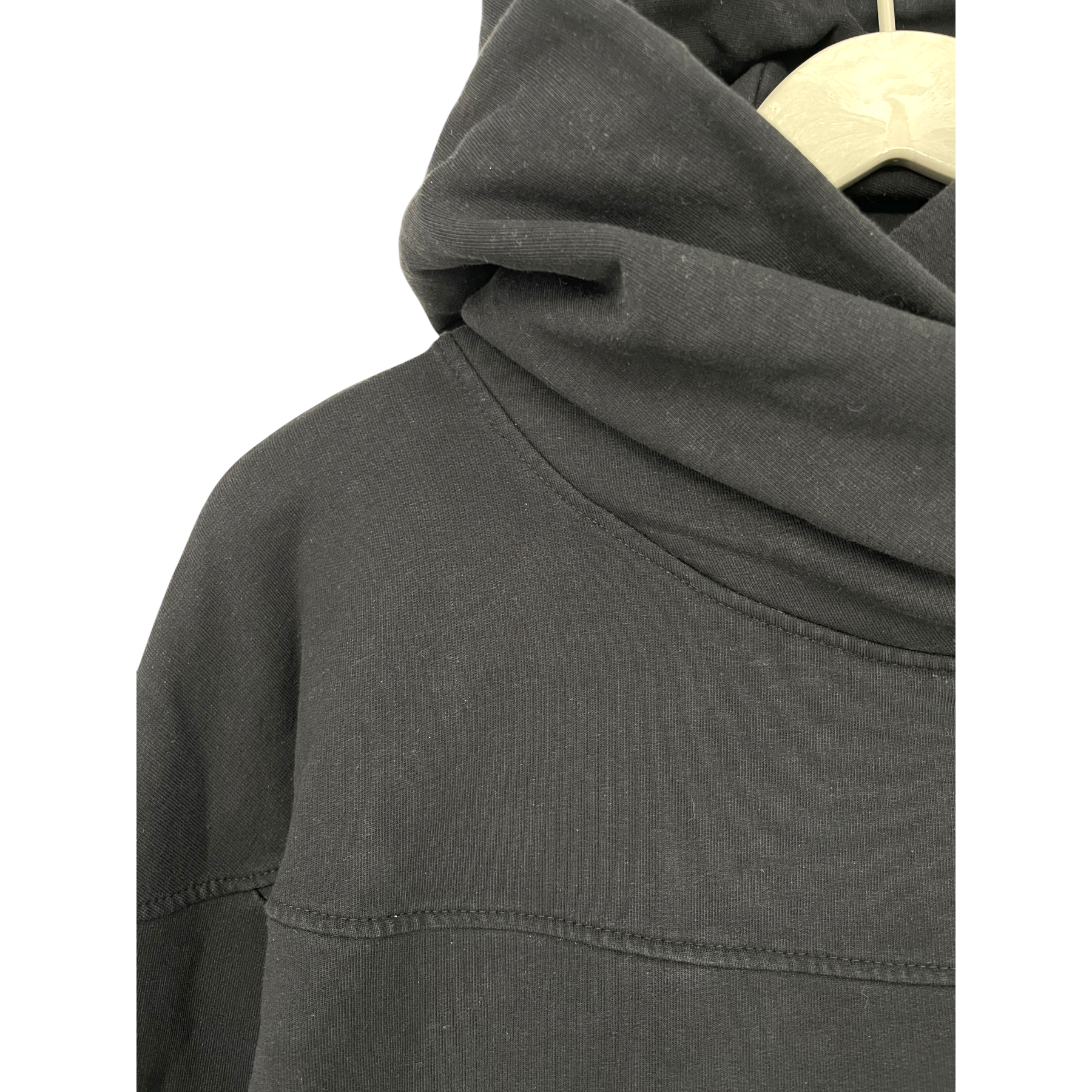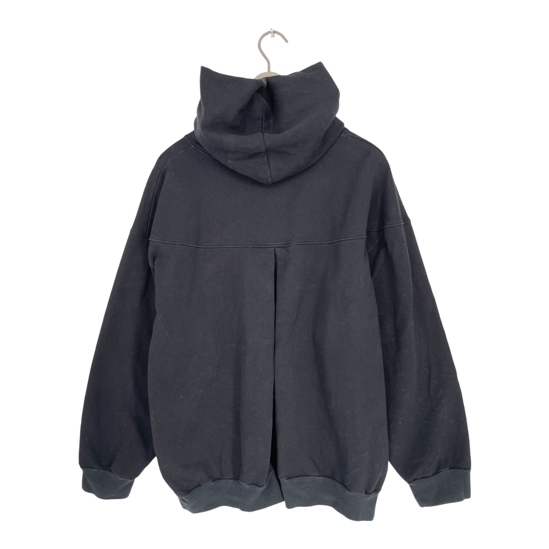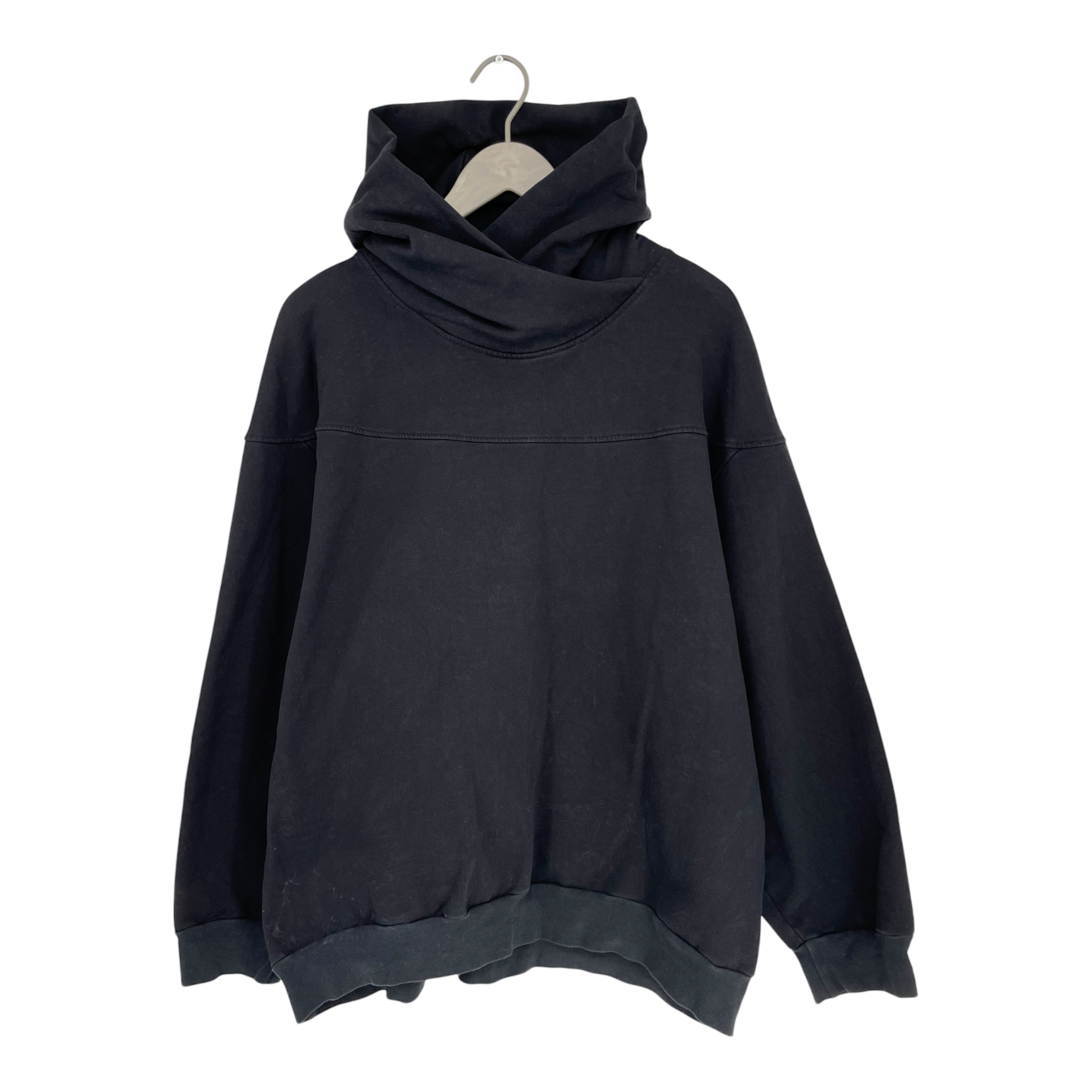 Ommellinen giant hoodie with crossed big hood and pleat detail on back.