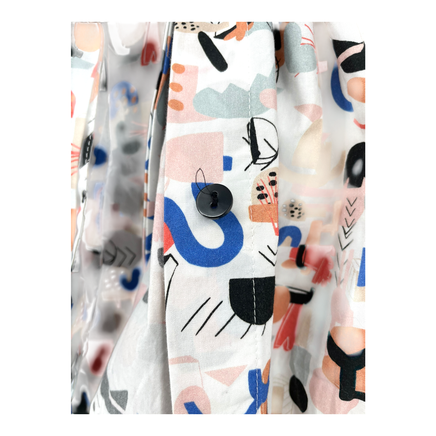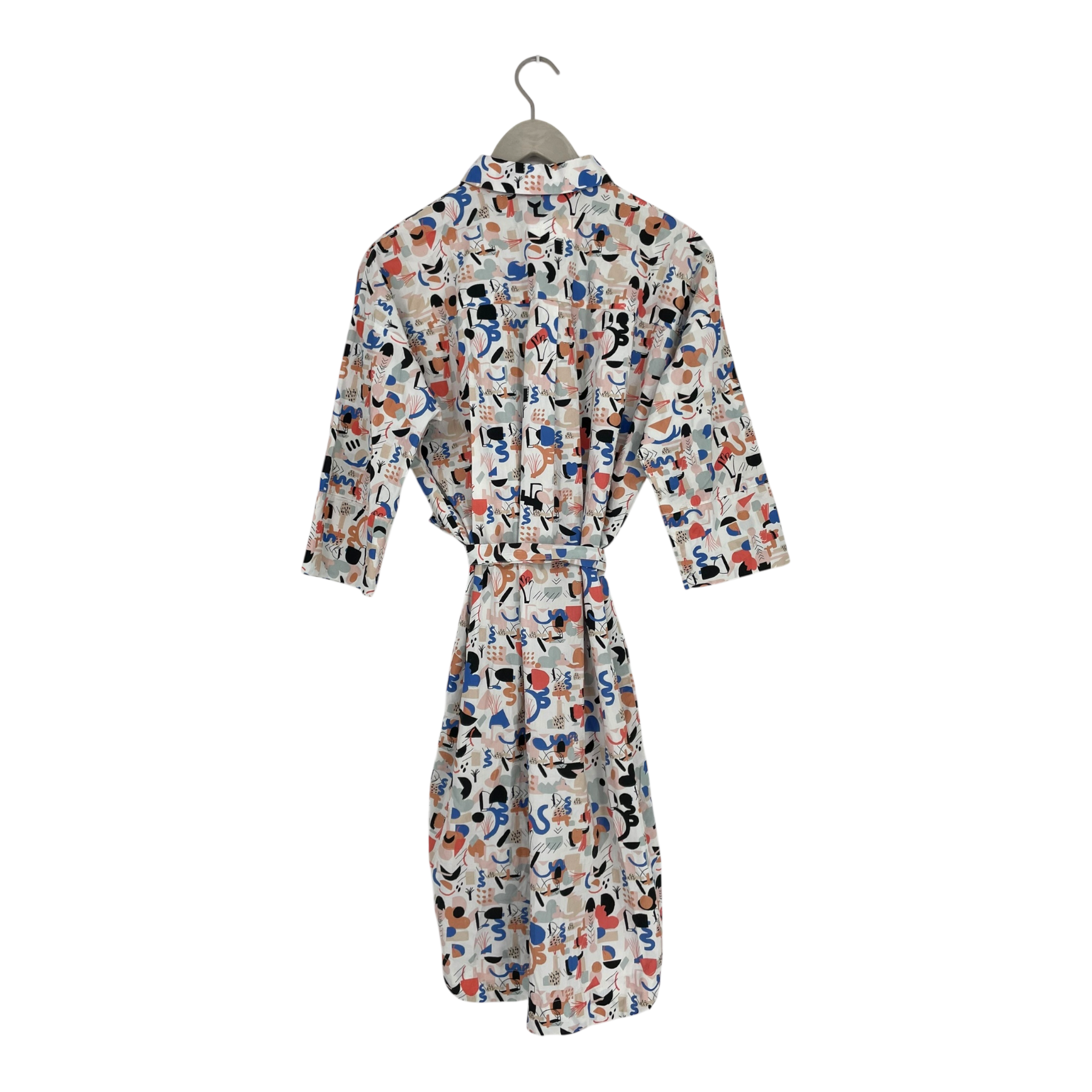 Papu women's woven buttoned dress with collar. Hidden buttons down the front, separate fabric belt. Uneven hem is longer from the back. 3/4 sleeves. Basic fit. The colours have faded somewhat.
