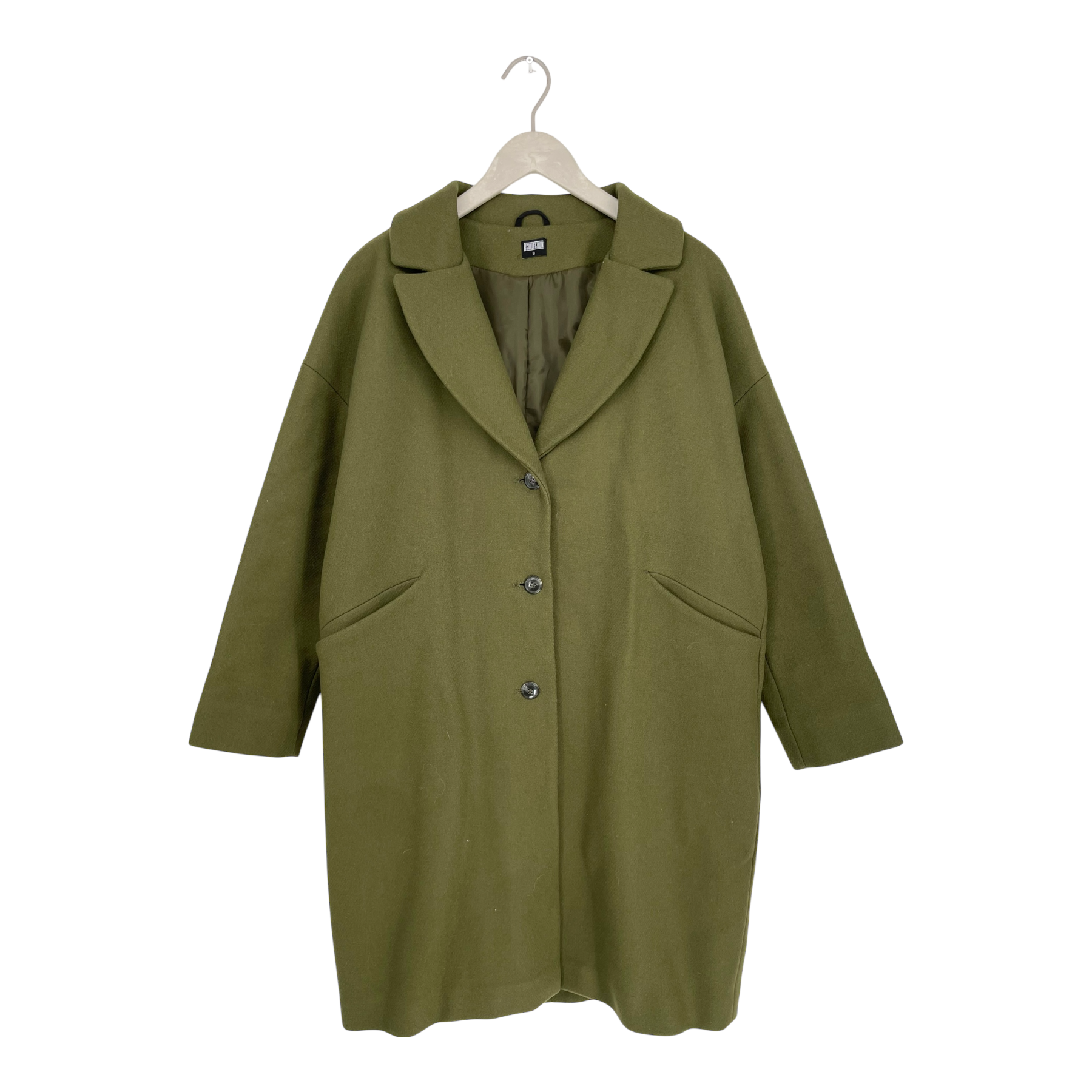 R-collection wool blend coat, with button closure, lining and pockets on the front.