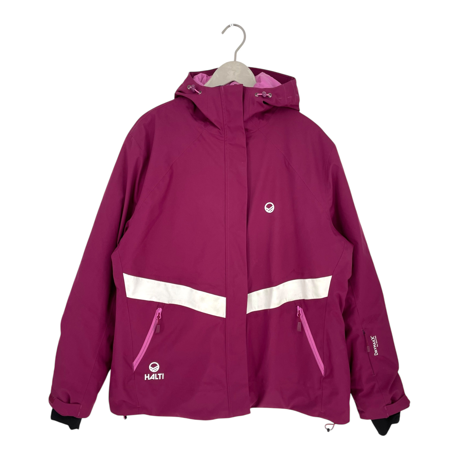 Halti Drymaxx skiing jacket with adjustable hood and side pockets. The jacket is wind and waterproof yet breathable. The jacket has a snow stoppers at the cuffs and waistline