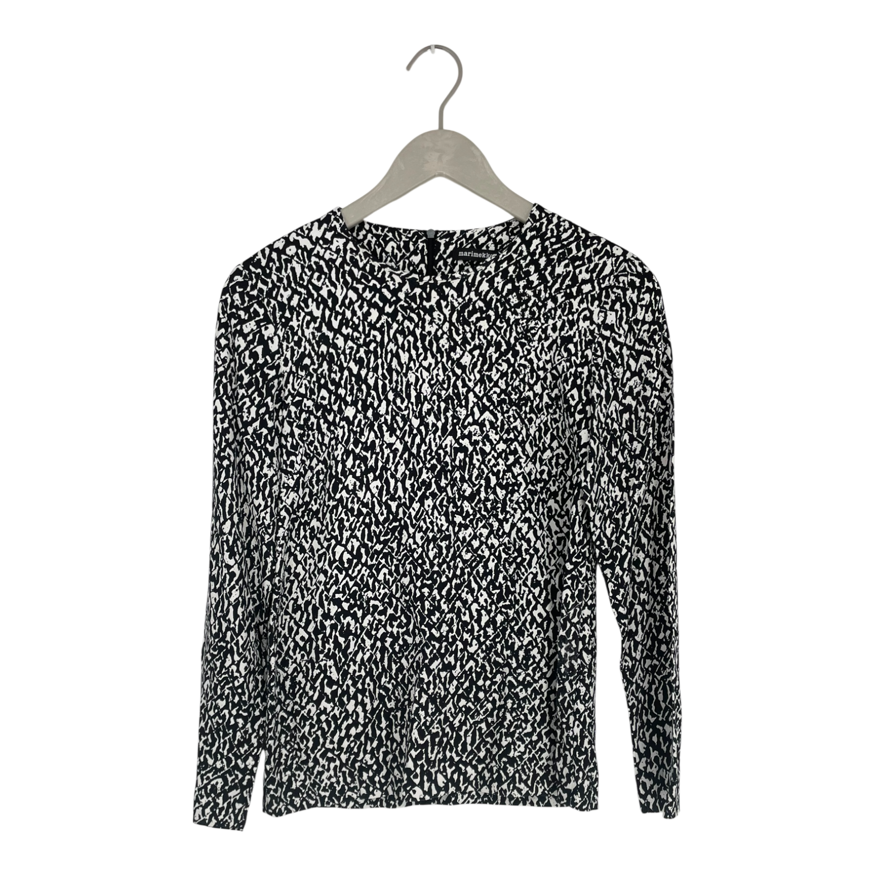 Marimekko long sleeve Amalia shirt in the abstract black and white Datsa design. Hidden zipper on the back. The shirt is form fitted and the fabric has no give.