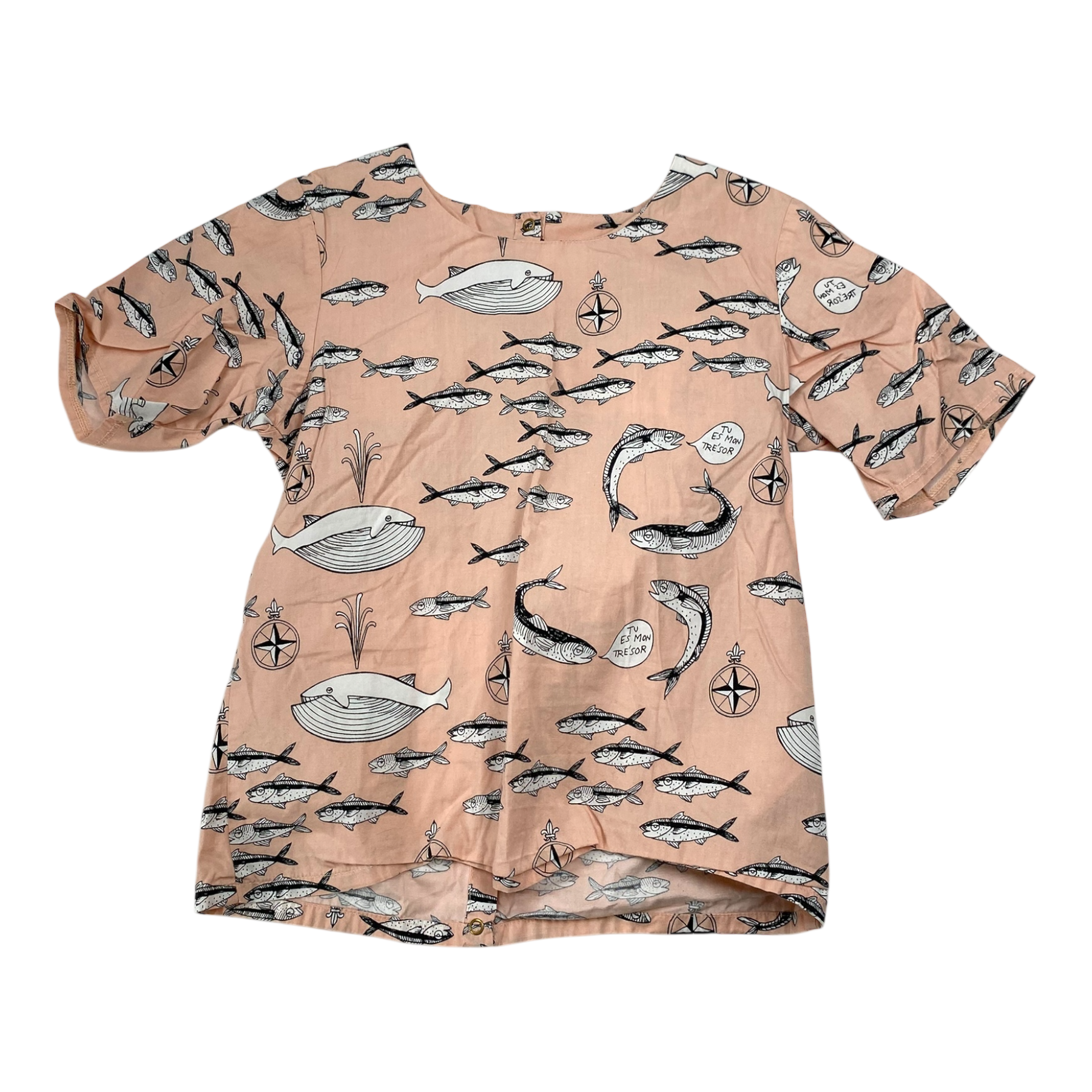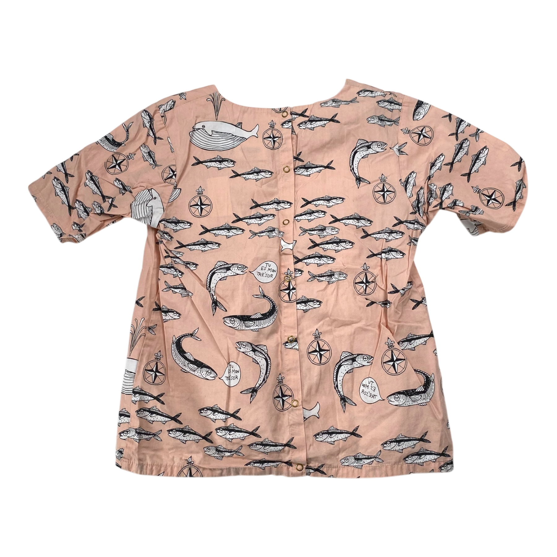 Mini Rodini woven dress with buttons in the back in fish print.