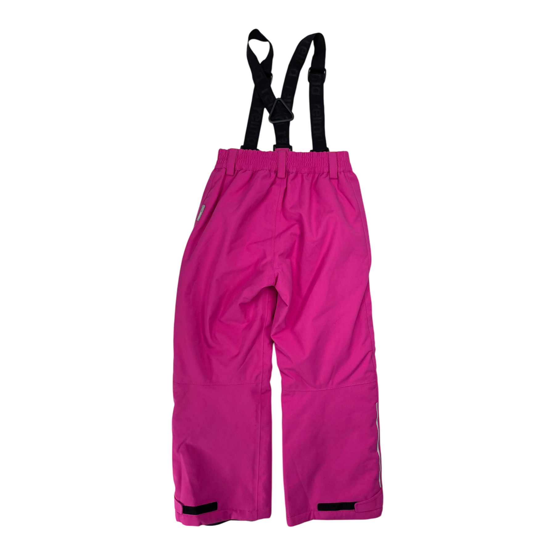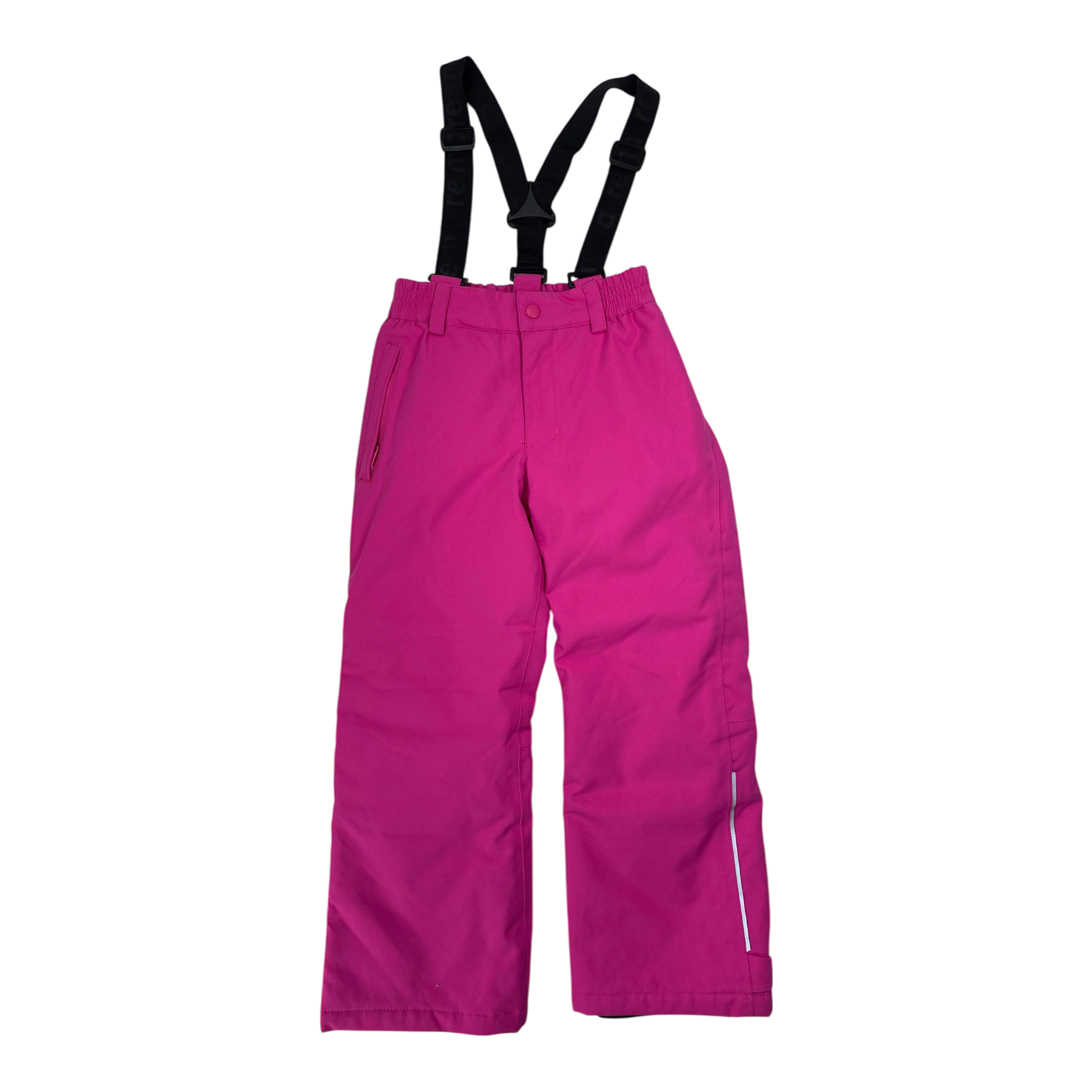 Reima Loikka outdoor pants with elastic and adjustable suspenders. Pants have a zip pocket, elastic waist, adjustable leg ends with snow locks.