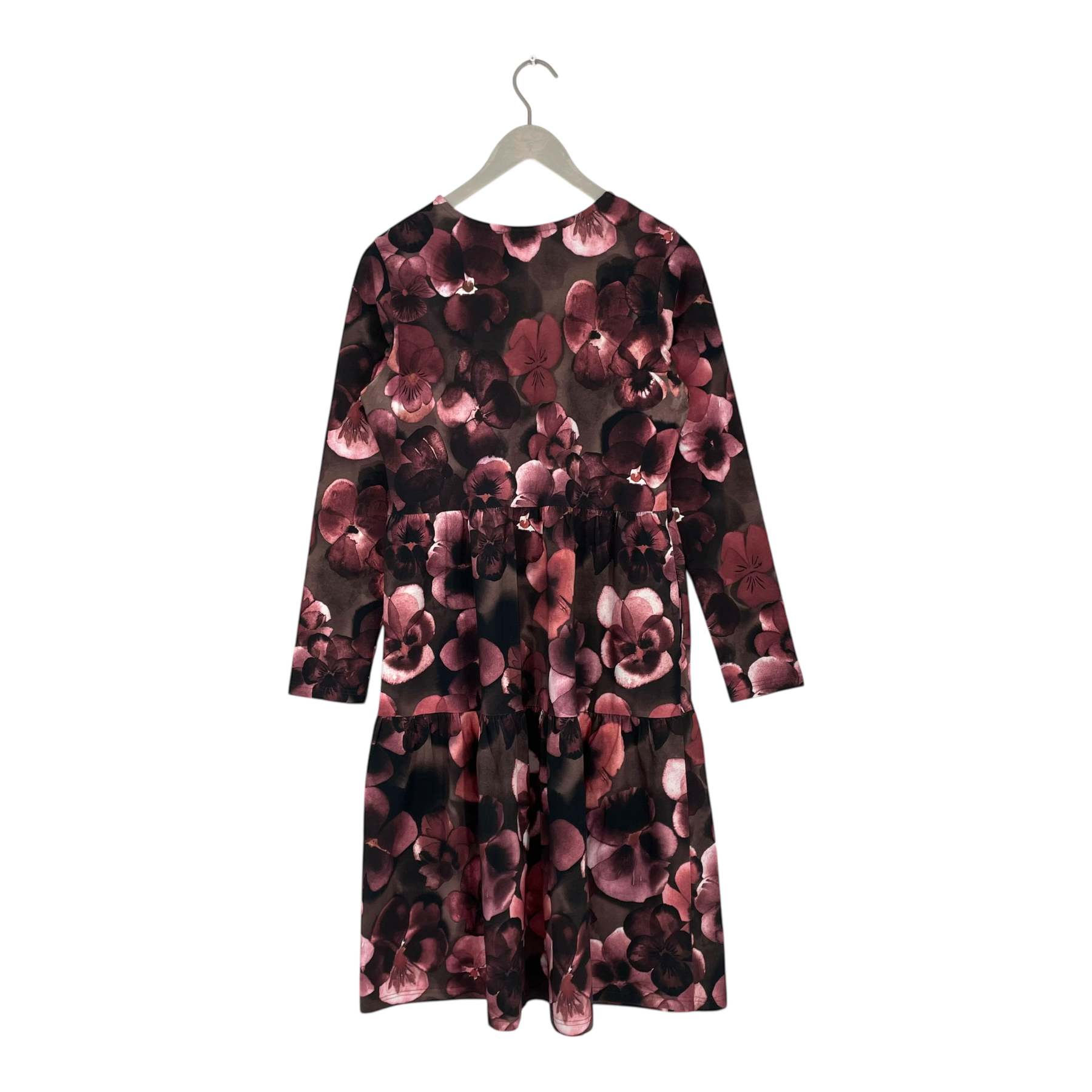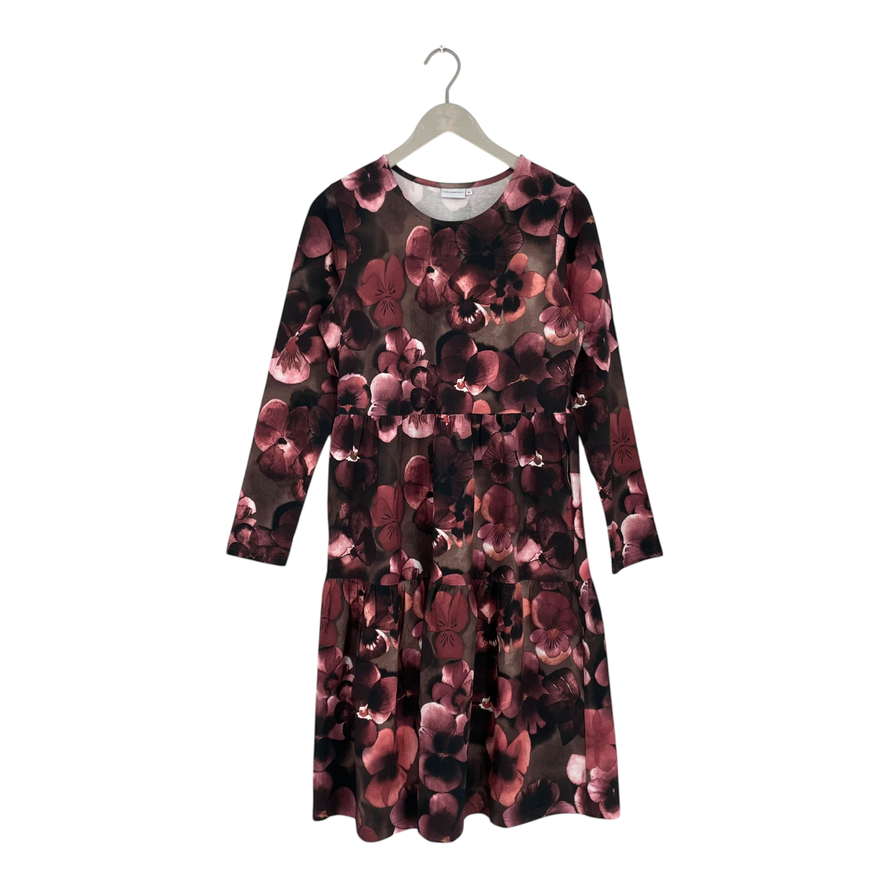 Versonpuoti frill tunic dress in a flower print. The dress has a V-neck, side pockets, long sleeves and a frilled hem.