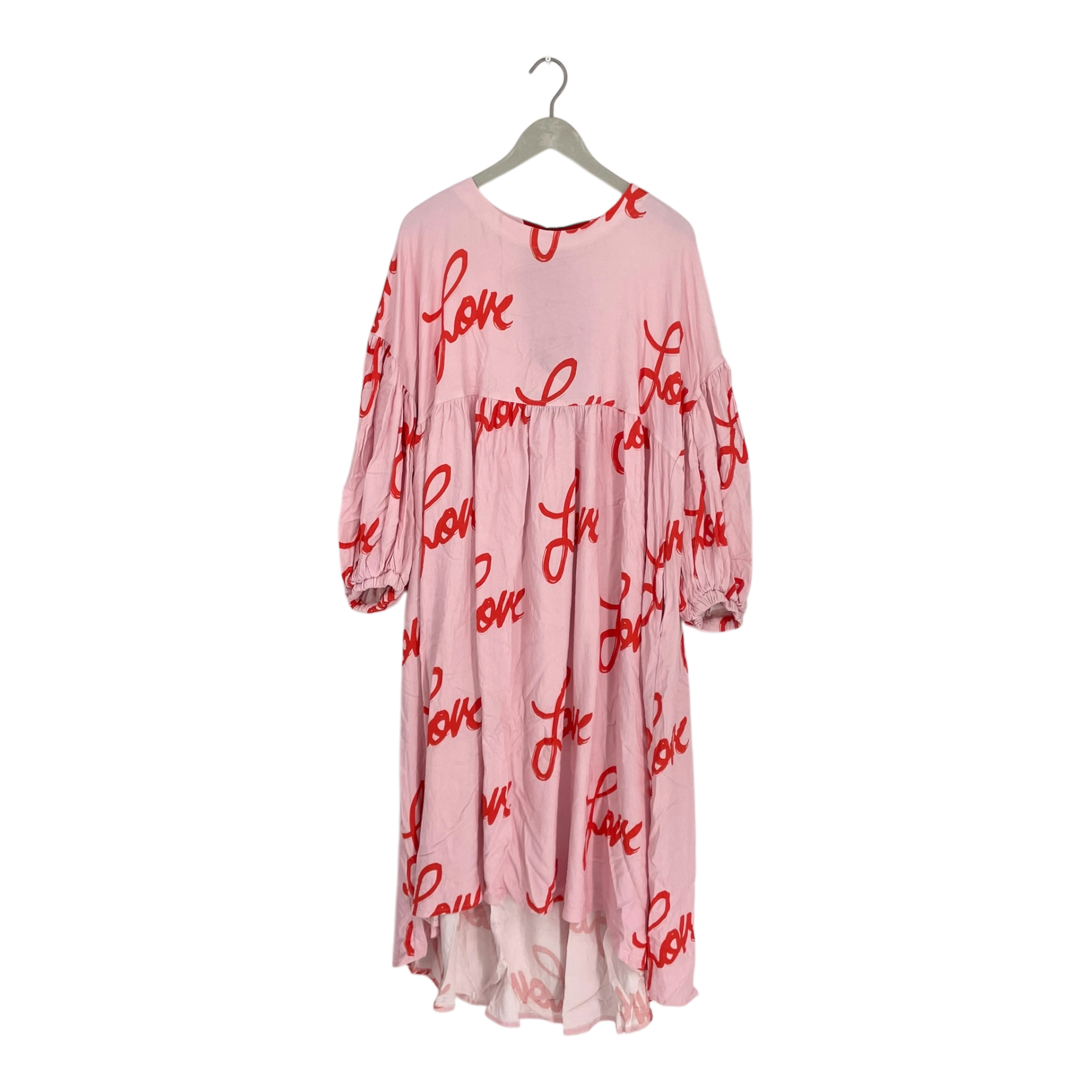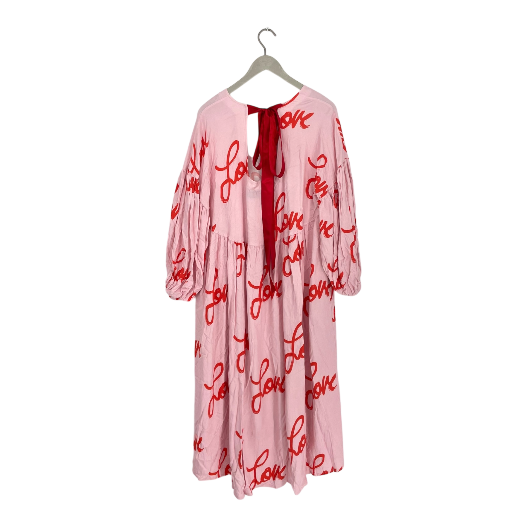 Vimma dress with a Love print is a maxi-length dress featuring voluminous puff sleeves and an A-line skirt. The dress includes practical side pockets on both sides. A striking detail at the back is a red satin ribbon used to close the dress, adding a beautiful and distinctive finishing touch.