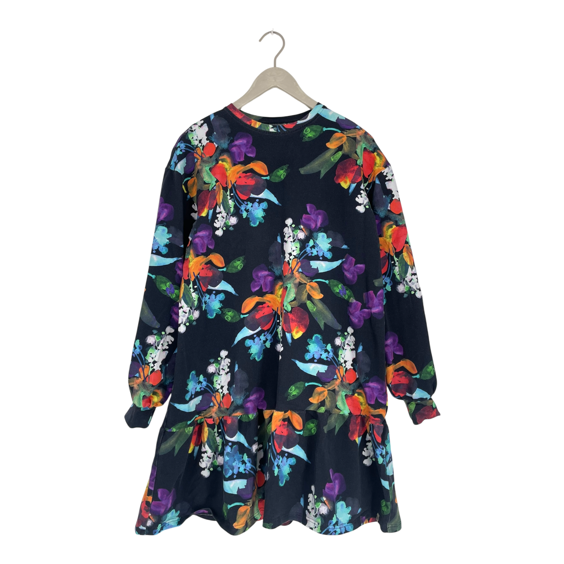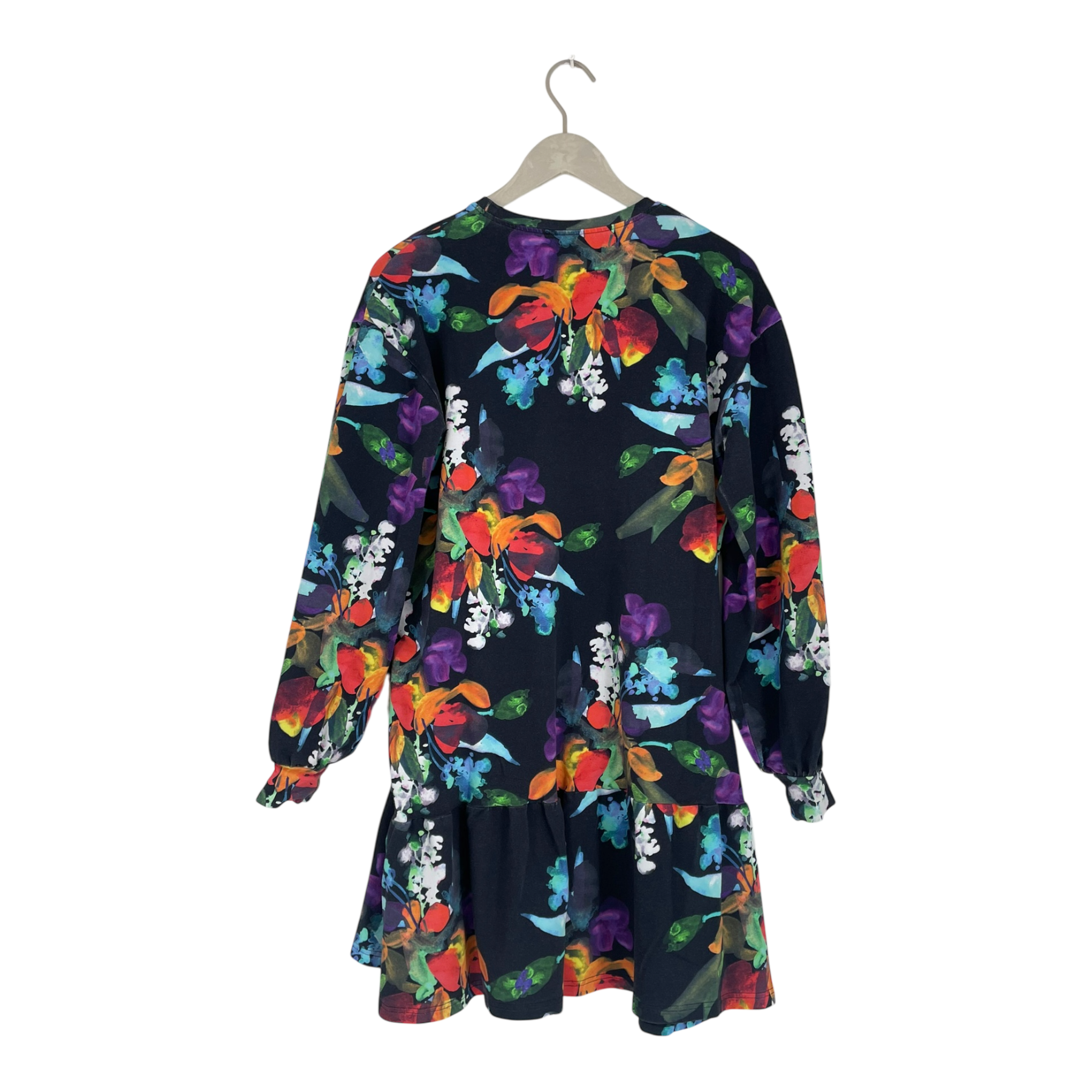 The Ruffle Sweatshirt Dress is made from wonderfully soft organic cotton stretch sweatshirt jersey. The dress features a relaxed oversized fit, a slightly shorter hem length, dropped shoulders, long sleeves, and a playful ruffle trimming the hem. The print is called Bouquet, bursting with lush floral bunches. The flowers come in vibrant shades of red, purple, blue, and white. A deep navy background enhances the brightness of the colors, making the print both striking and delightful