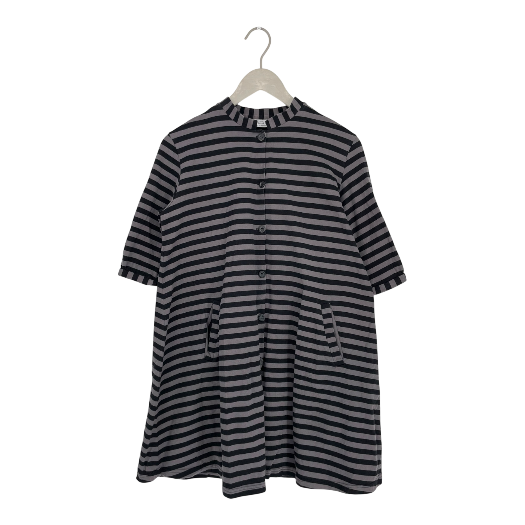 Marimekko fully buttoned tunic with half sleeves, round stand up collar and two open pockets on the front. Signs of wear and pilling on the armpits as shown in the pictures.