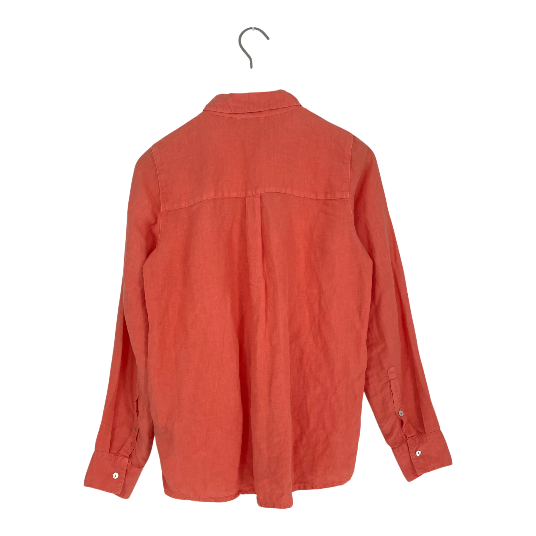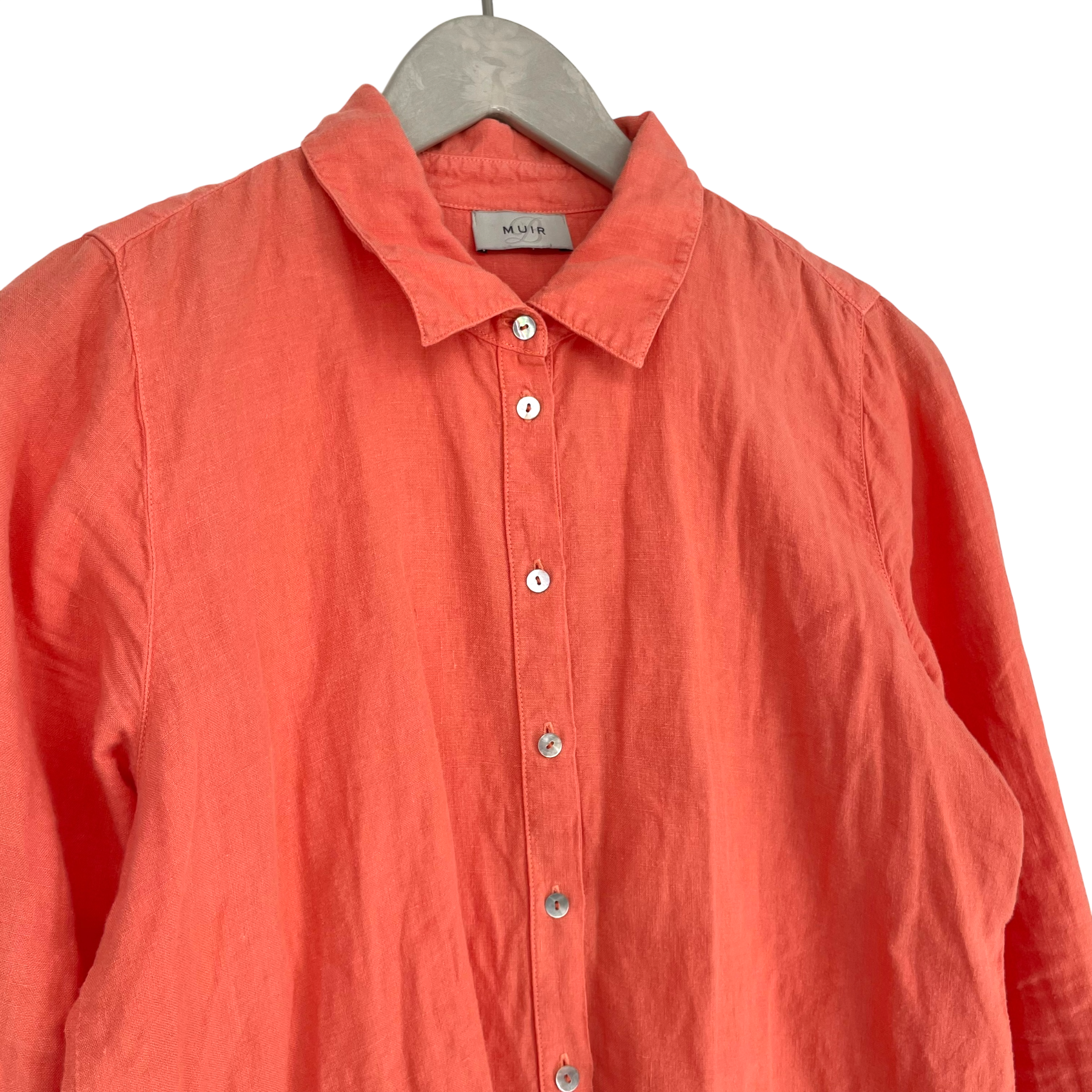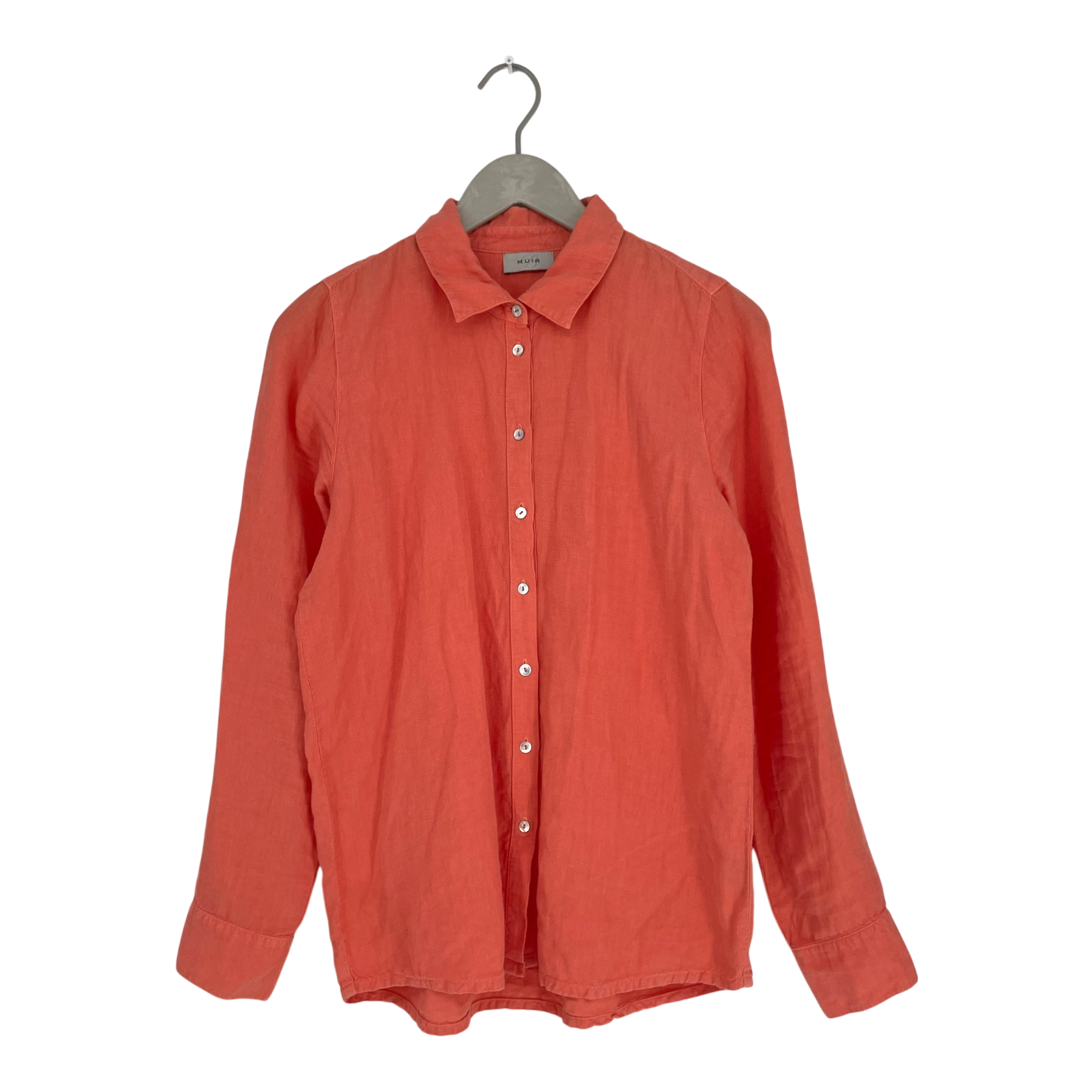 Balmuir women’s classic linen shirt. The shirt has a button closure at the front and buttons on the cuffs. The item is otherwise in good condition, but the fabrics color has faded in the wash.