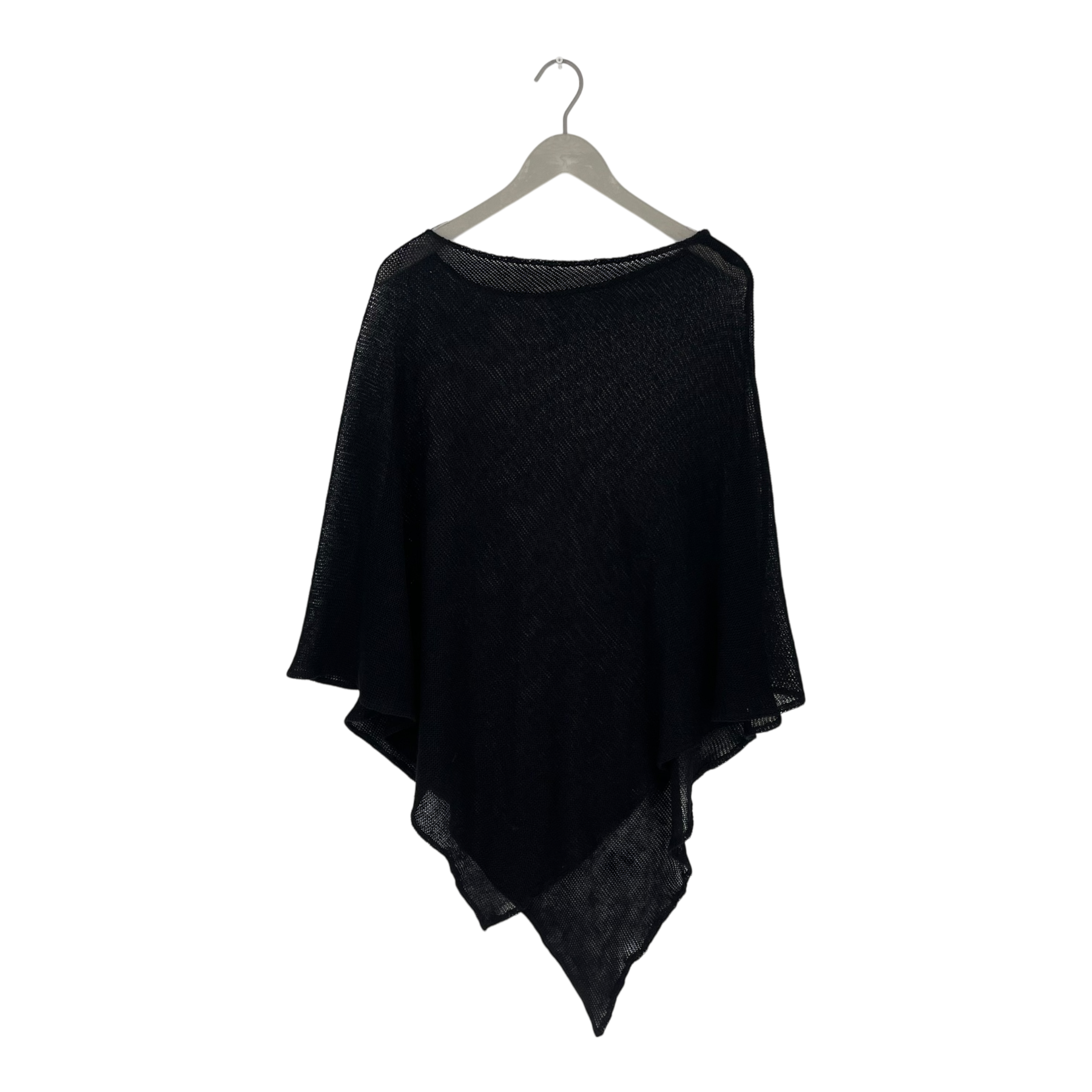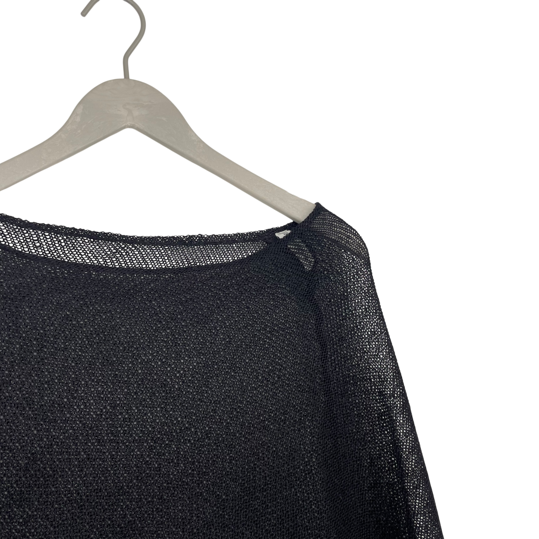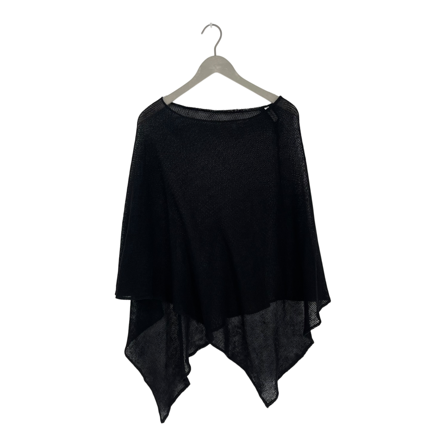 Bypias fine knit poncho. This piece features a loose, open-knit construction, a wide boat neckline, and an asymmetrical hemline that creates a cascading drape.It can be worn so, that the longer sides come on the front or that the longer sides are on top of the arms.