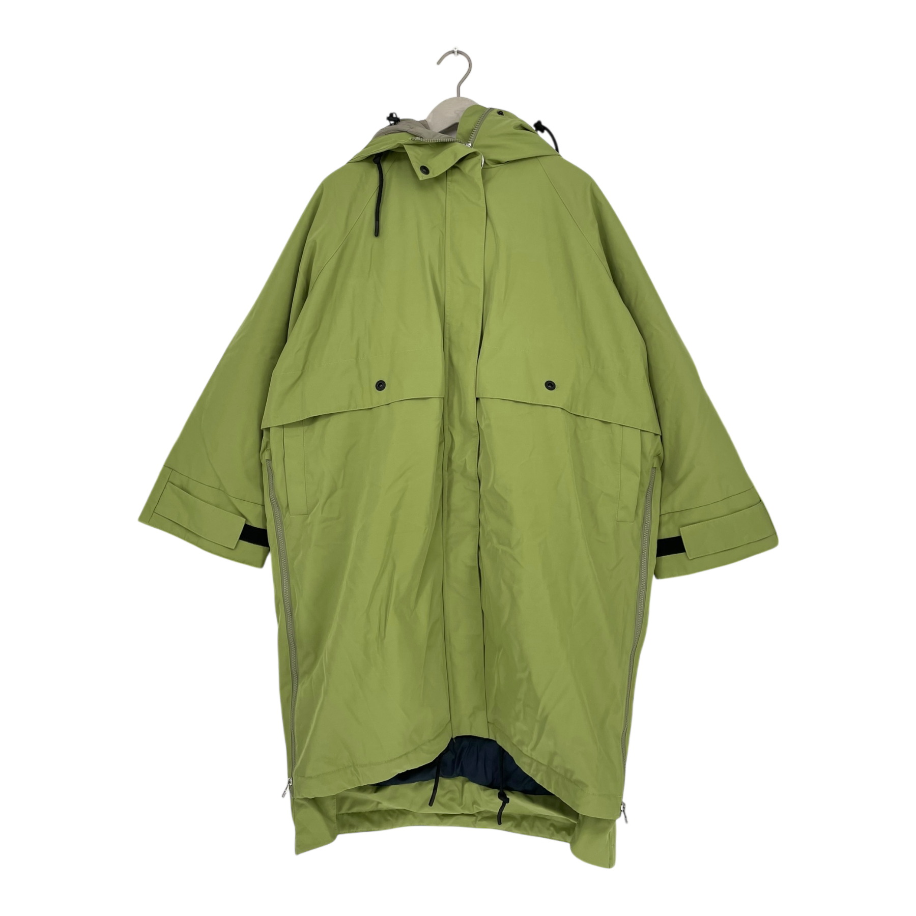 When mod and samurai collide. This oversized parka has adjustable kimono-style sleeves, a double-layered hood made from crushed nylon and extra deep pockets. It’s waterproof, recycled outdoor fabric and no-down inner have you covered.