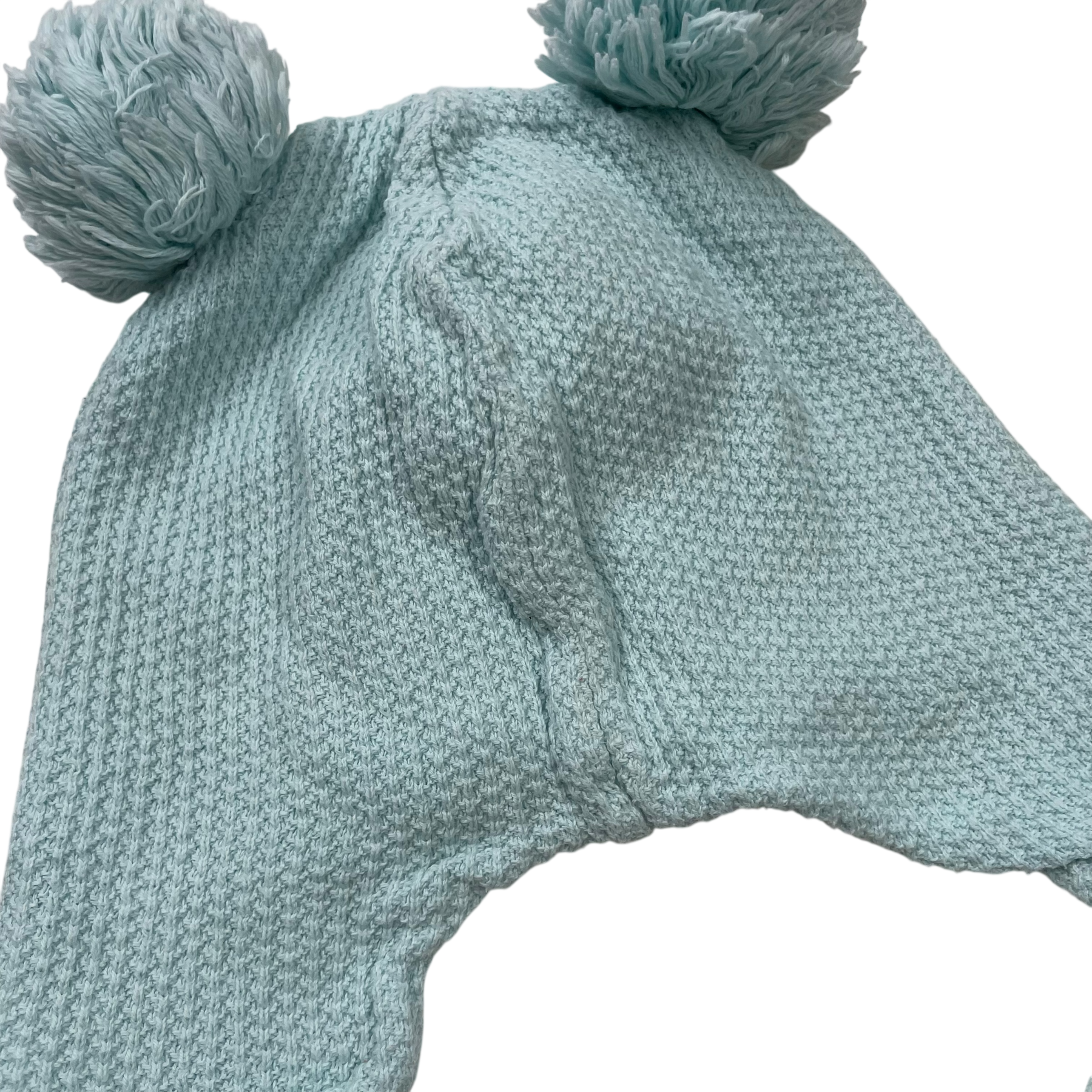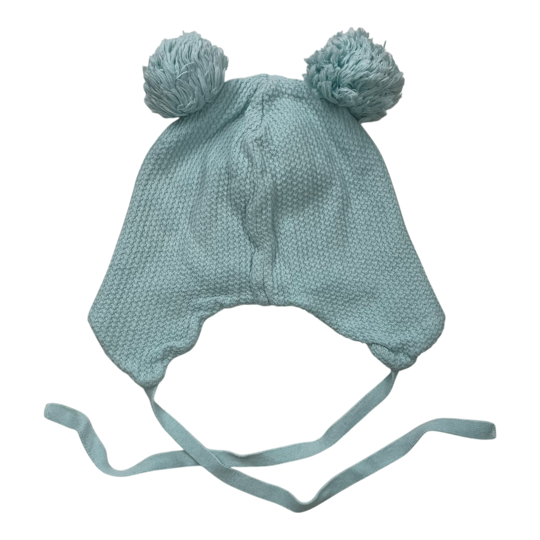 Gugguu cotton knitted beanie with two poms and strings to tie with.