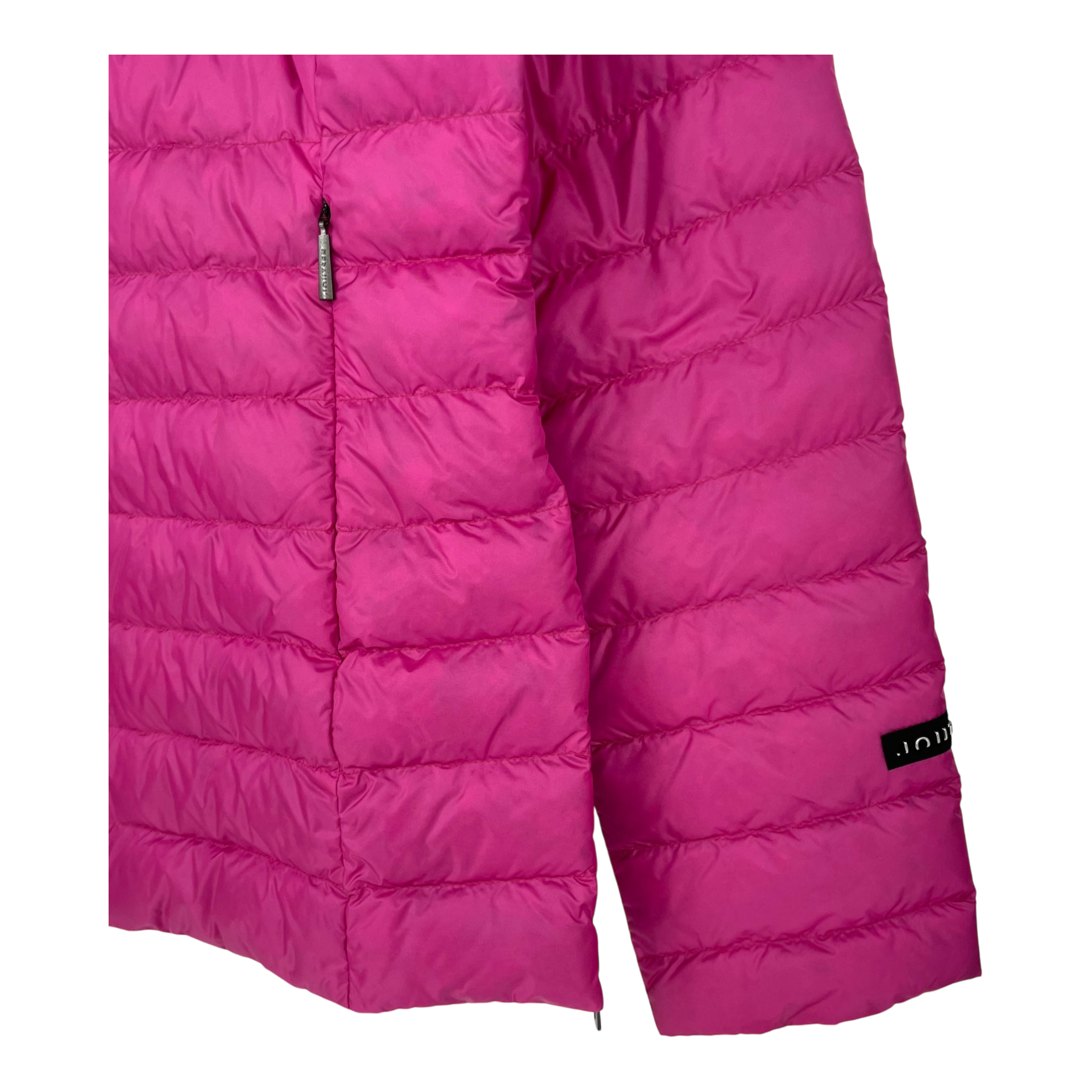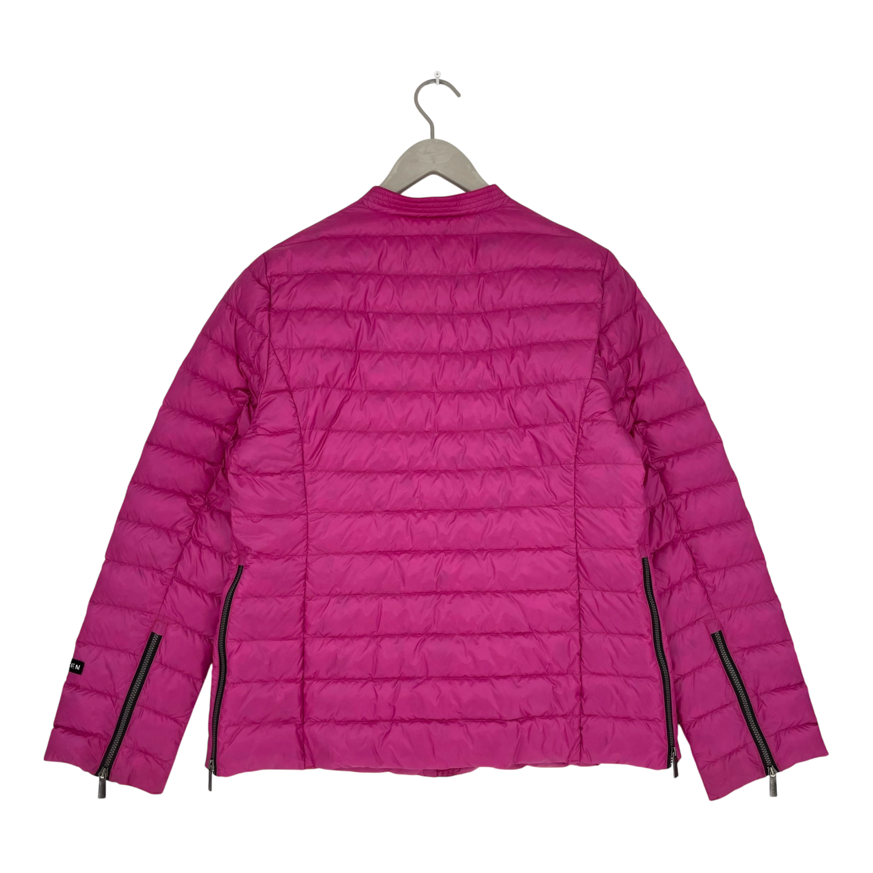 Horizontally stitched women's biker style lightweight down jacket. The jacket has zipper slits in the side seams and cuffs. Small stand-up collar and zippered pockets. Functional two-way zipper for added comfort.