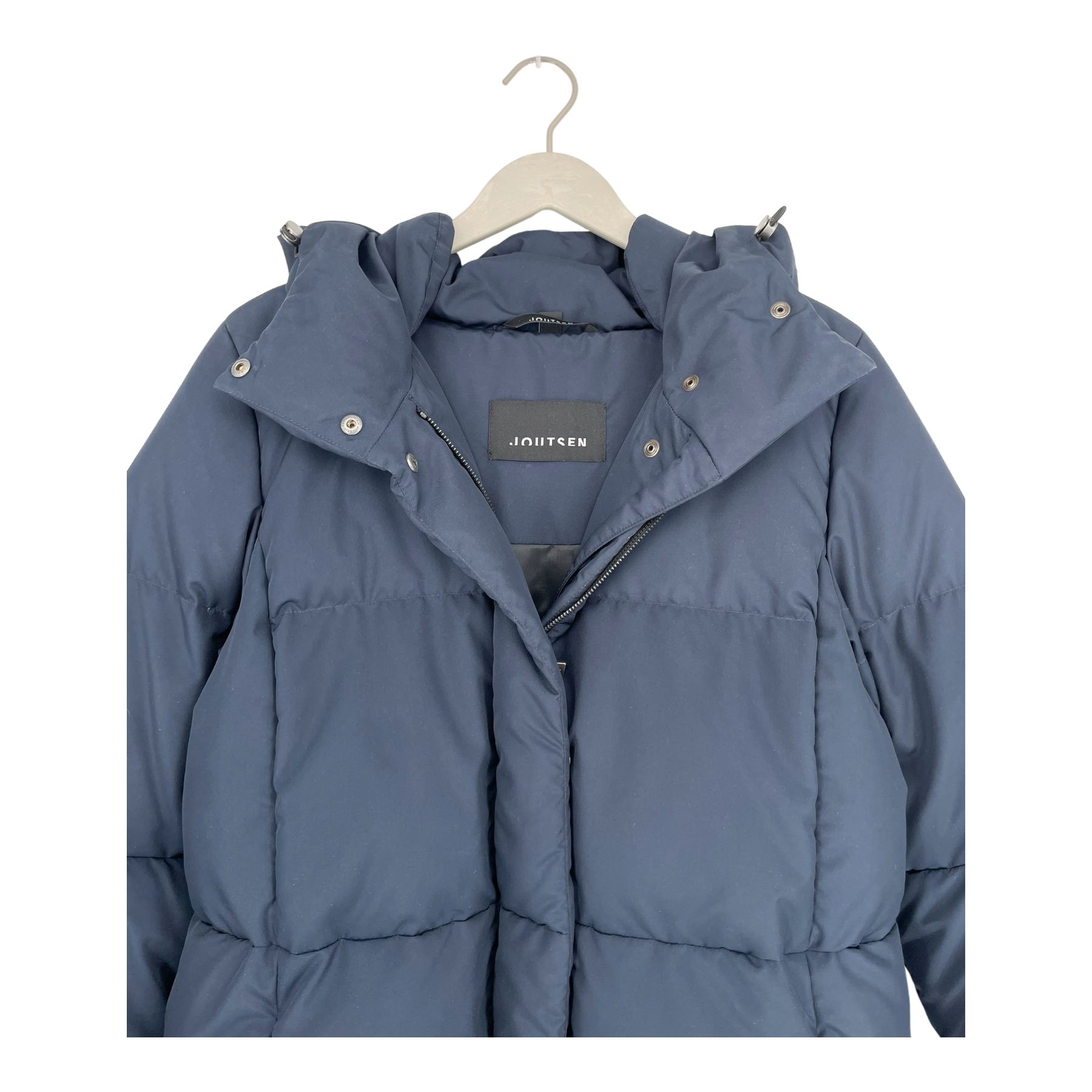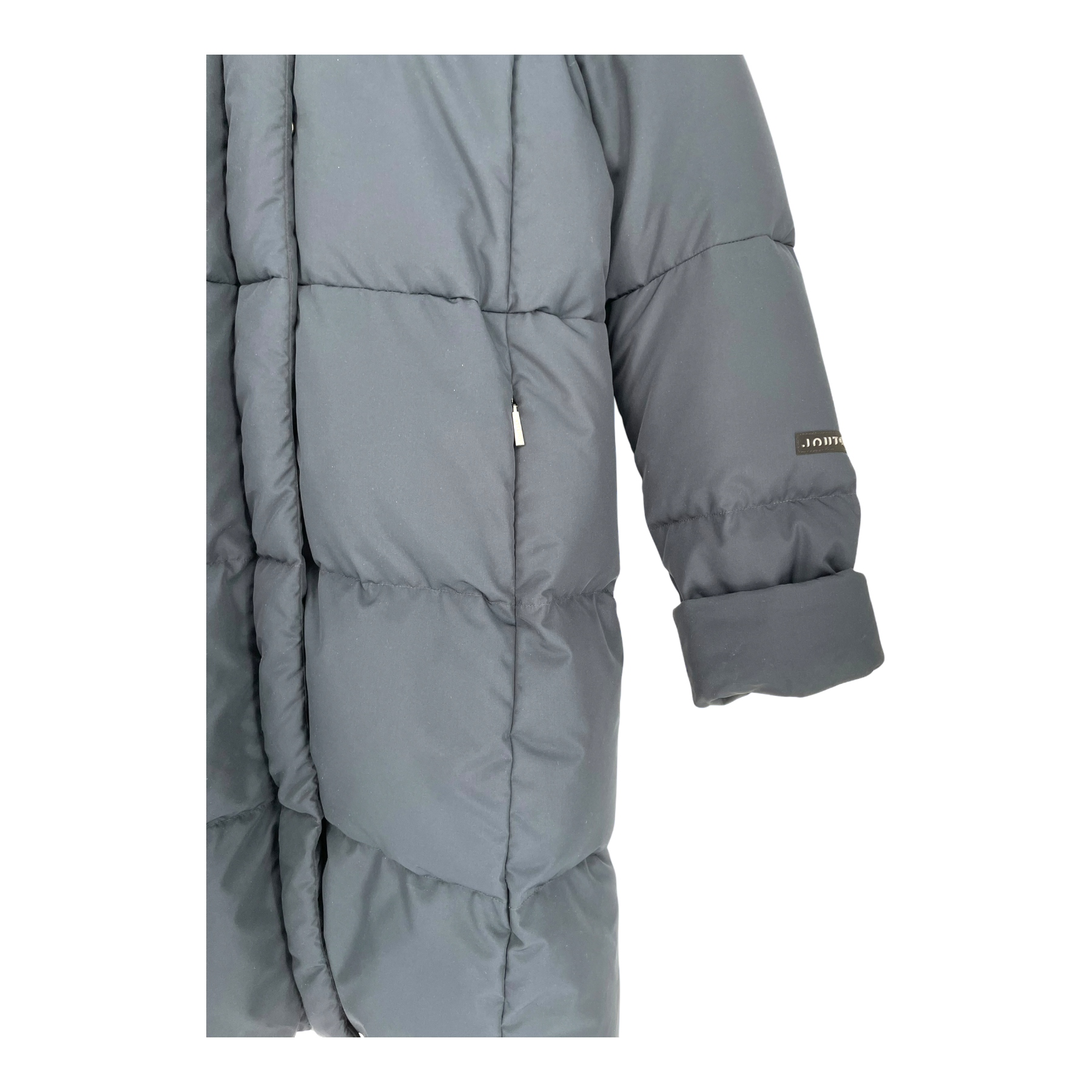 Joutsen Viti jacket is a down jacket perfect for the colder weathers. There is a large horizontal stitching and two sealed side pockets with zippers. The snap buttons and the double-slider fastening zipper adds comfortability and daily functionality in the front. The jacket has a stand up collar and a large adjustable warm hood that can be worn up or down according to weather and the sleeves can be rolled up for a better fit.