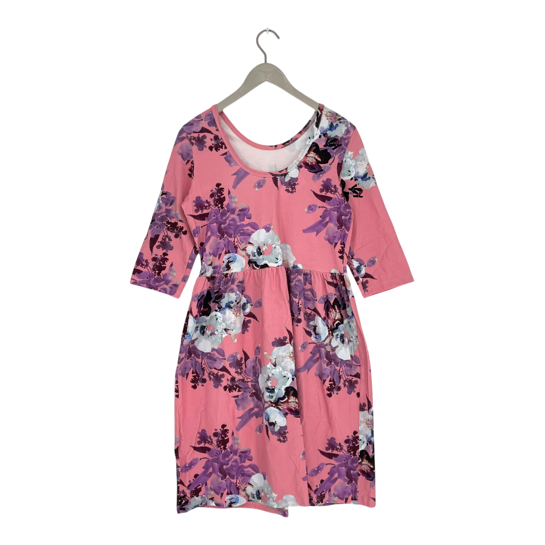 Kaiko Bell dress in Garden rose print. The dress has 3/4 -length sleeves and a flared neckline at the back. The length of the hem is approximately knee-length.