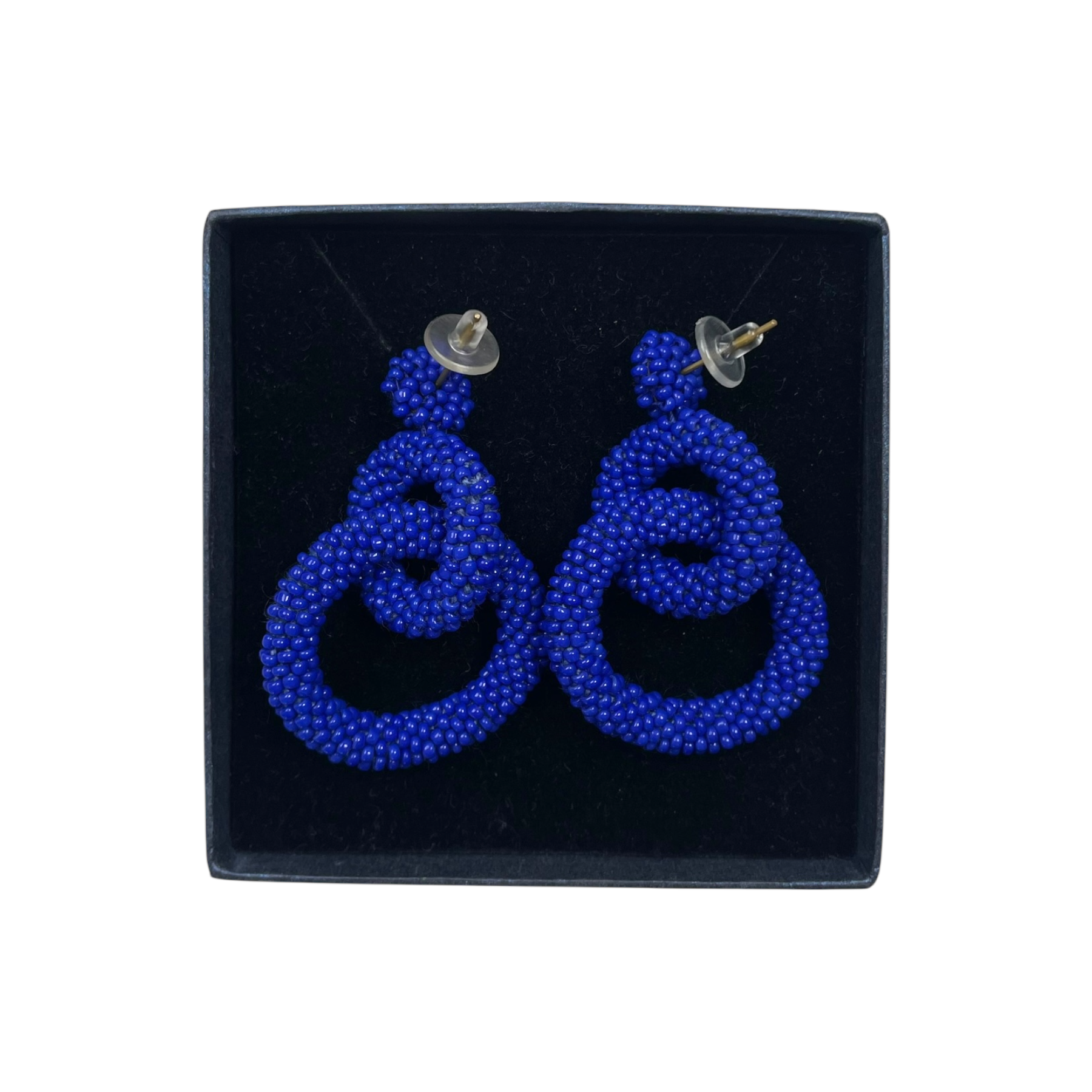 Kaiko handmade earrings with blue glass beads and brass hardware, which is nickel free. The length of the earring is about 6cm. The come in their own original box.