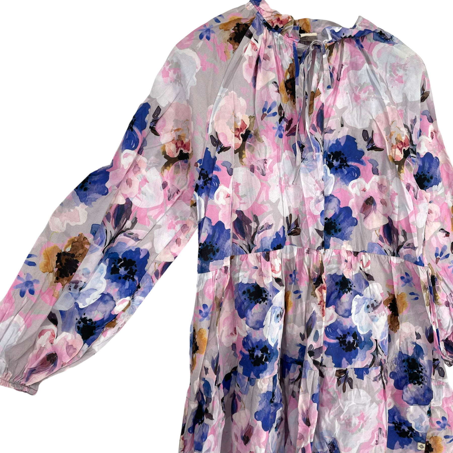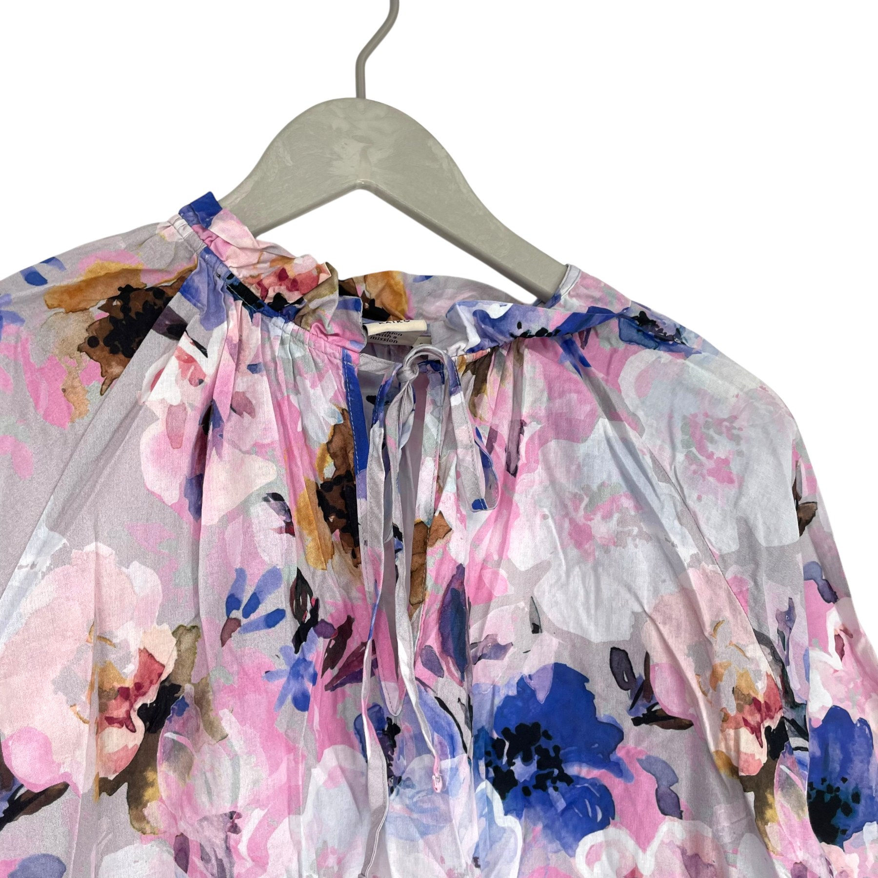 Kaiko adults' voluminous tunic with long sleeves, ruffled neckline, elastic waistband at the end of the sleeves and a slit in the front of the neckline. The dress is a bit see-through.