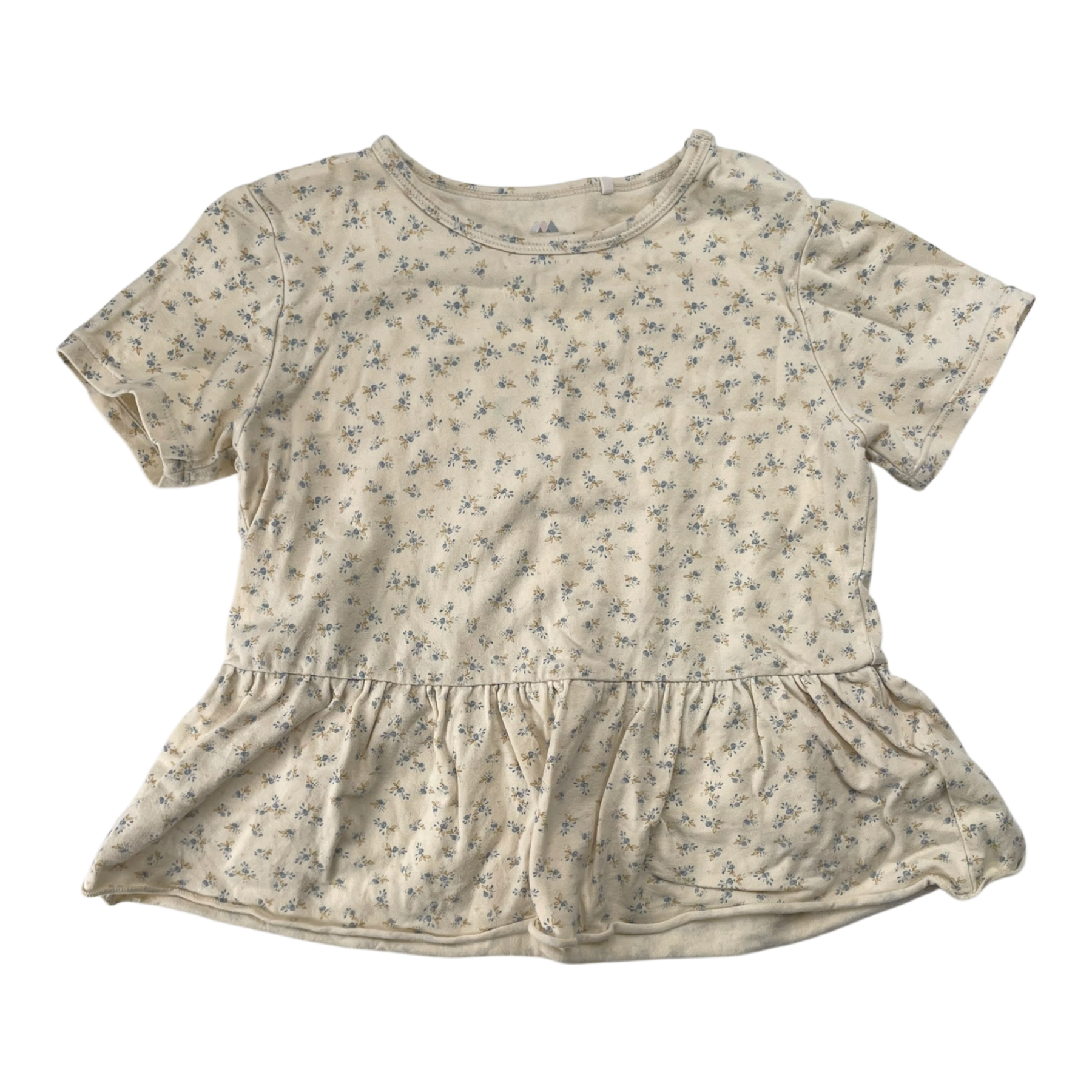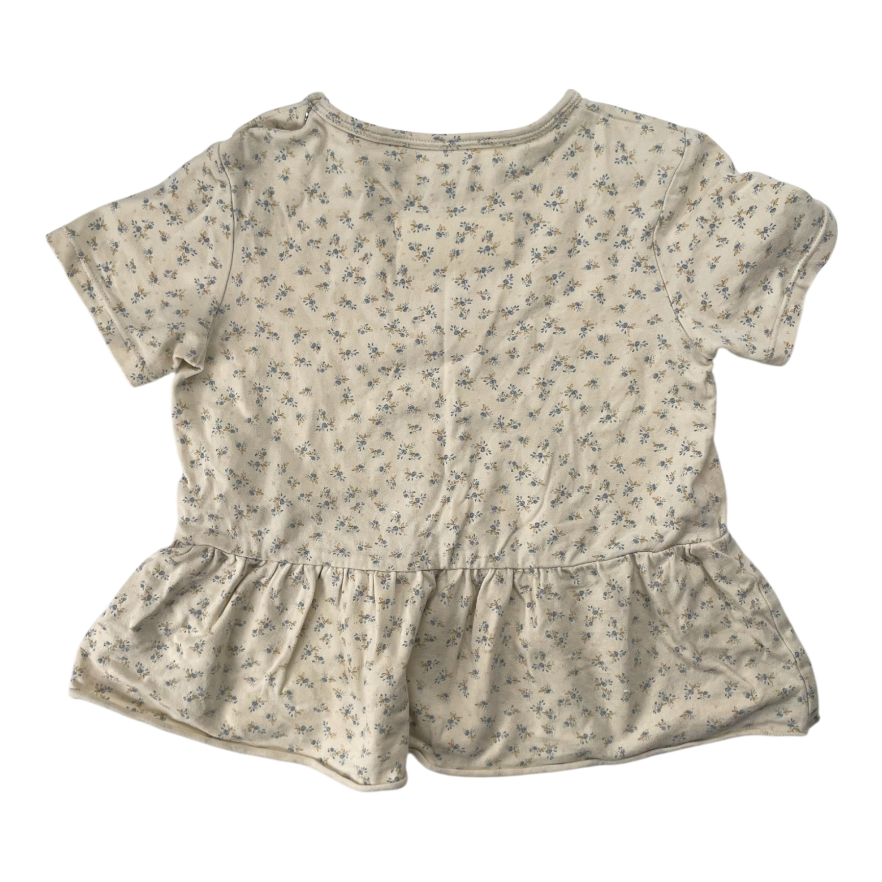 Konges Sløjd t-shirt with a skirt hem and snap buttons. on the shoulder. There are two tiny stains that blend very well into the flower print.