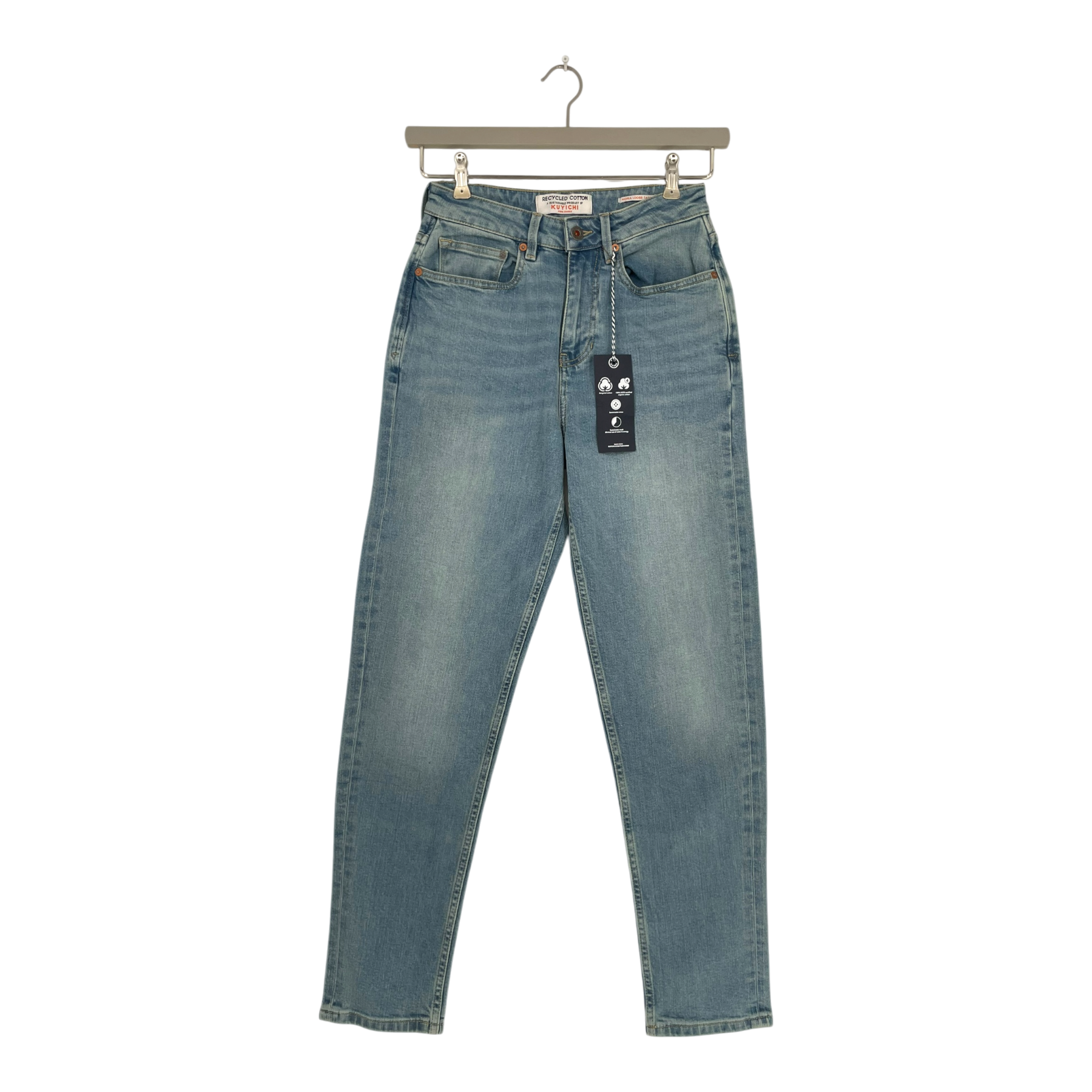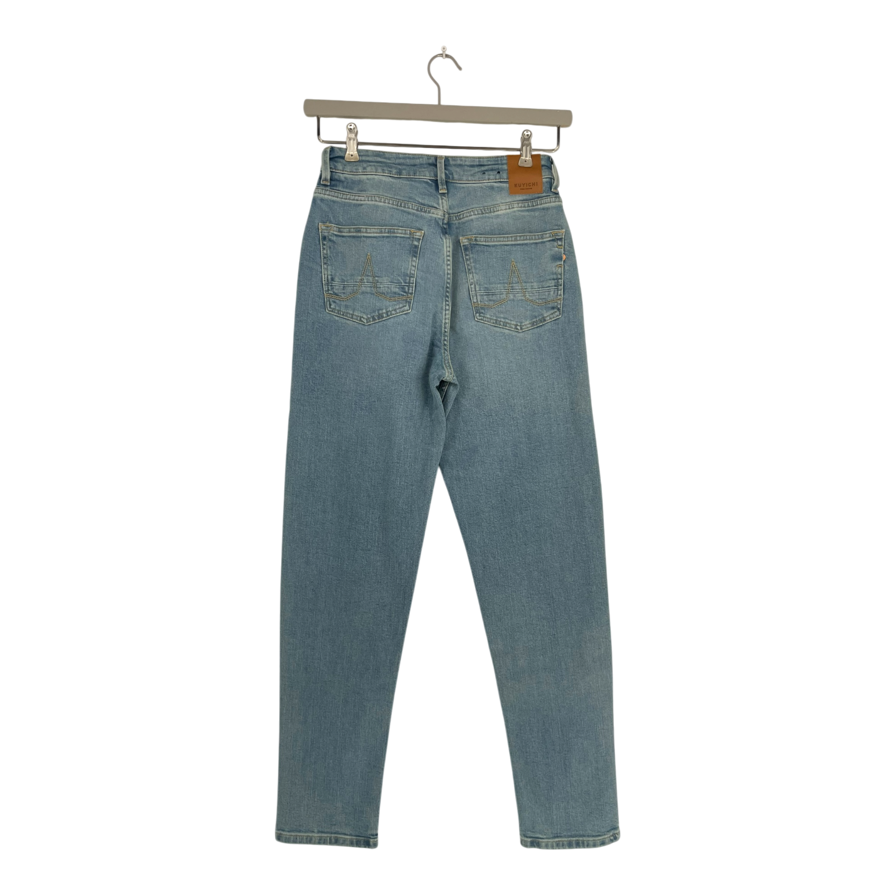 Kuyichi Nora Loose Tapered high-waisted straight-leg jeans in light blue wash. Classic five-pocket styling with button and zip closure.