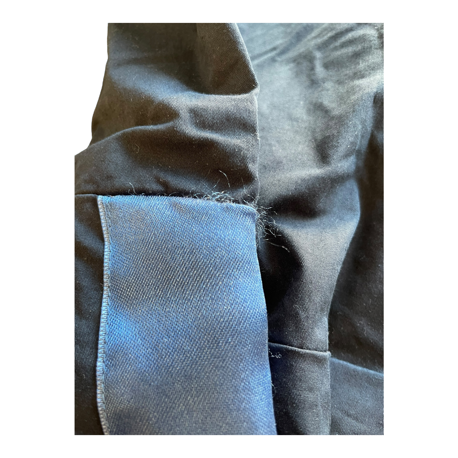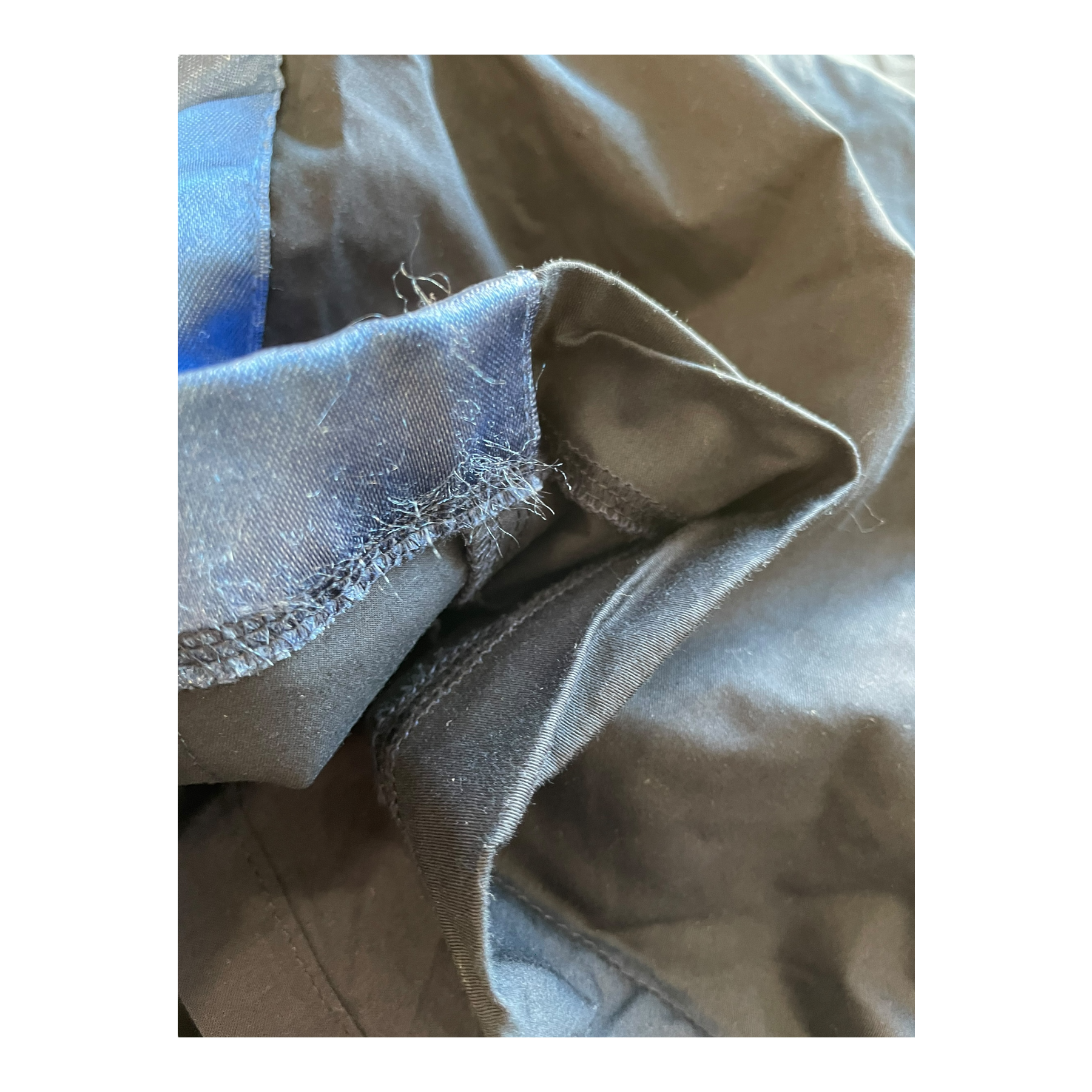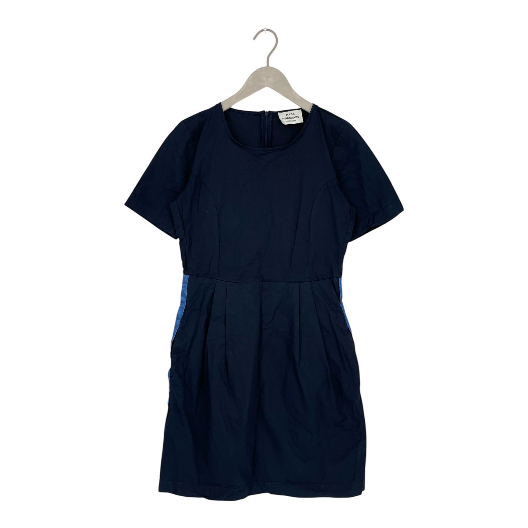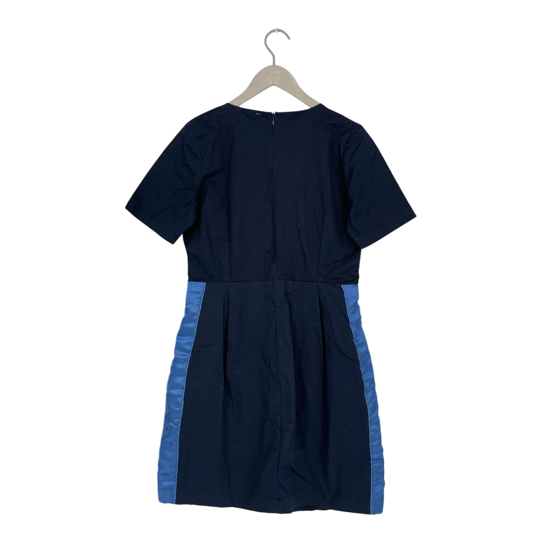 The Mads Nørgaard Crispy twill deily business dress has short t-shirt sleeves, a form fitted bodice with shaping seams and blue accent strips on the sides. The item also has darts on the waist, side seam pockets and a hidden zipper on the back. The item has some wrinkles and a few imperfections on the seams and pulls of thread, as shown in the pictures.