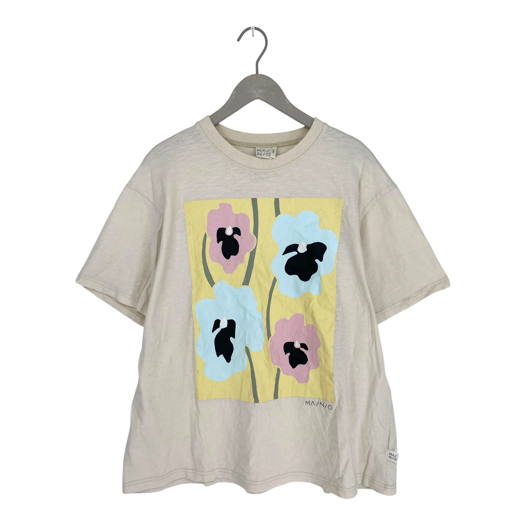 Mainio t-shirt with flower logo on the front.