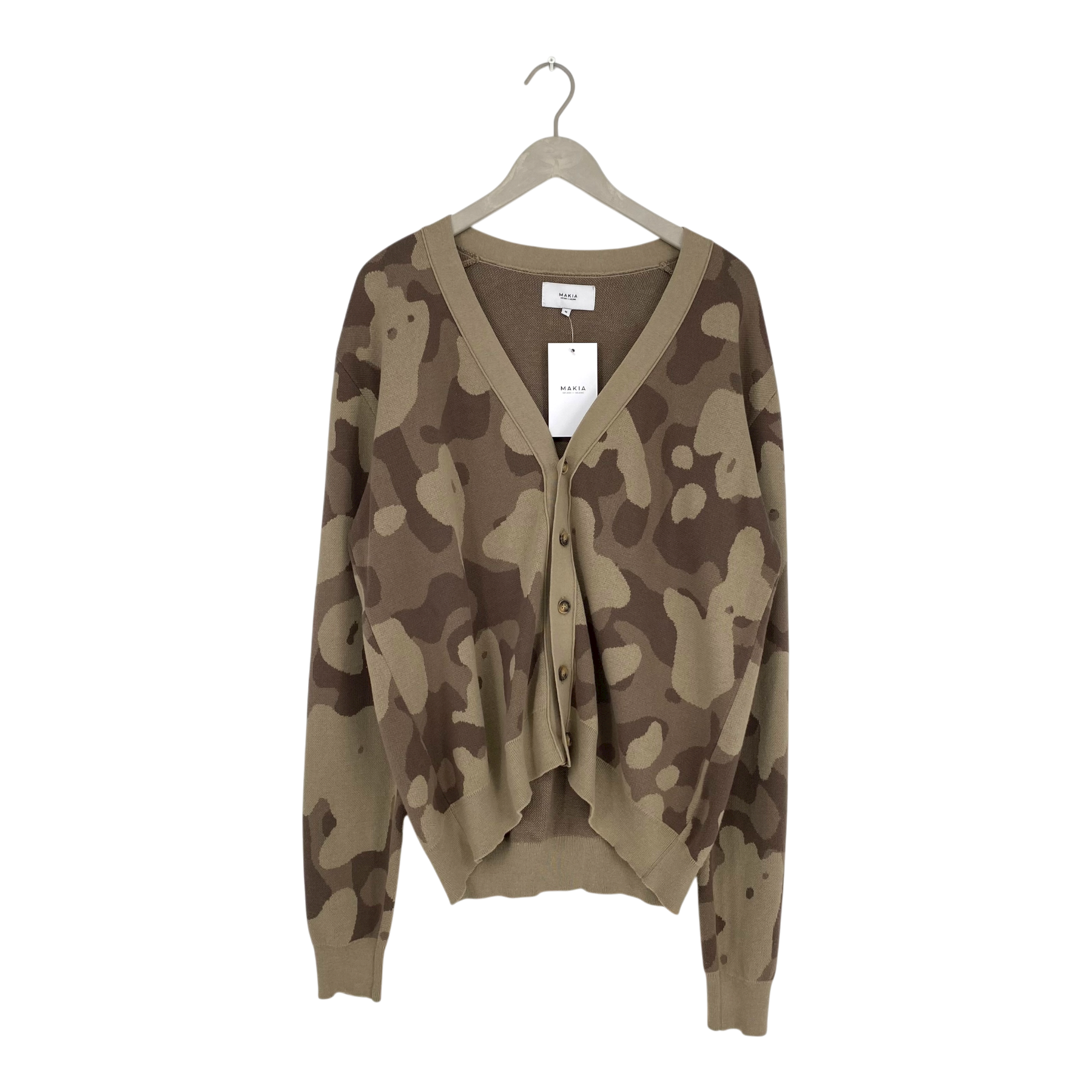 Makia Offshore v-neck cardigan with buttons in the front in camo style print.