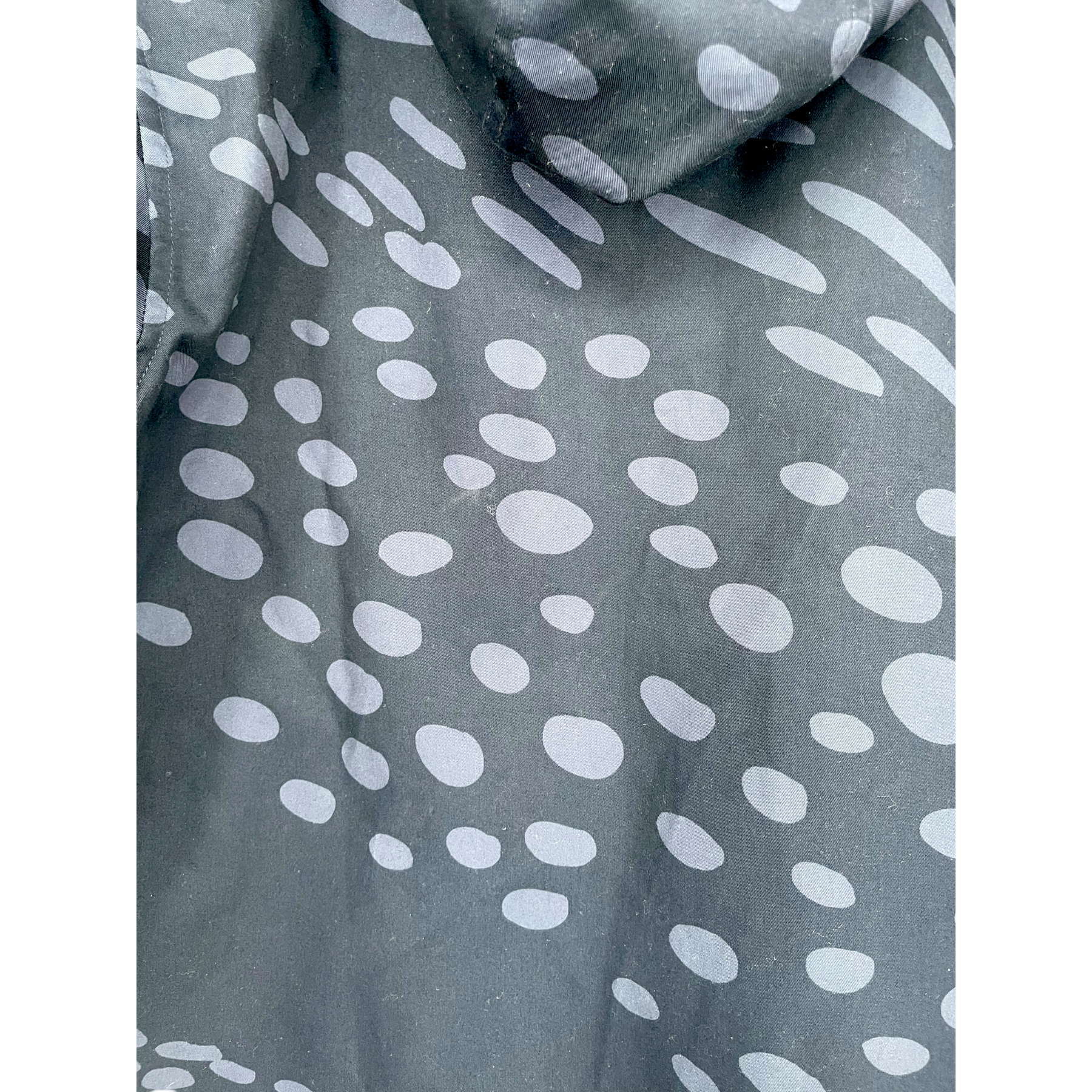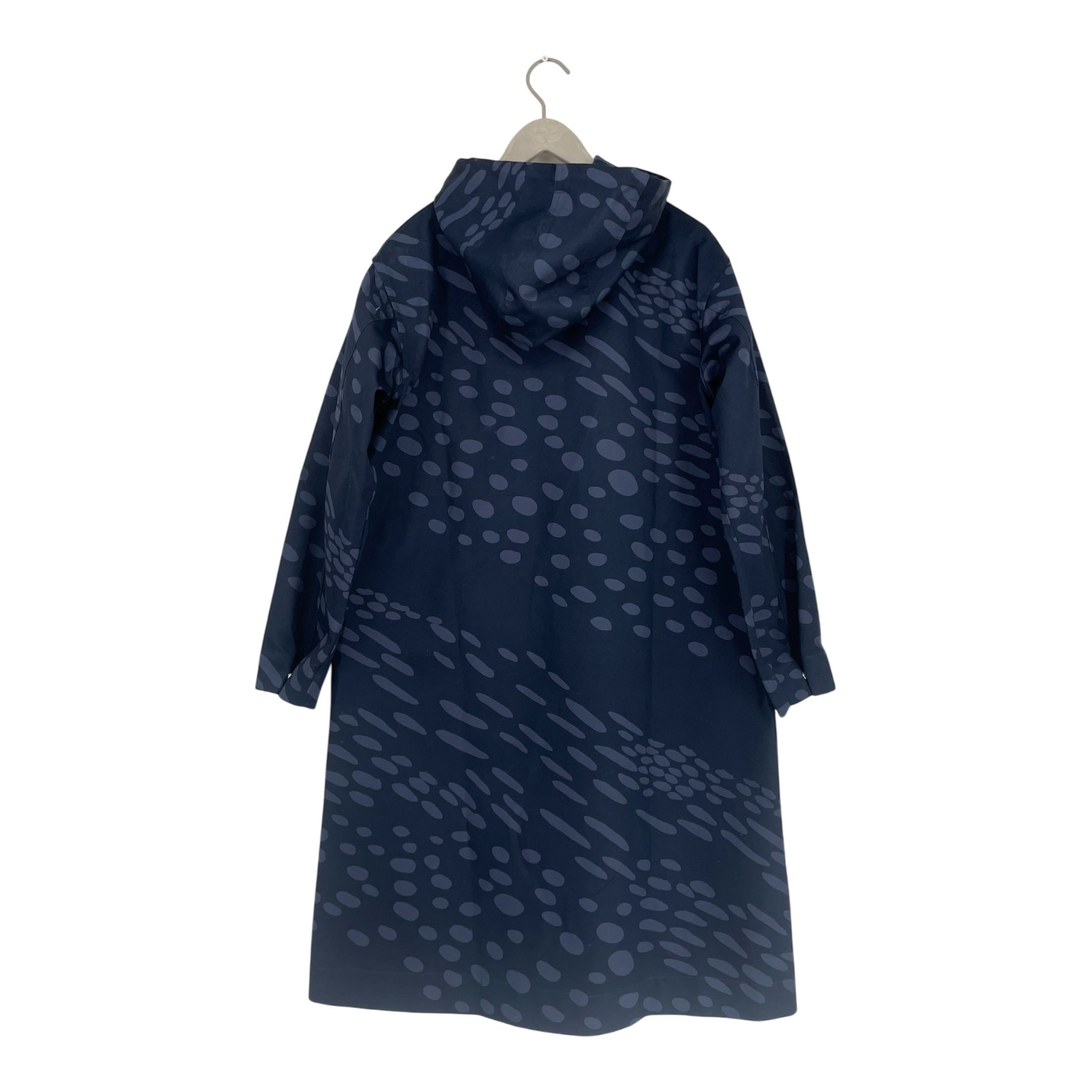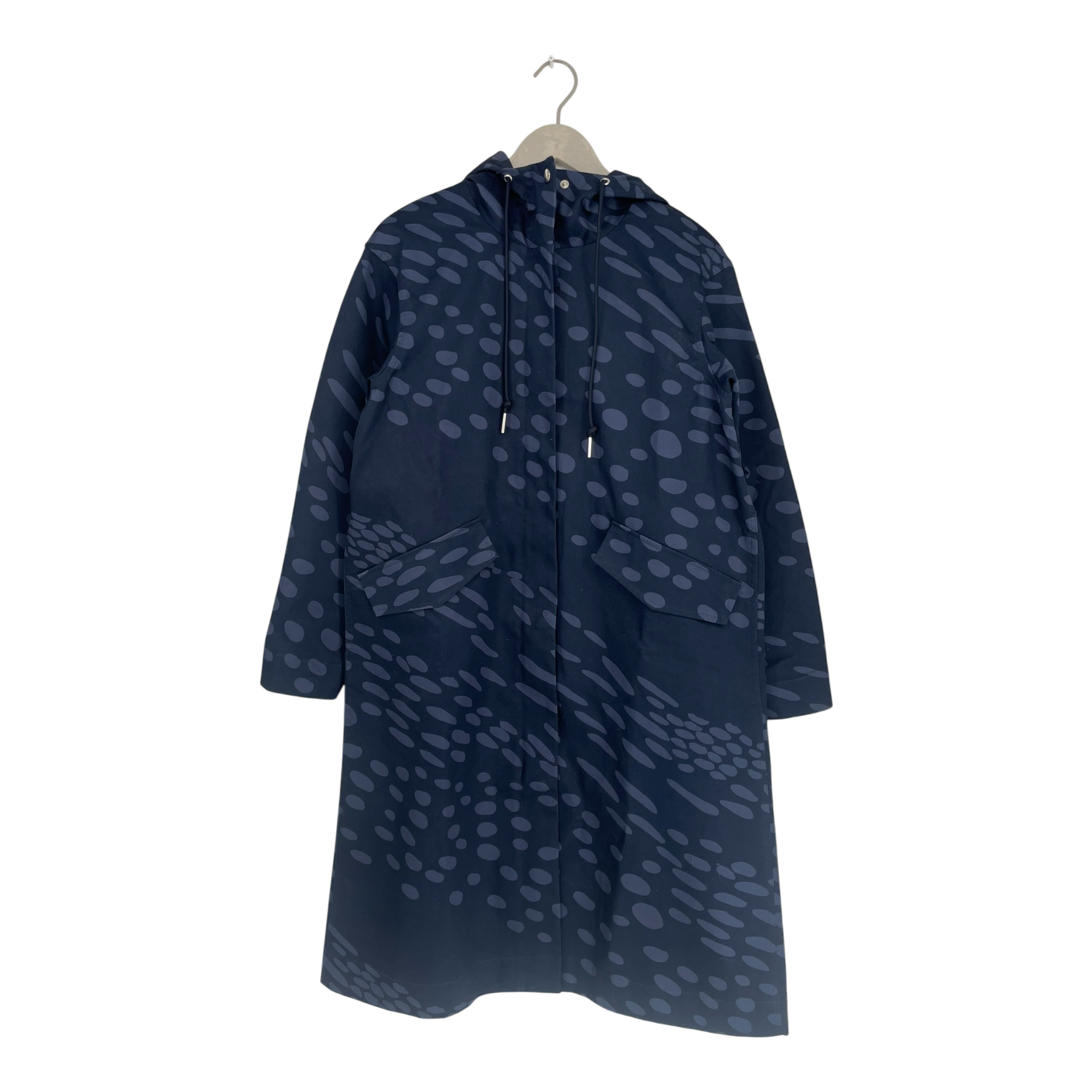 The Marimekko Elinne jacket has a wide hood with string tightening, high collar, zipper and snap closure on the front with flap and two open front pockets with flaps. The zipper has a comfortable fabric pull. One very light stain on the back that appears to be easily removable, otherwise the jacket seems unused.