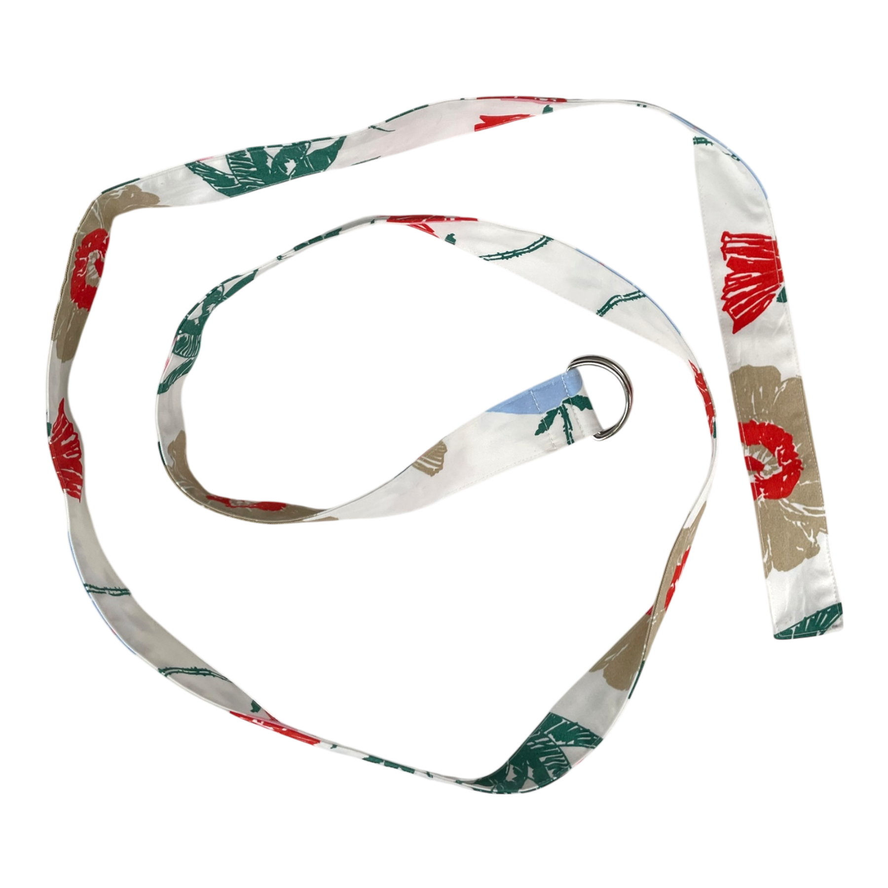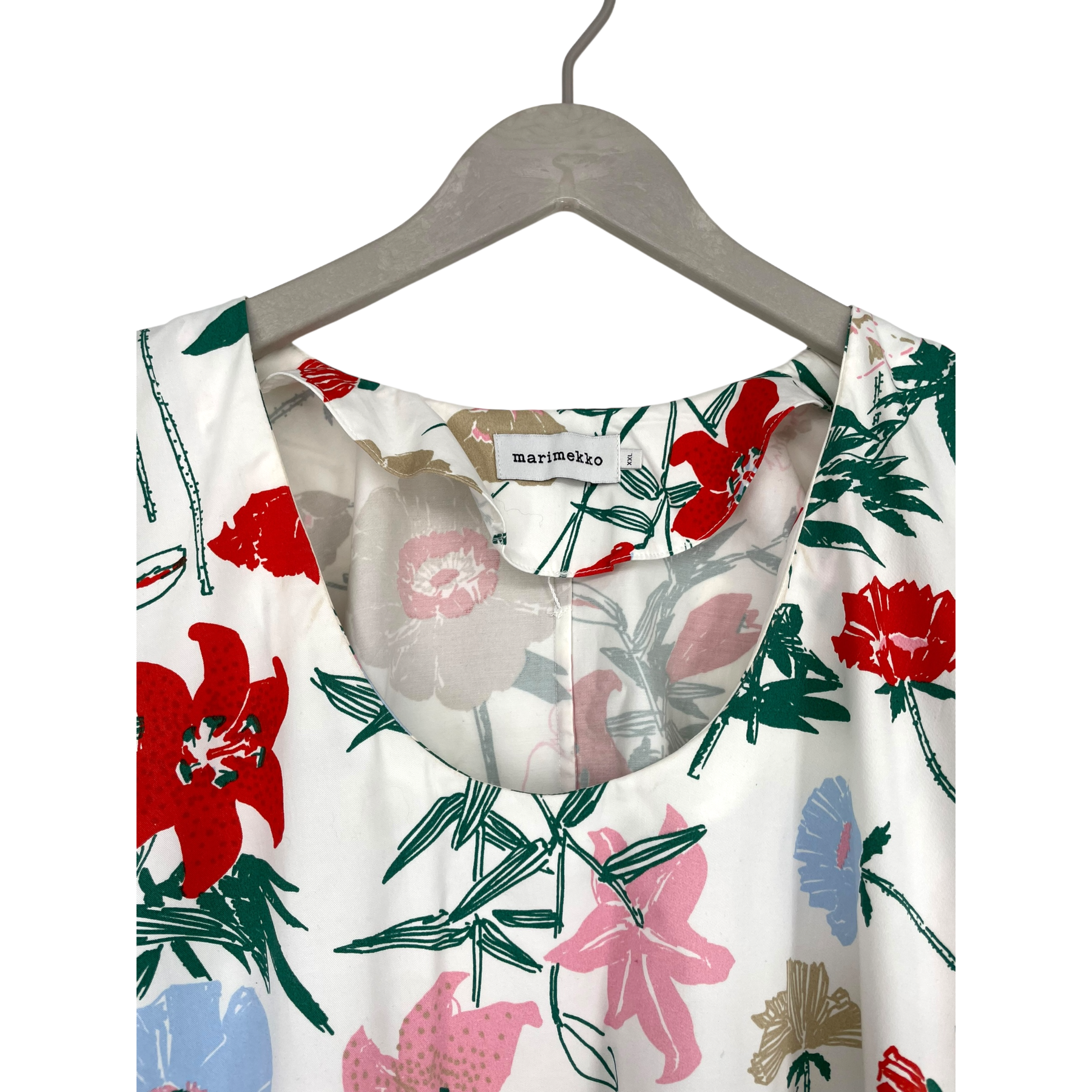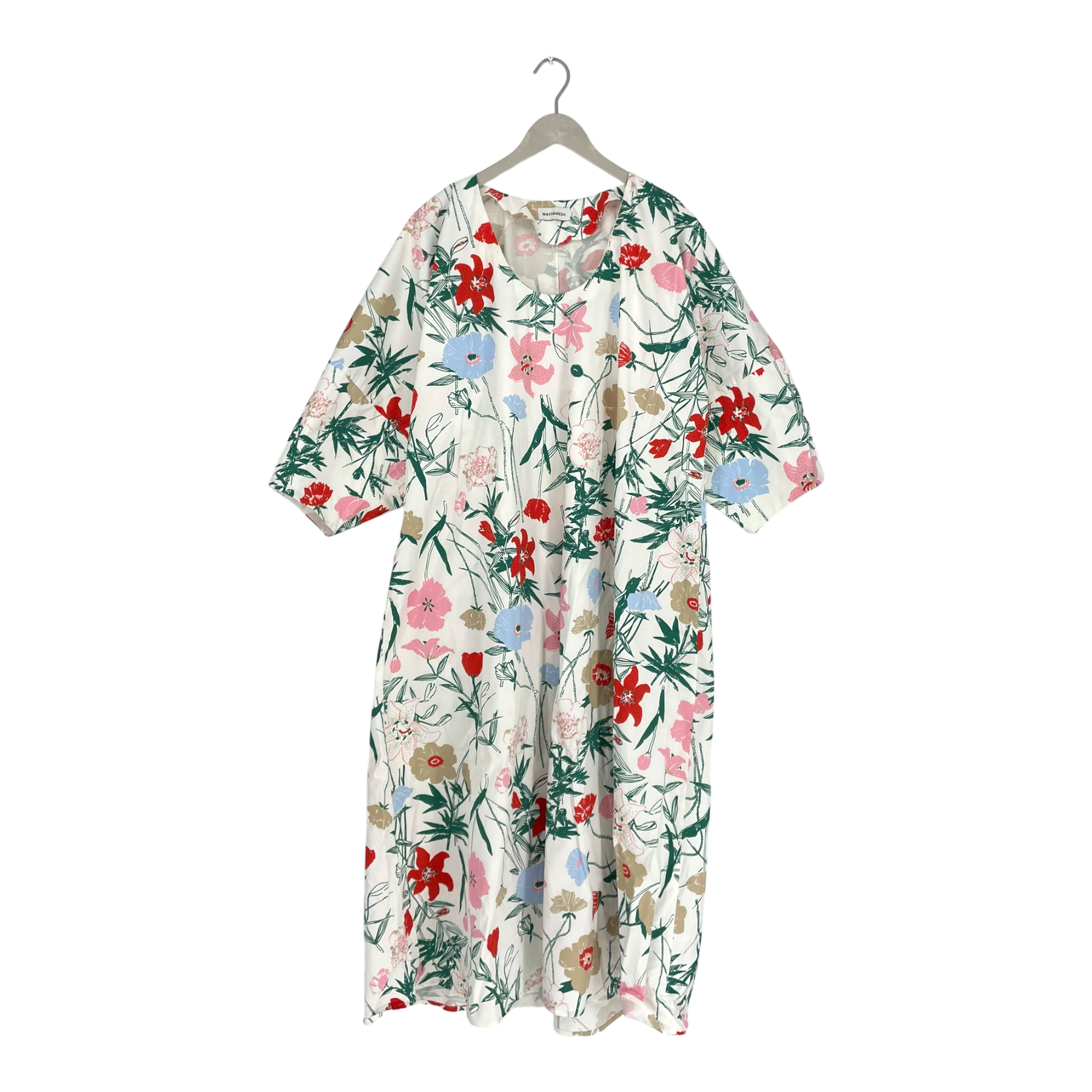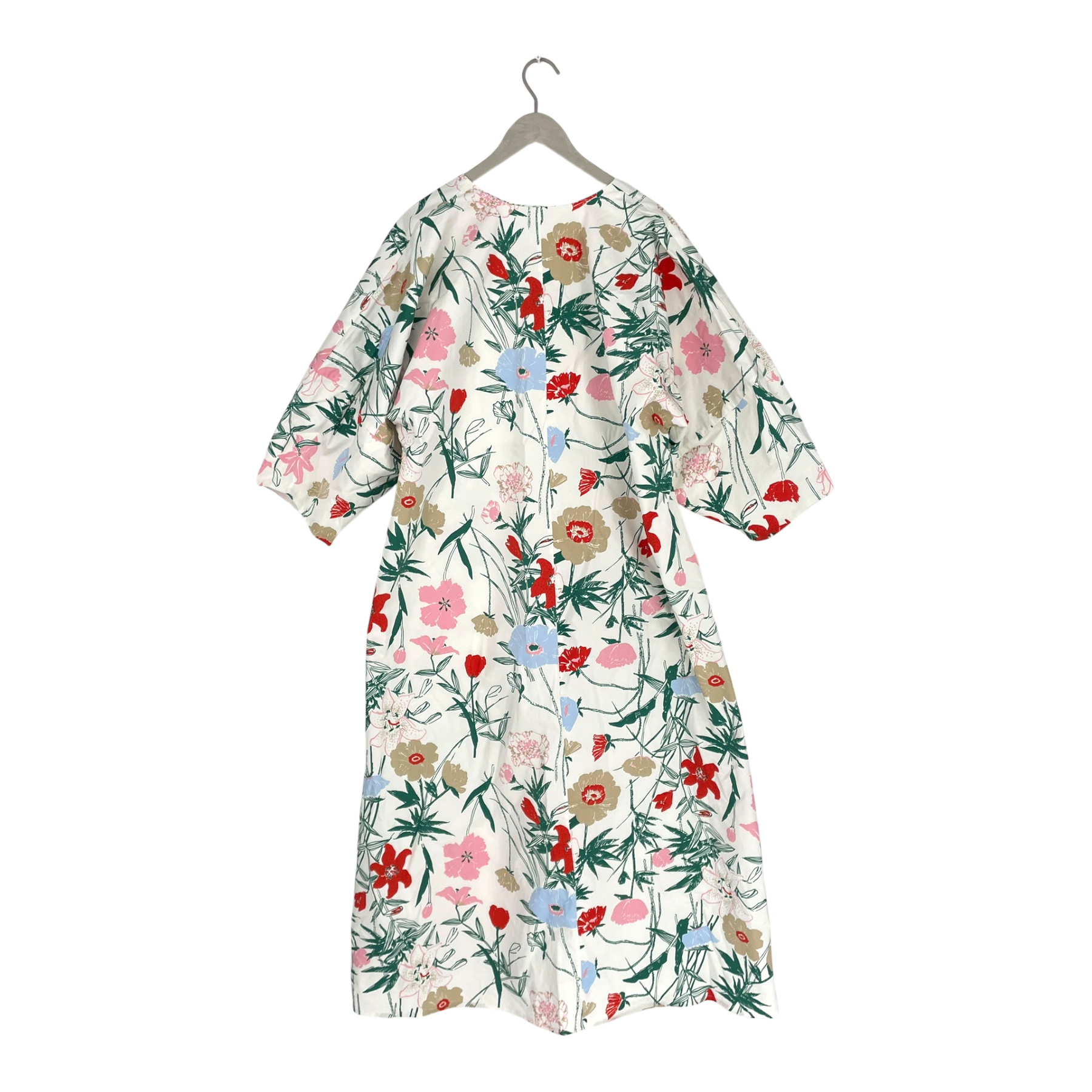 Marimekko Hymy dress is made from organic cotton terry and has a relaxed fit, a straight-cut bodice, and a flared hem. The fabric contains 4% elastane. The dress features the Perenna pattern, printed in Helsinki. It has a deep U-neckline, side seam pockets, and a detachable D-ring belt. The three-quarter length kimono sleeves are rounded and have wide cuffs folded in double layers.