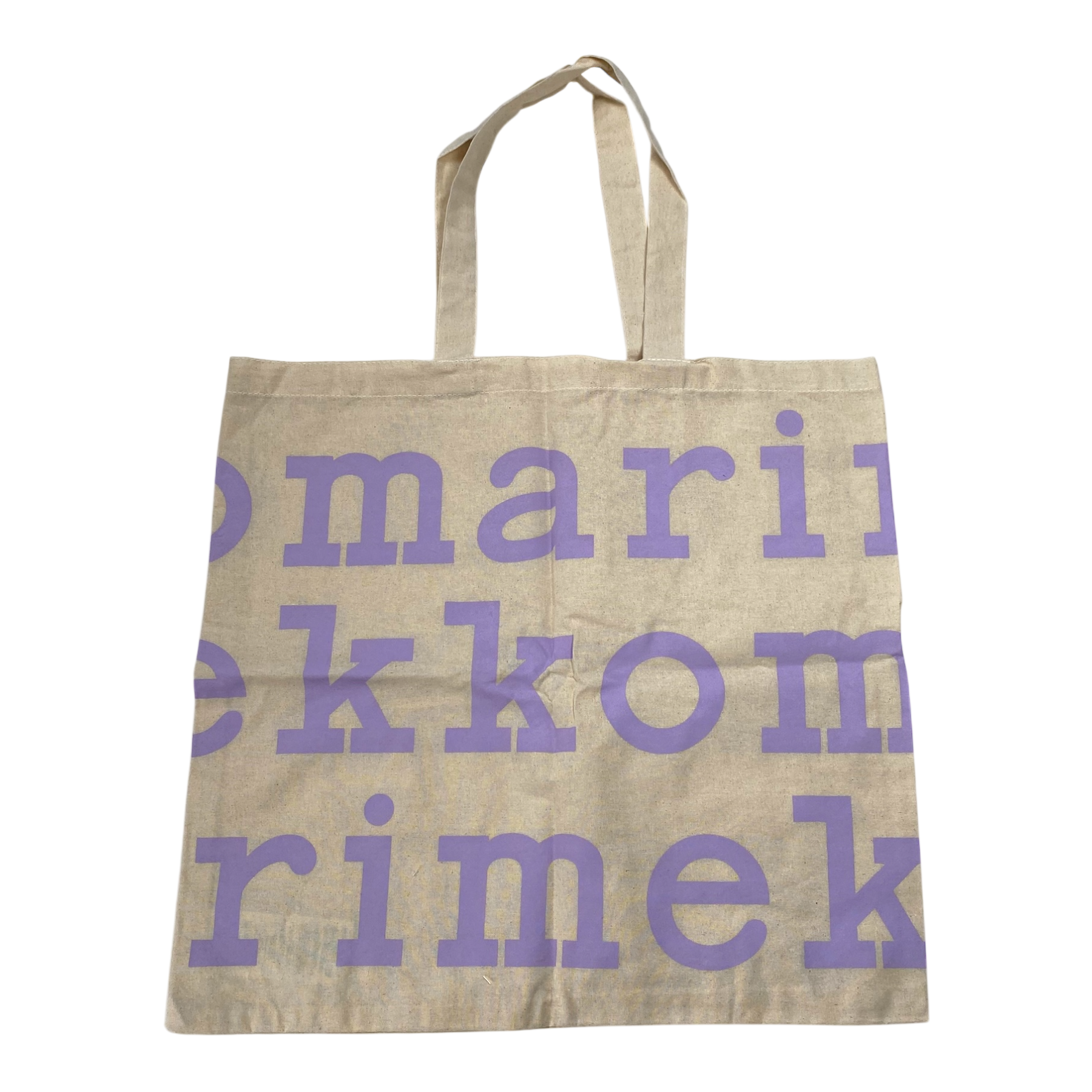 Marimekko tote shopping bag is made of lightweight cotton fabric, which features a logo pattern. The bag has two handles.