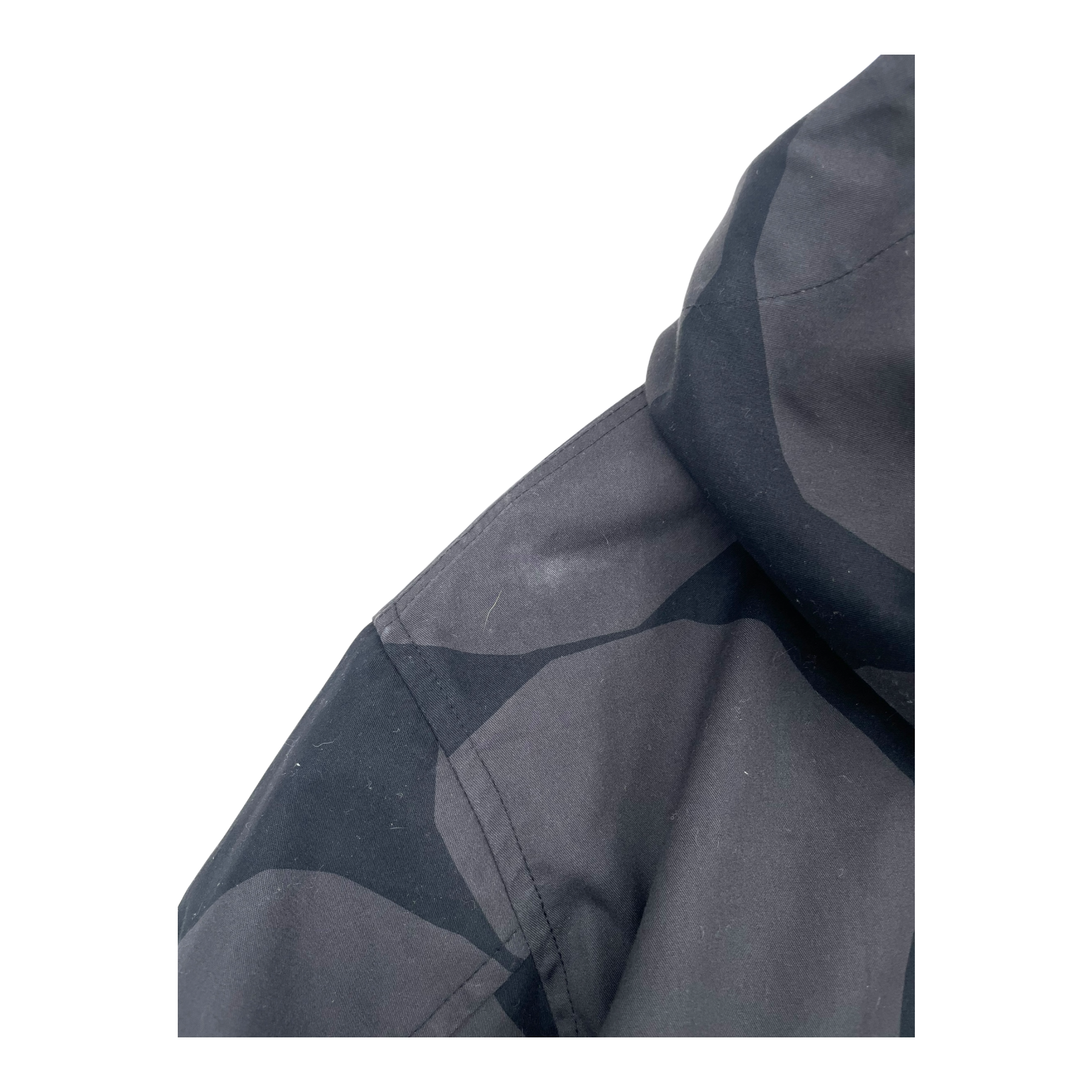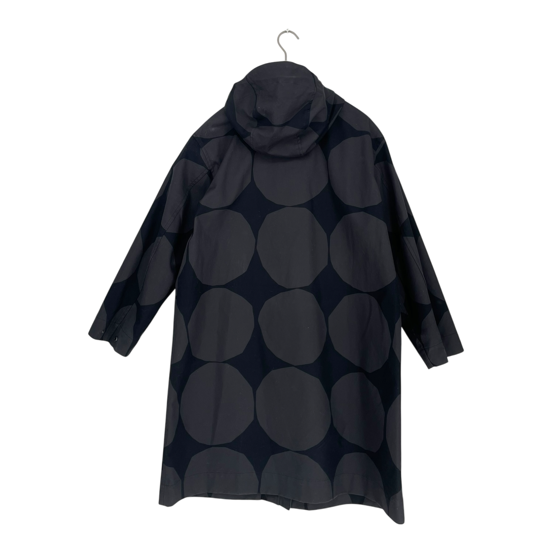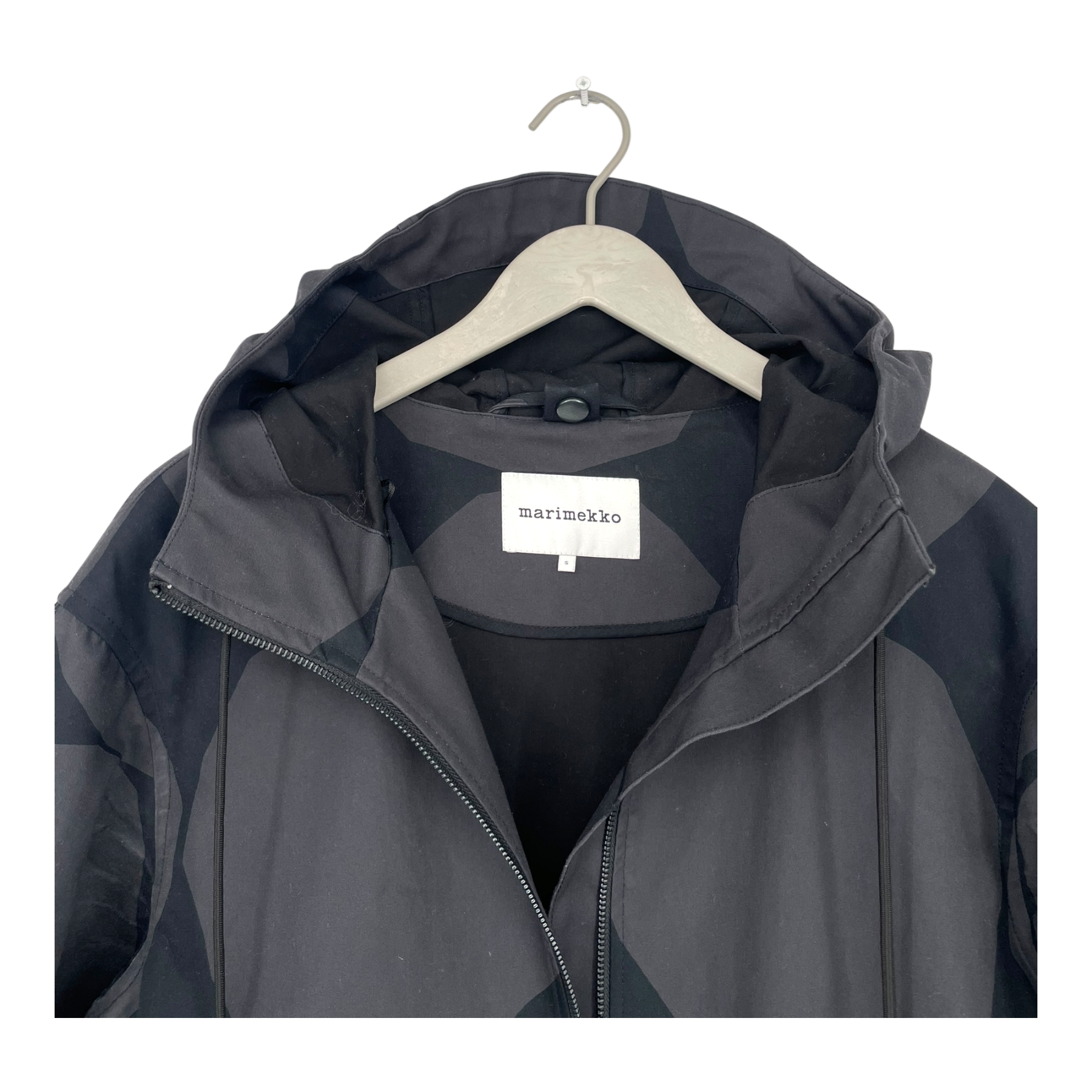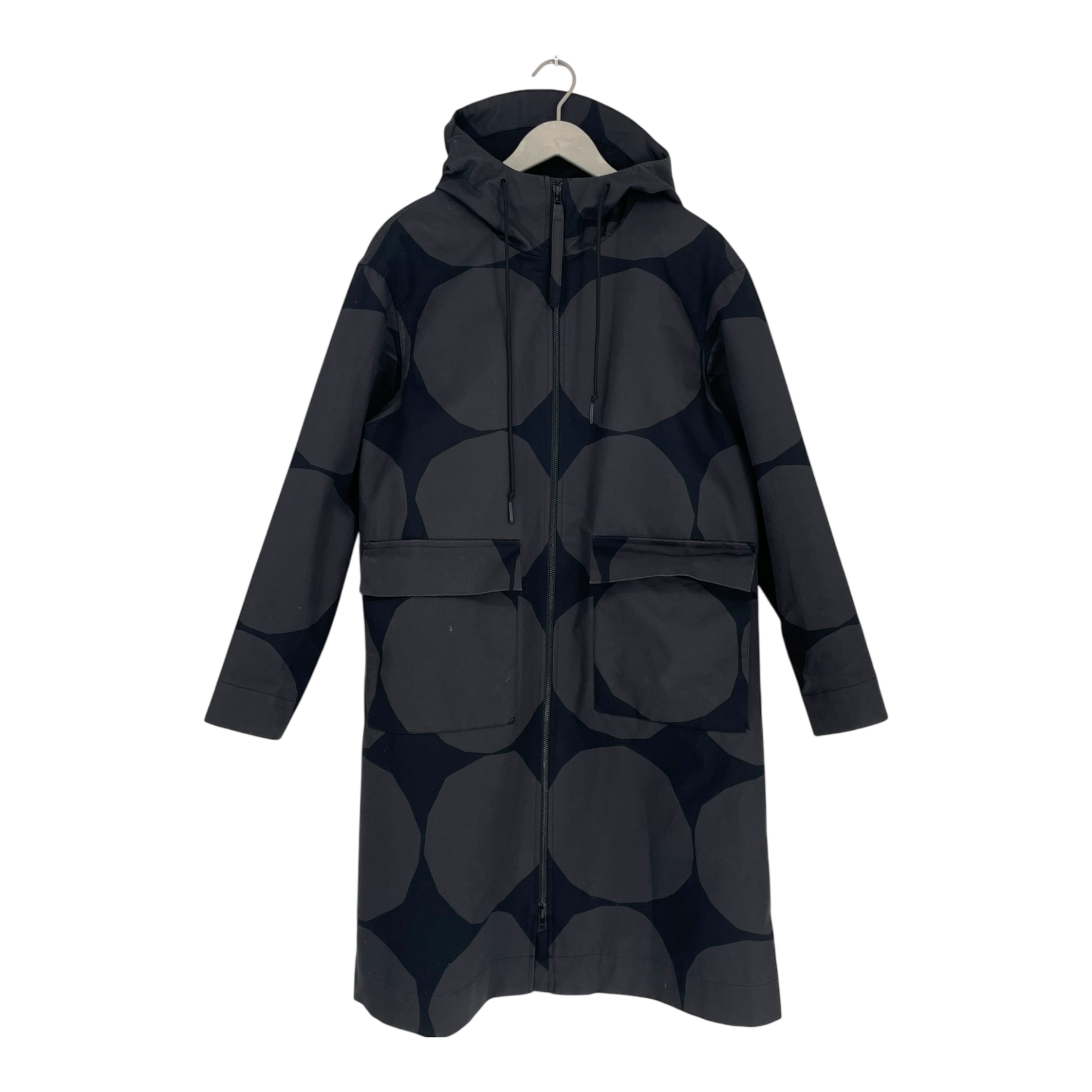 Marimekko Mangaani Kivet parka jacket. The jacket is made of thick, water-repellent cotton twill, where two layers of fabric are bonded together. The jacket has a relaxed fit, a straight cut and a Kivet pattern. The jacket has a high collar and a hood adjustable with drawstrings, a two-way metal zipper and flap pockets at the front. The cuffs have press stud fastening.