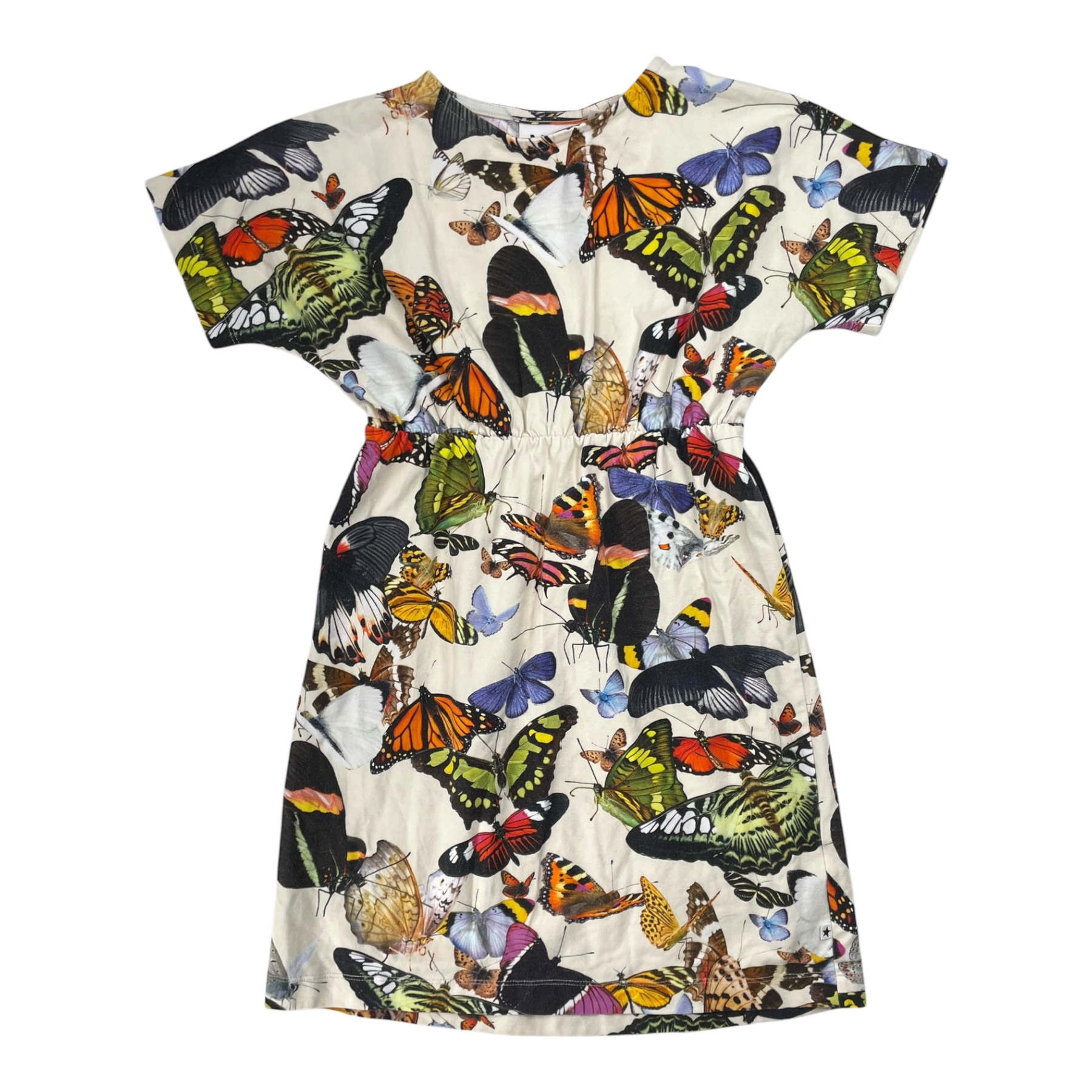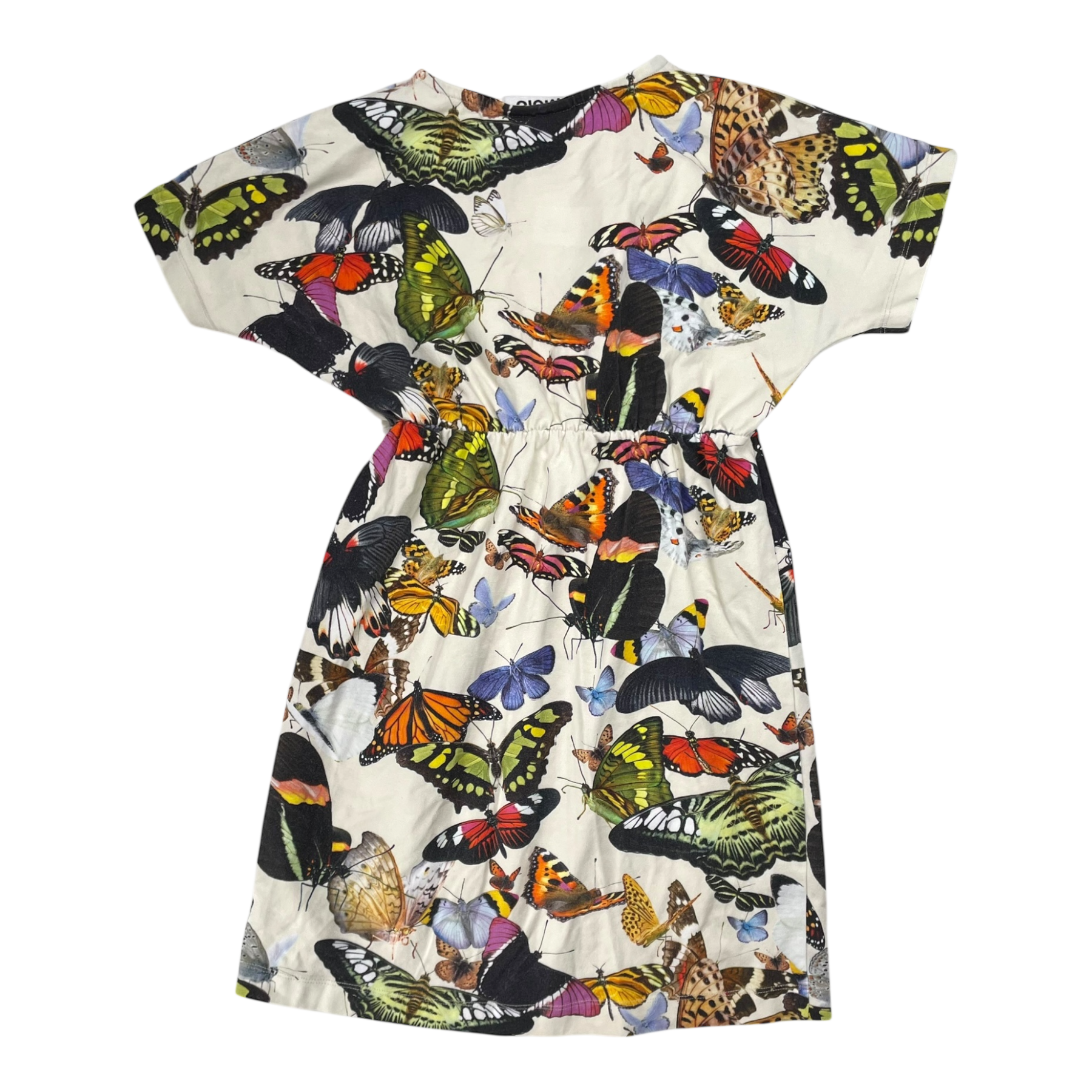 Molo christa dress with an elasticband on the waist in butterfly print.