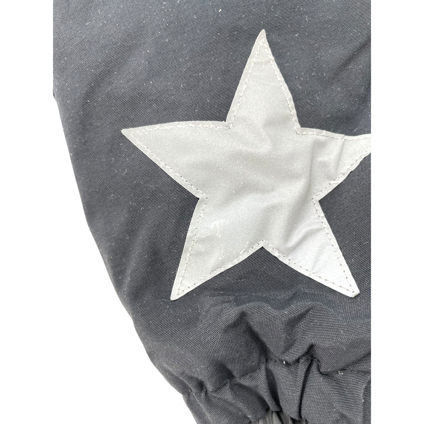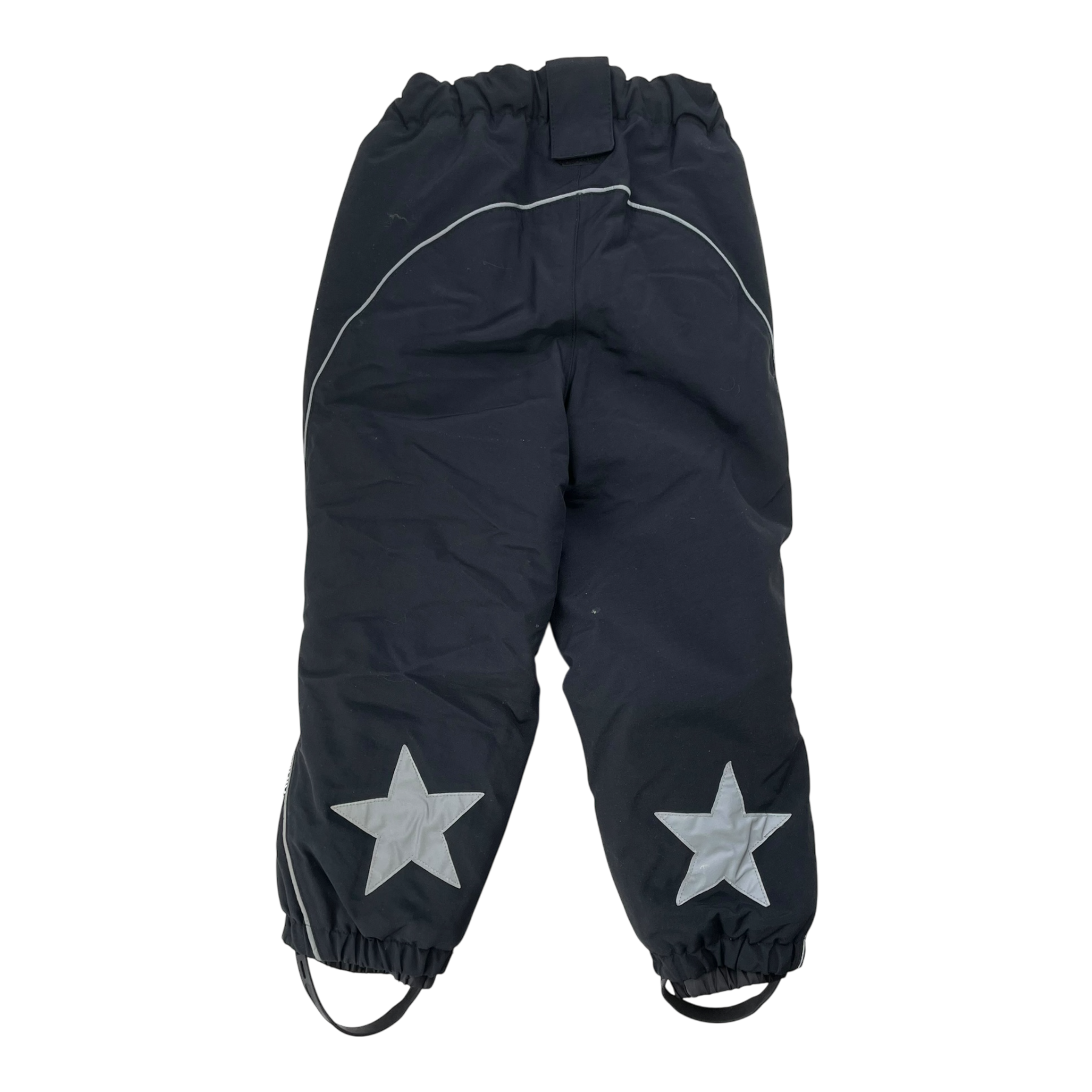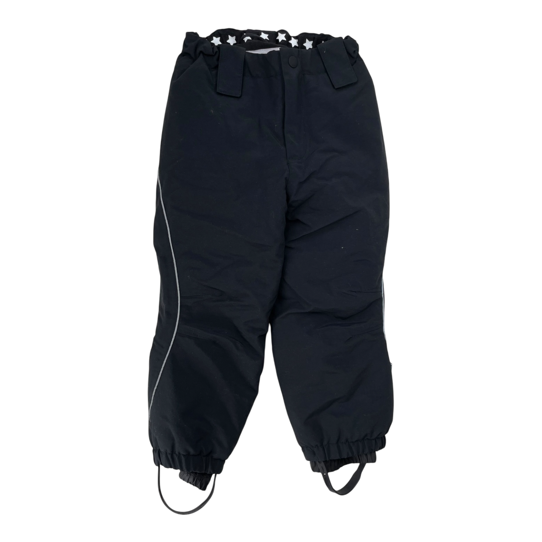 Molo pollux active winter pants with a nylon shell and polyester inner fabric and lining. Waist can be adjusted. There are rubber loops which can be put under shoes. Star shaped reflectors in the back. Originally water and wind proof.