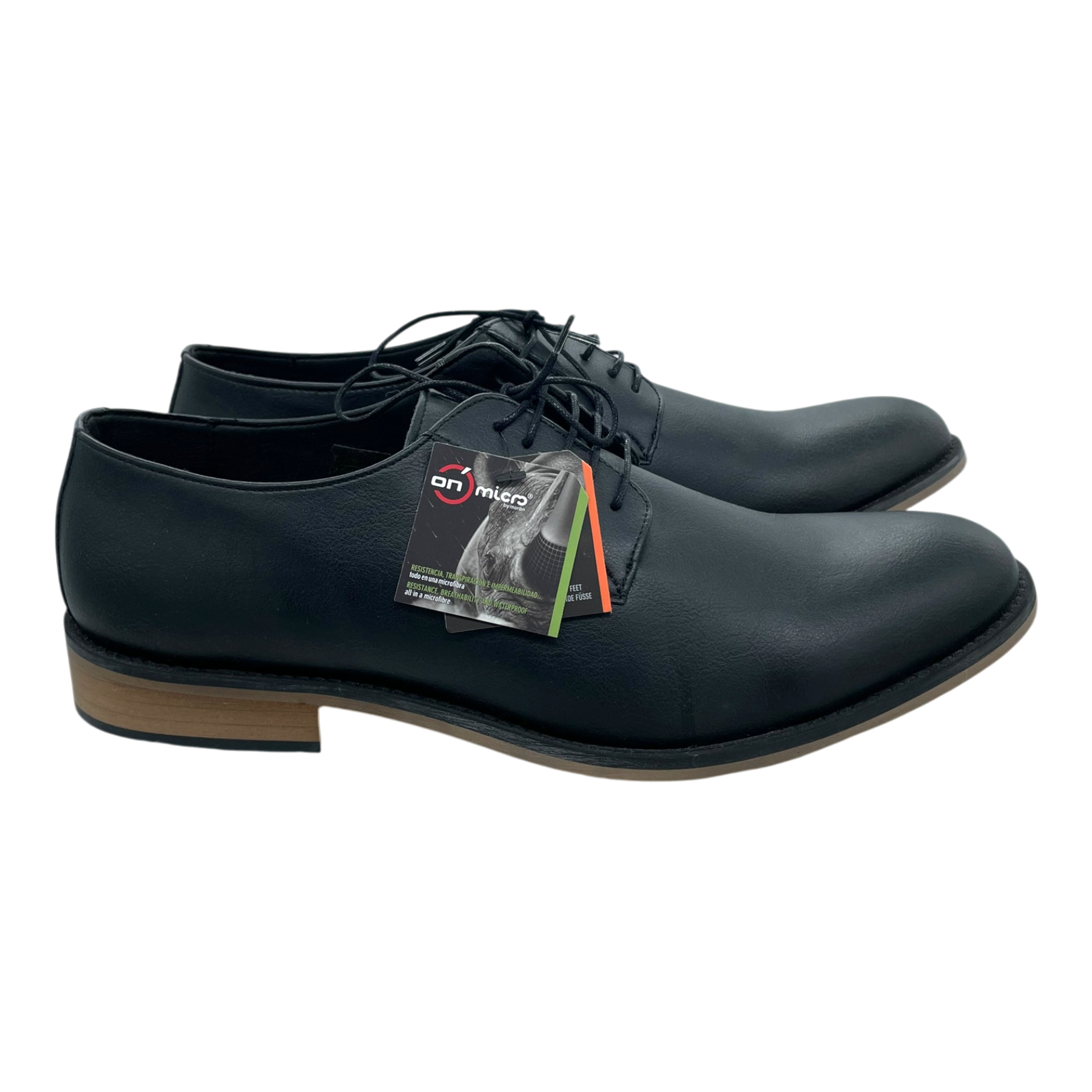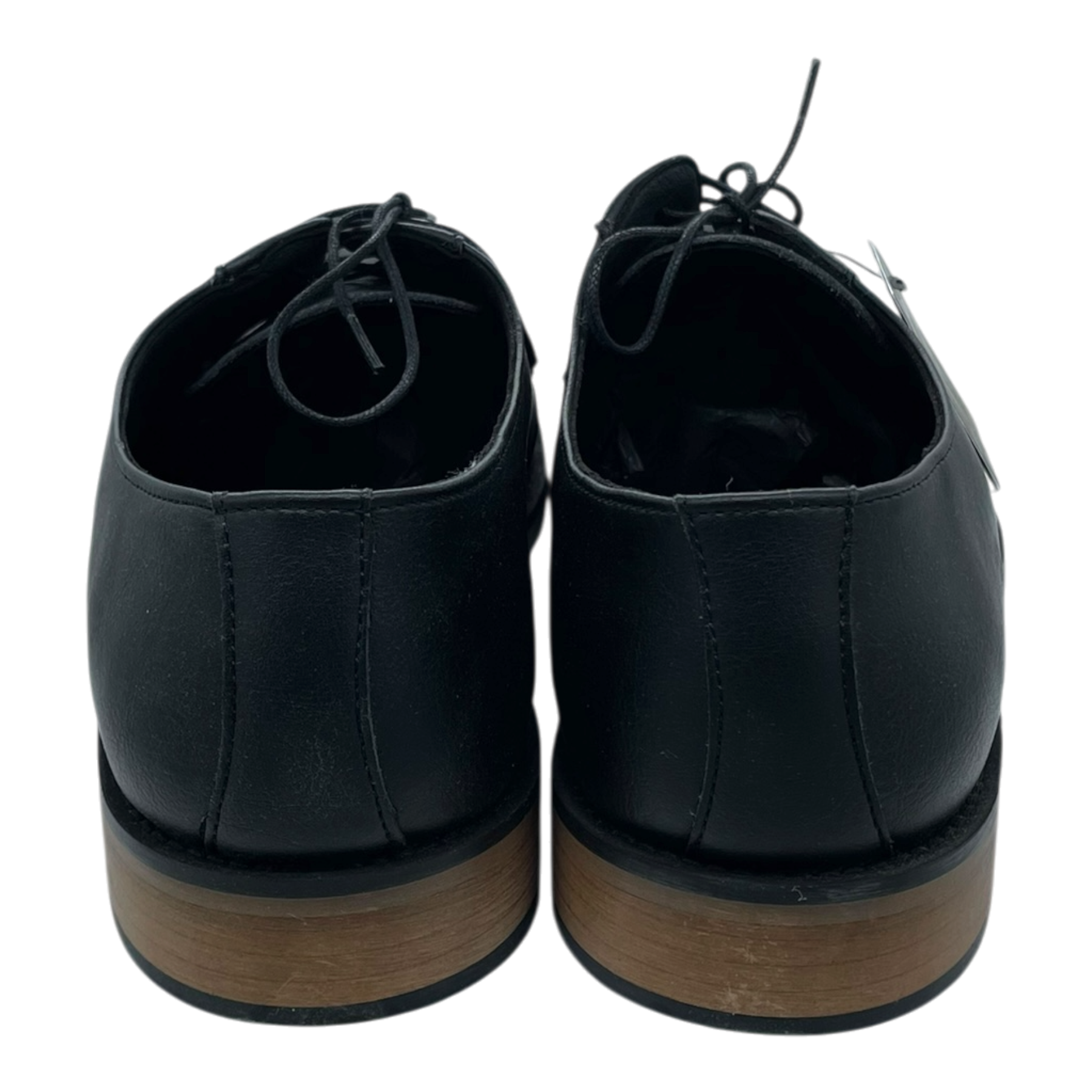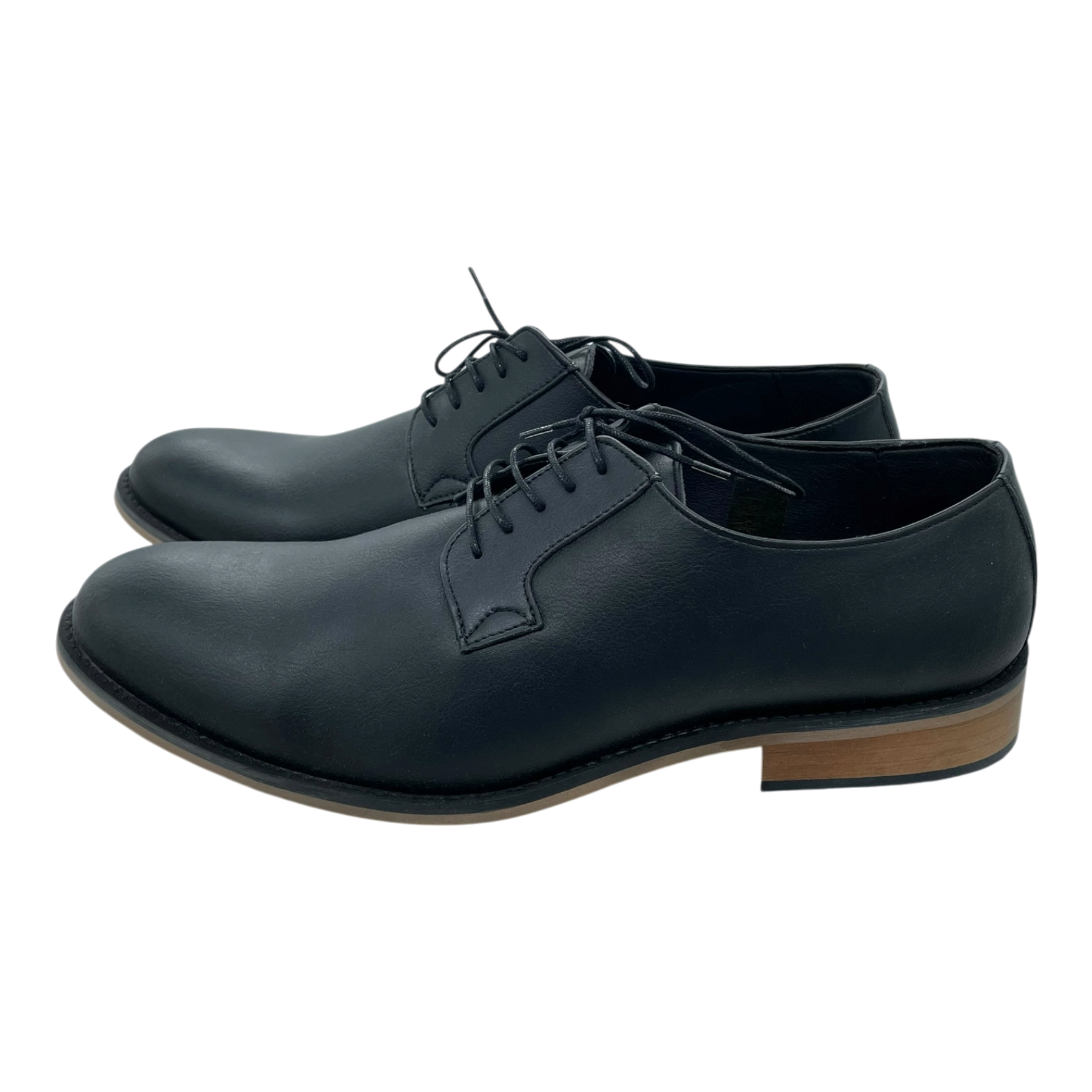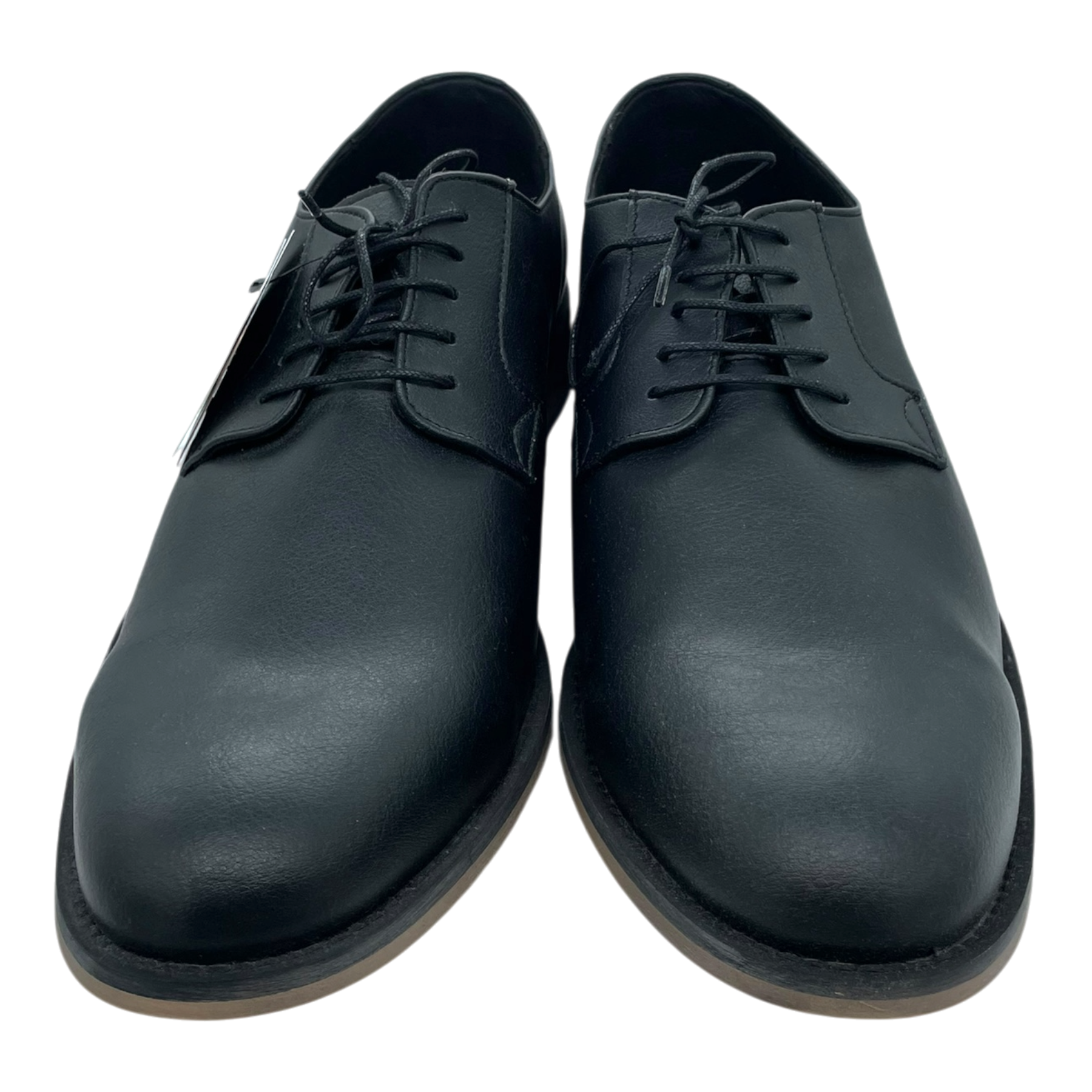 NAE Vegan Shoes classic Jake dress shoes in black with lace-up closure and leather-look finish. Features a sleek silhouette with contrast light brown sole and low heel. Complete with original product tag attached.