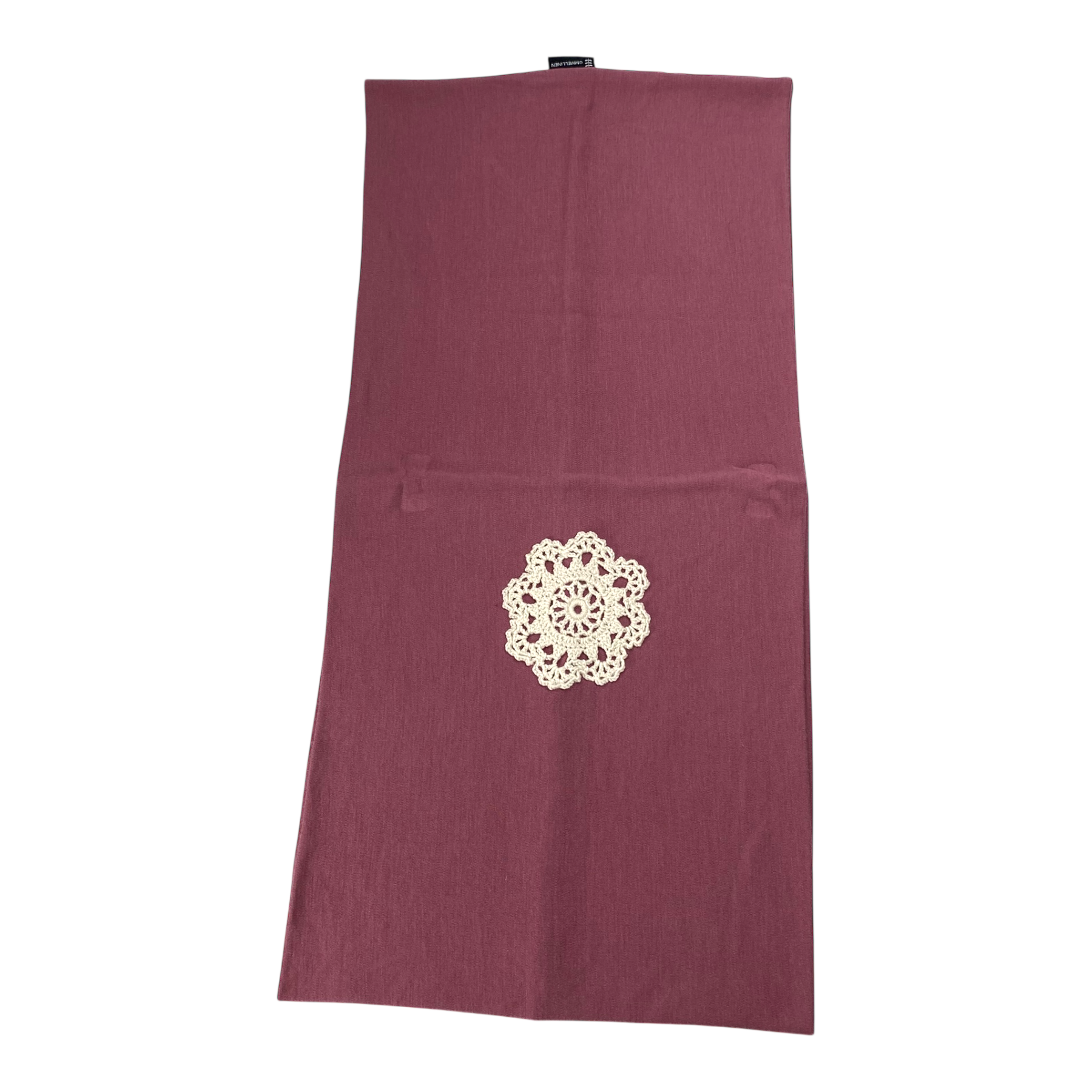 Ommellinen tube scarf in with a floral crochet flower.