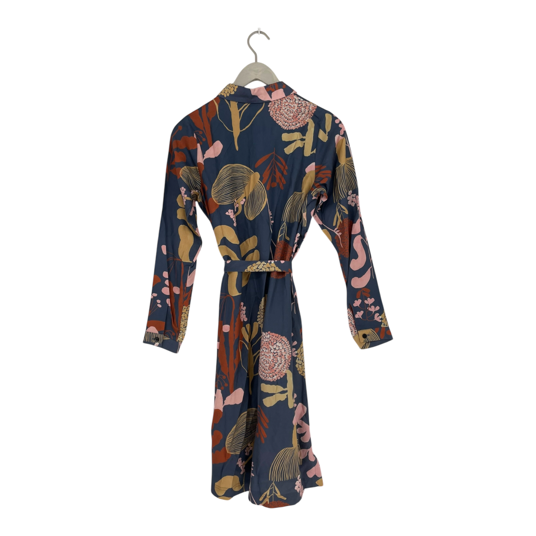 Papu women's long sleeve lyocell buttoned shirt dress with collar, slits on the sides and a removable fabric belt.