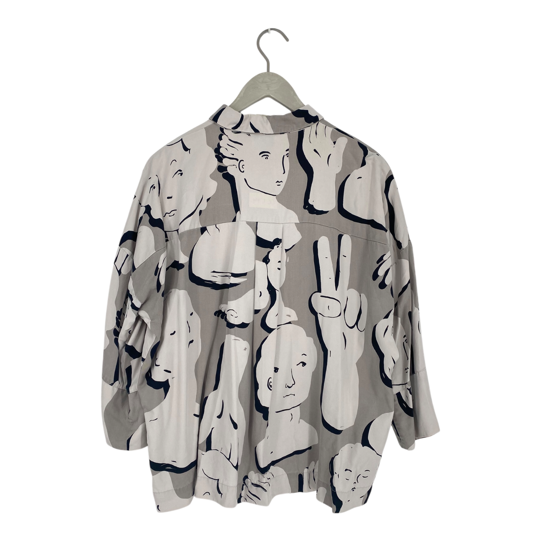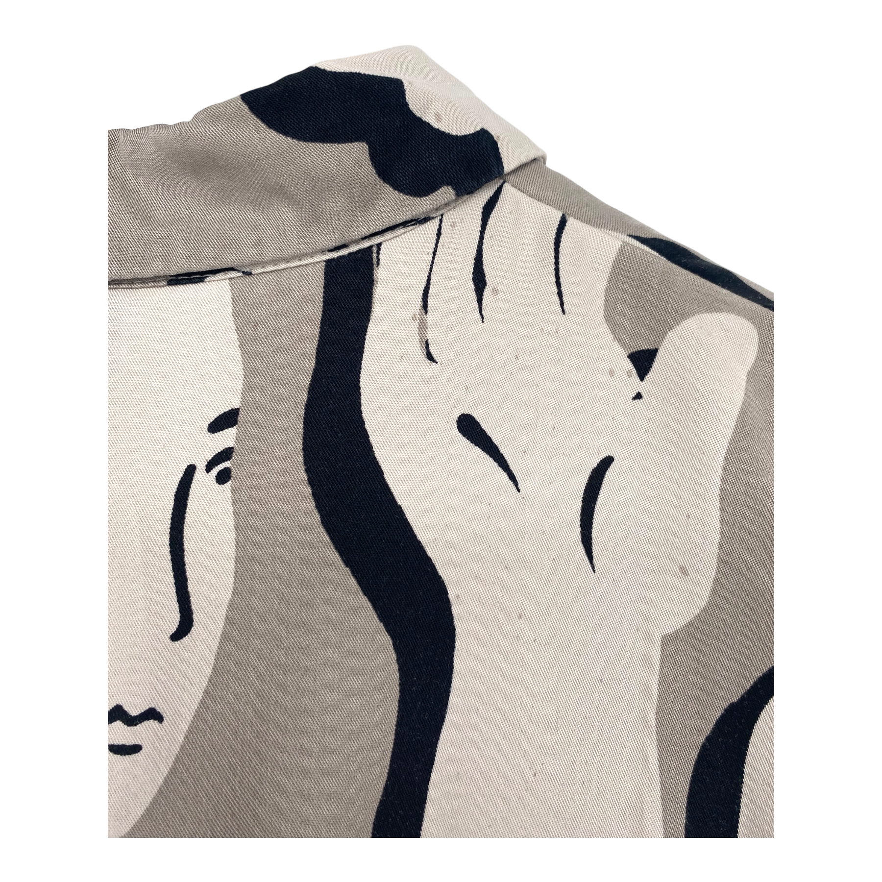 Papu women's lyocell button-up shirt with collar. Hidden buttons down the front. Long sleeves with slits and buttons on wrist band. Round neckline and shirt collars. Pleats on the back.