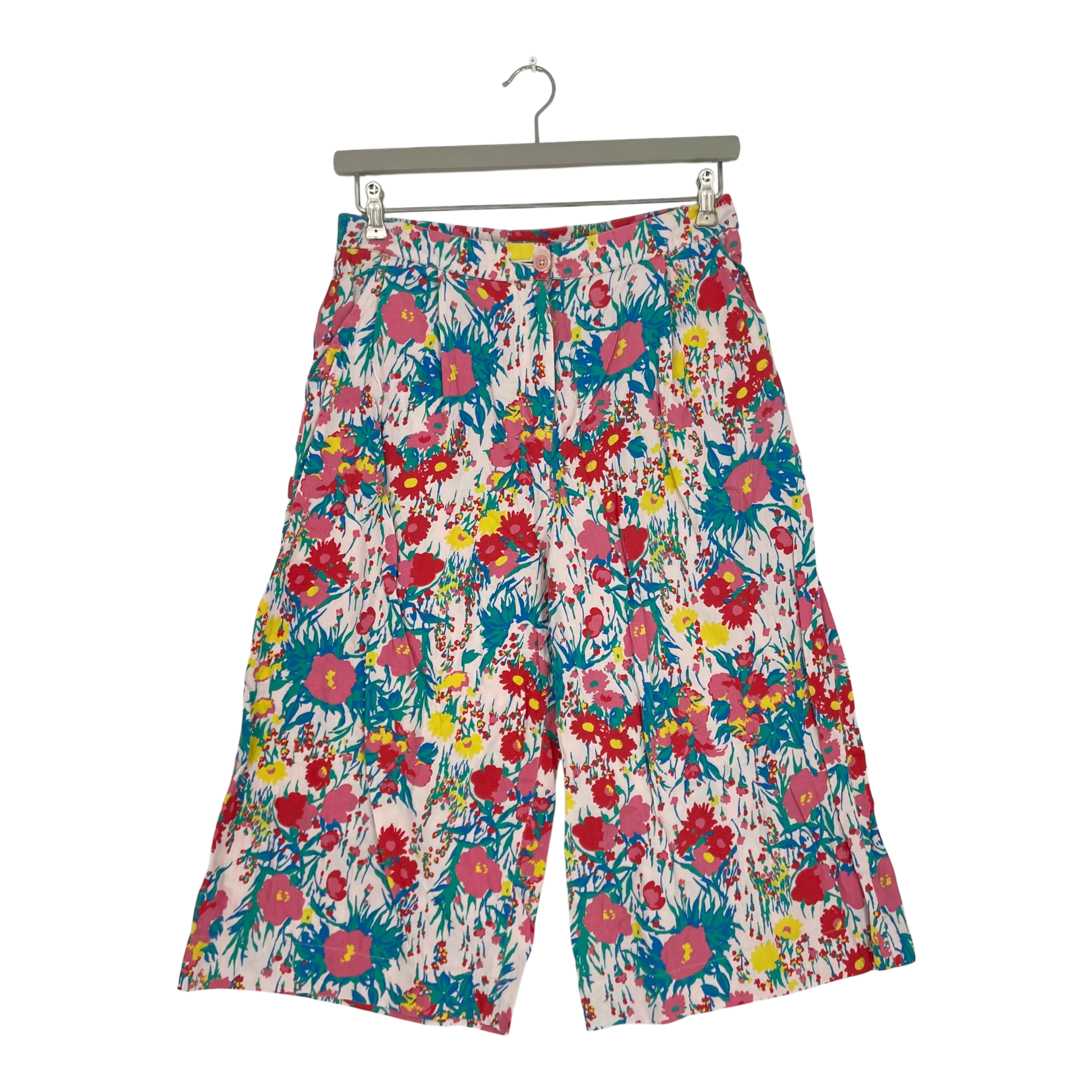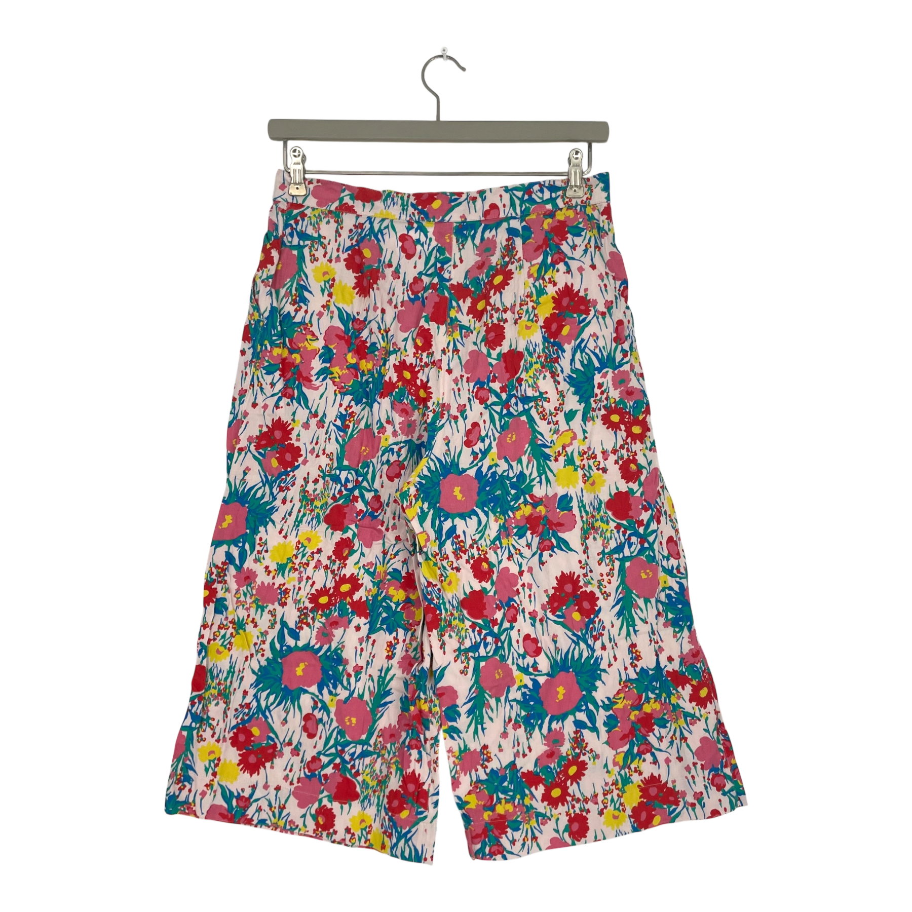 People tree women's culottes in a multicolor flower print. The culottes have pockets on the sides and a zipper and a button on the front. Women's UK size 12, which corresponds to size 38.