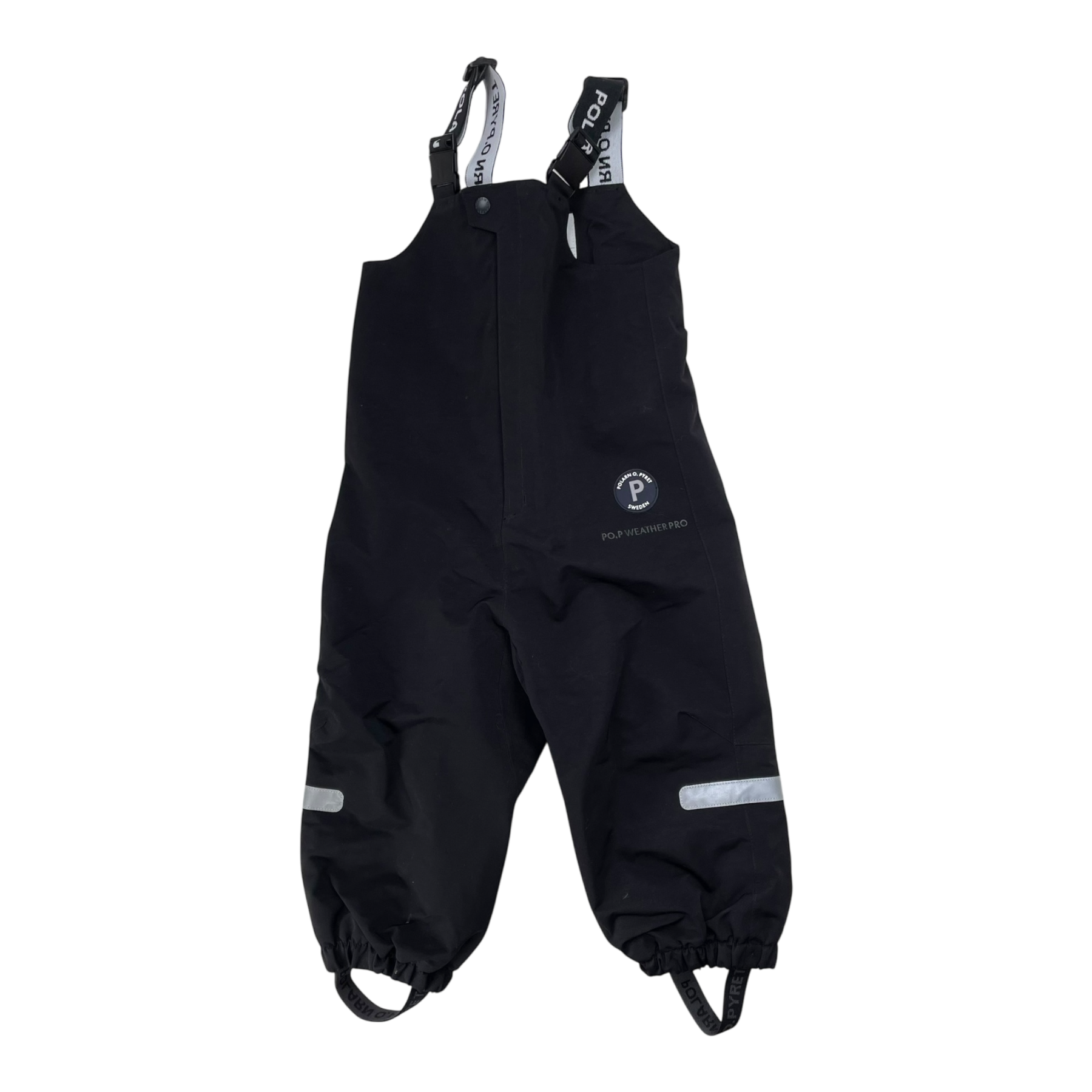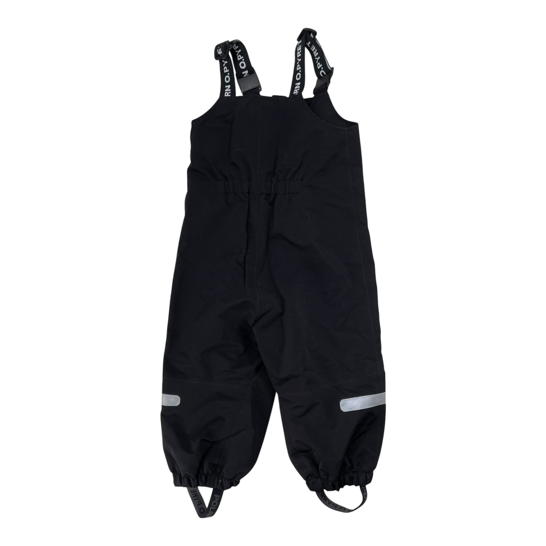 Polarn O. Pyret midseason pants with long zipper on front, adjustable suspenders and stirrups. The pants are originally wind- and waterproof.