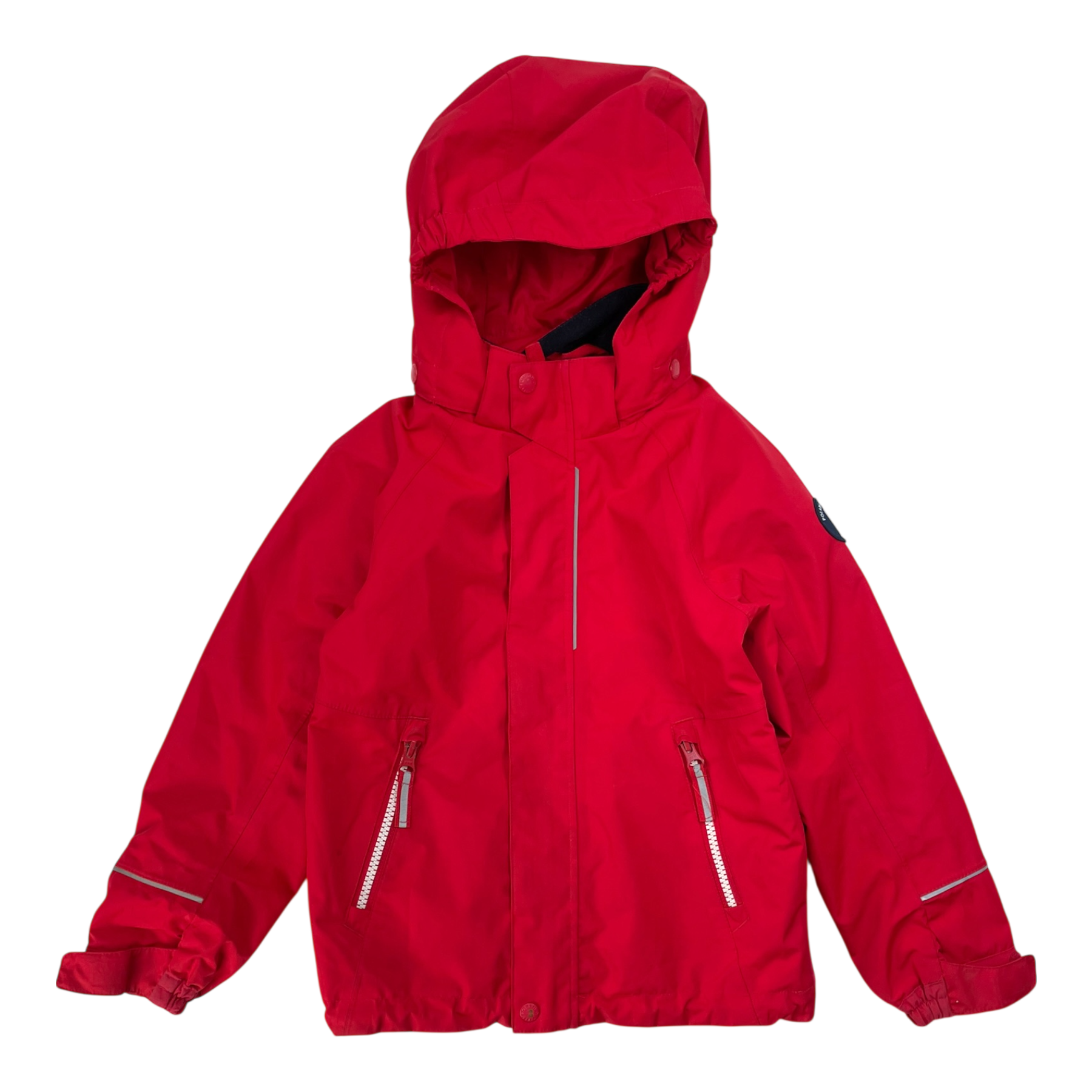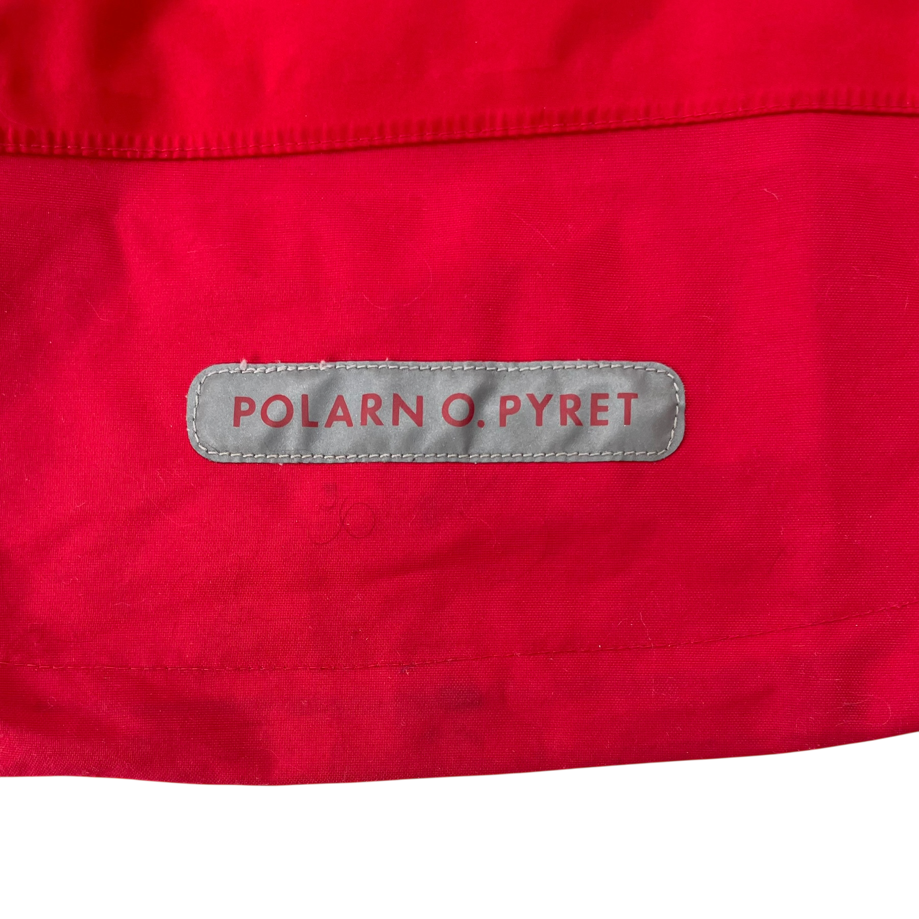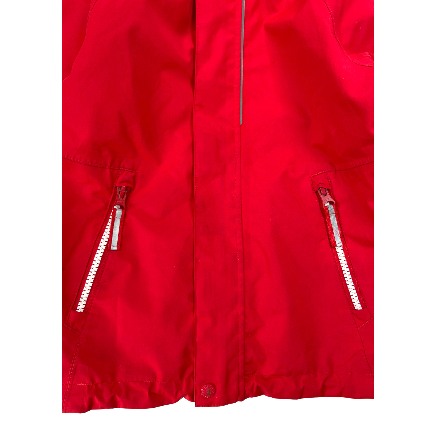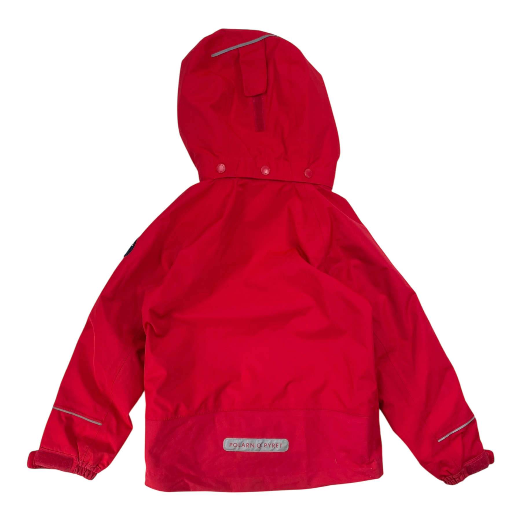Polarn O. Pyret midseason jacket with windproof and water resistance layers. Detachable hood and two pockets with zippers. The item has several stains.