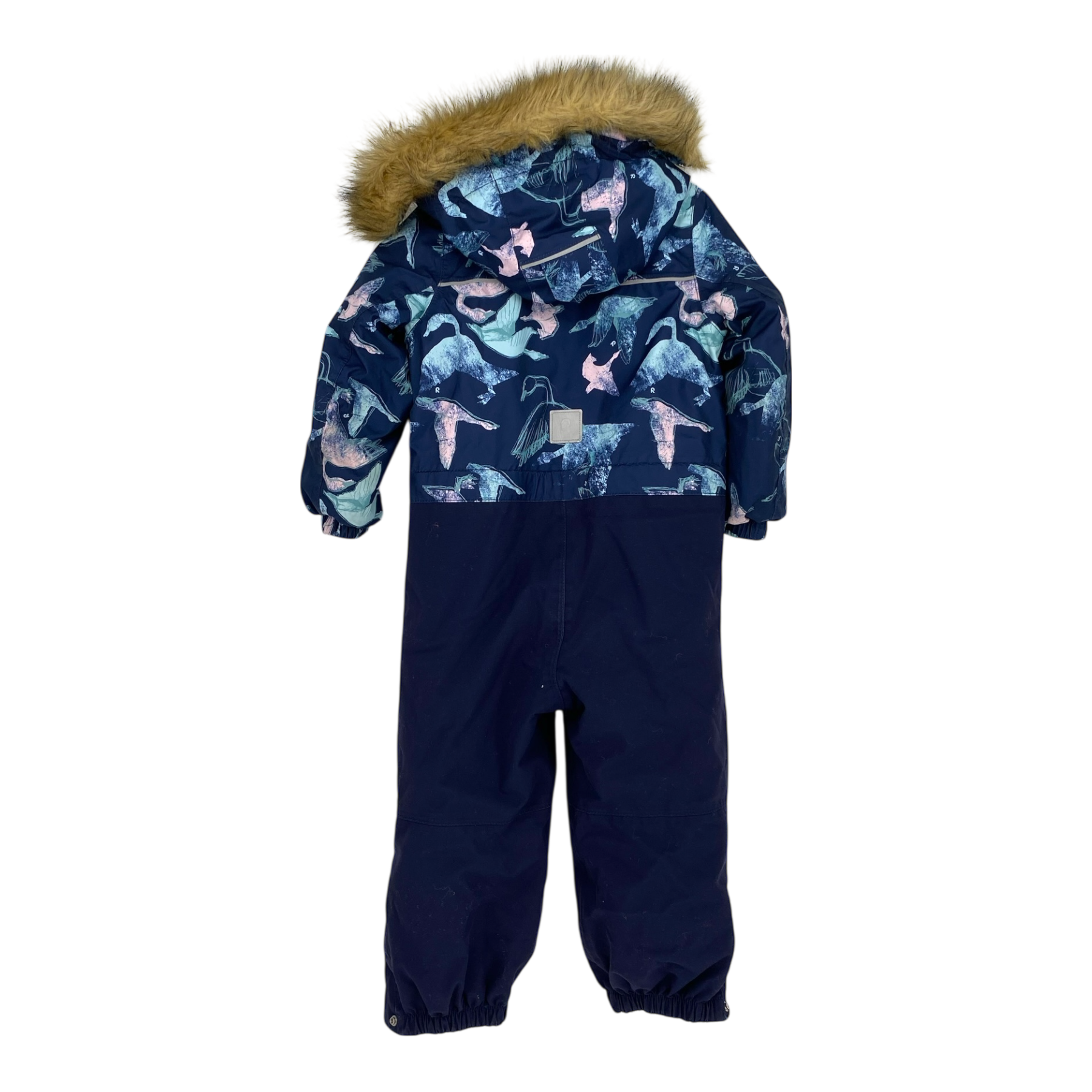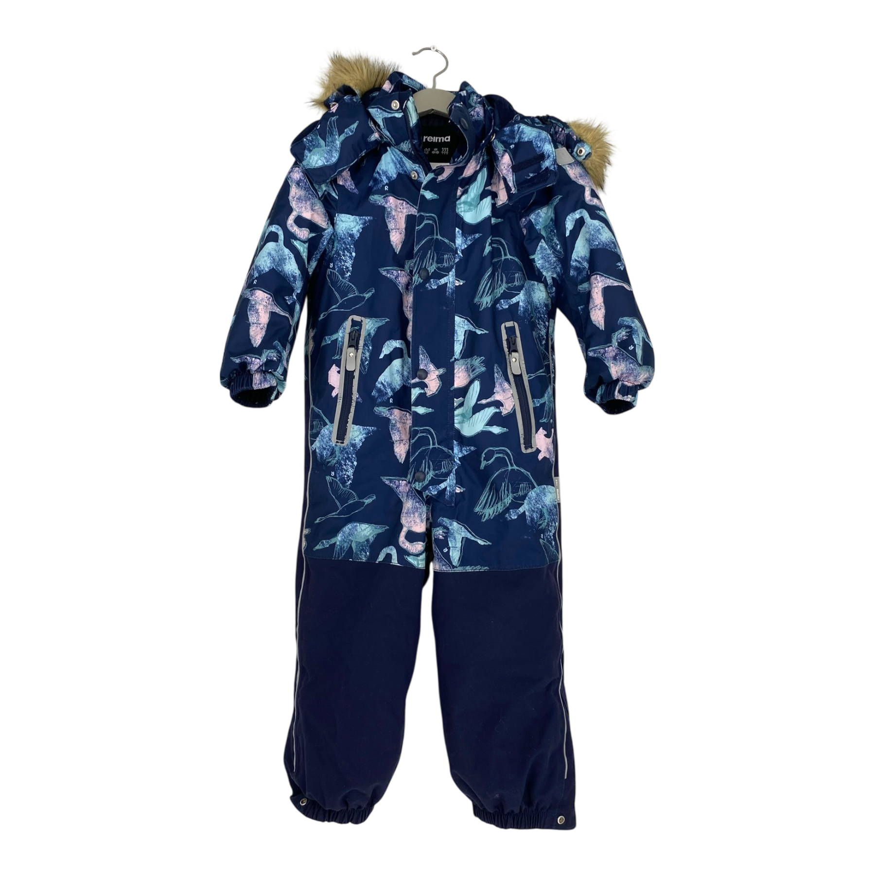 Reima Kipina winter overall with detachable faux fur hood, zip pockets on sides, reflective details, adjustable elastic on the waist and durable foot loops.