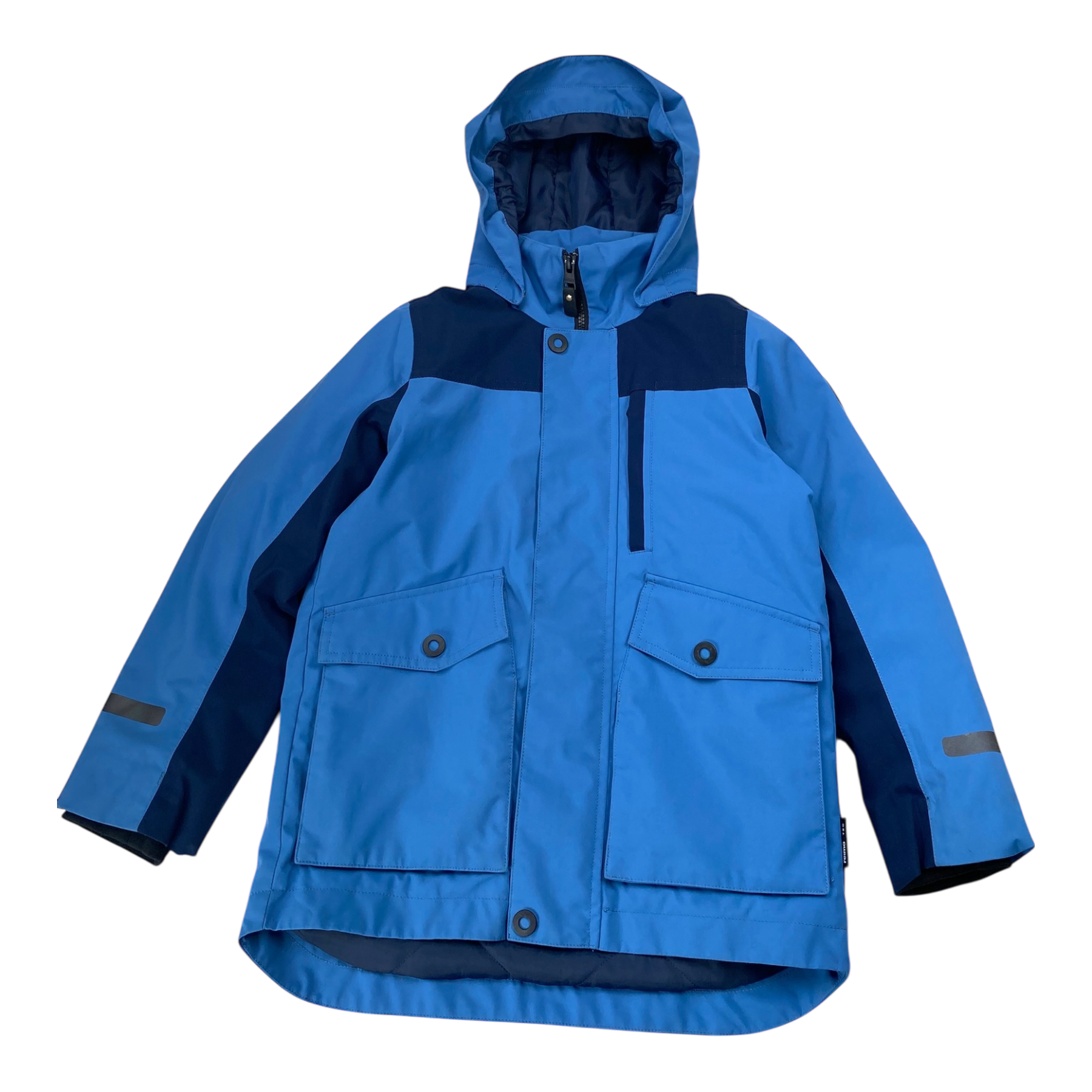 Reima Mainala winter jacket with a removable hood, two pockets in the front and a zipper closure. Originally waterproof up to 10,000mm water column. Warm and breathable.