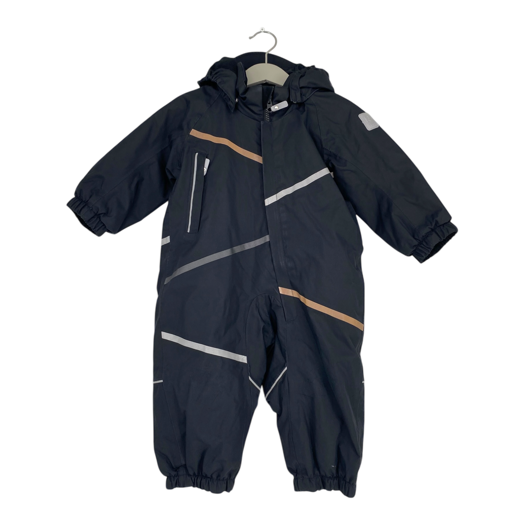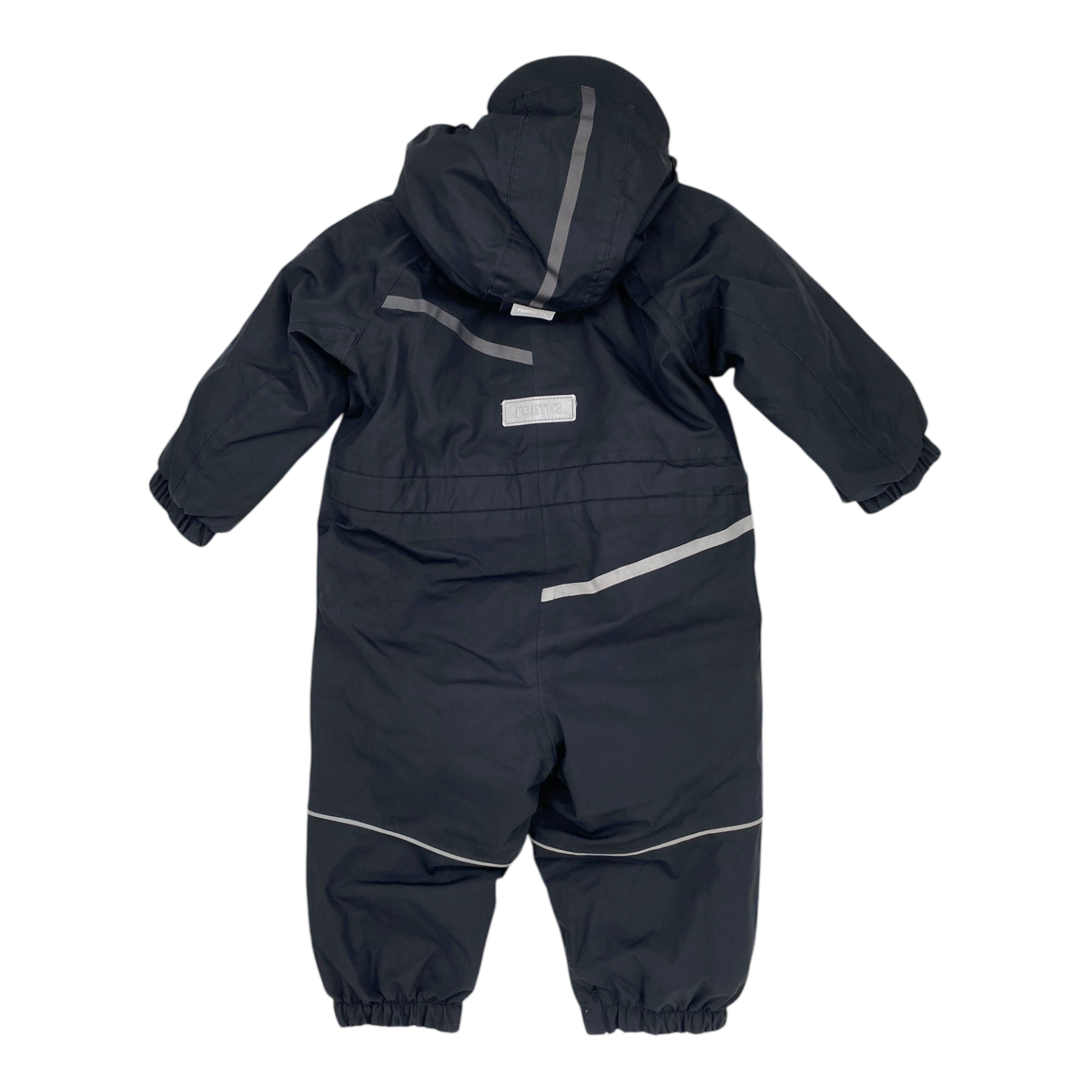 Reima Muotka toddlers' snowsuit. Originally waterproof 15 000mm and has sealed seams. Warm insulation and finished with reflective details. One foot loop is missing.