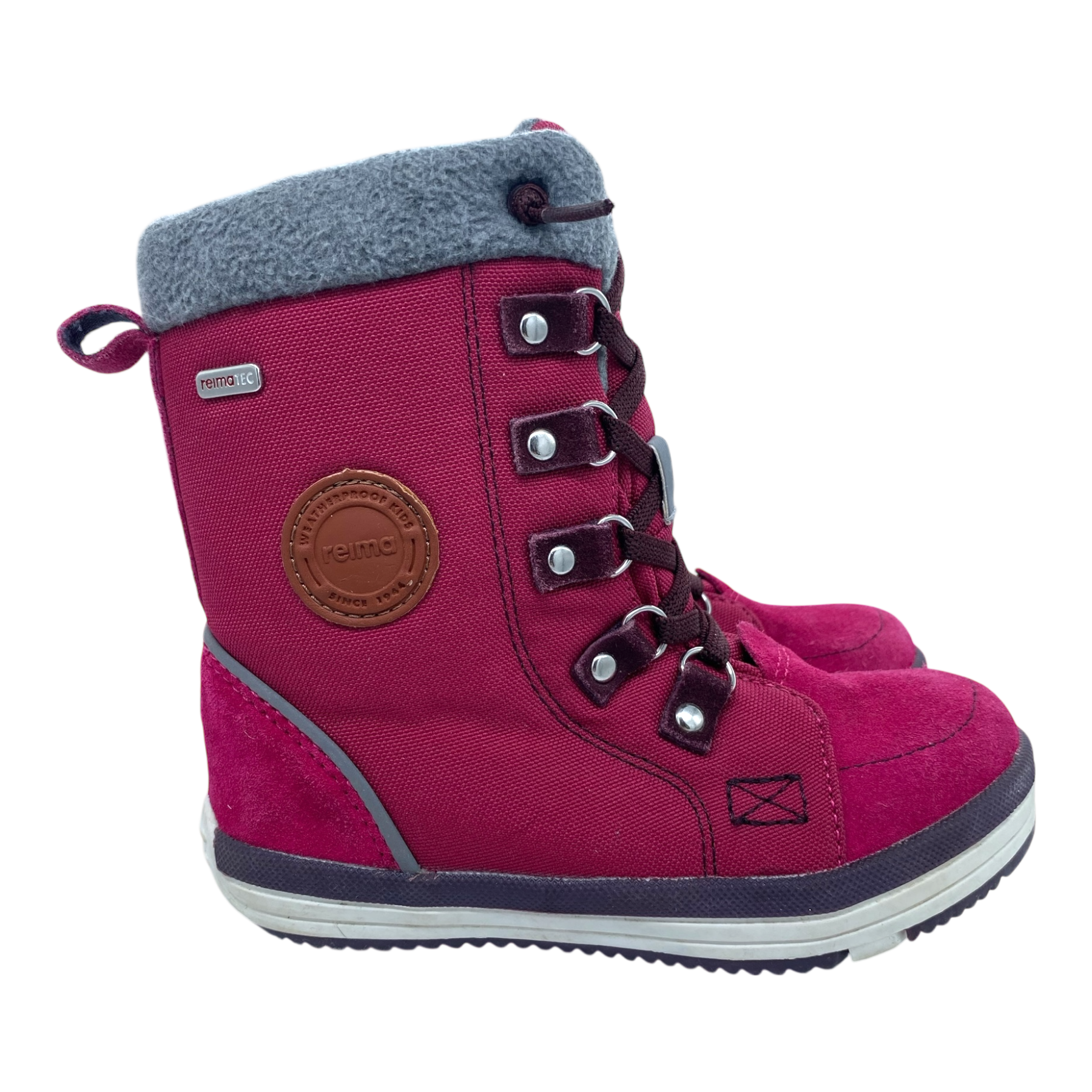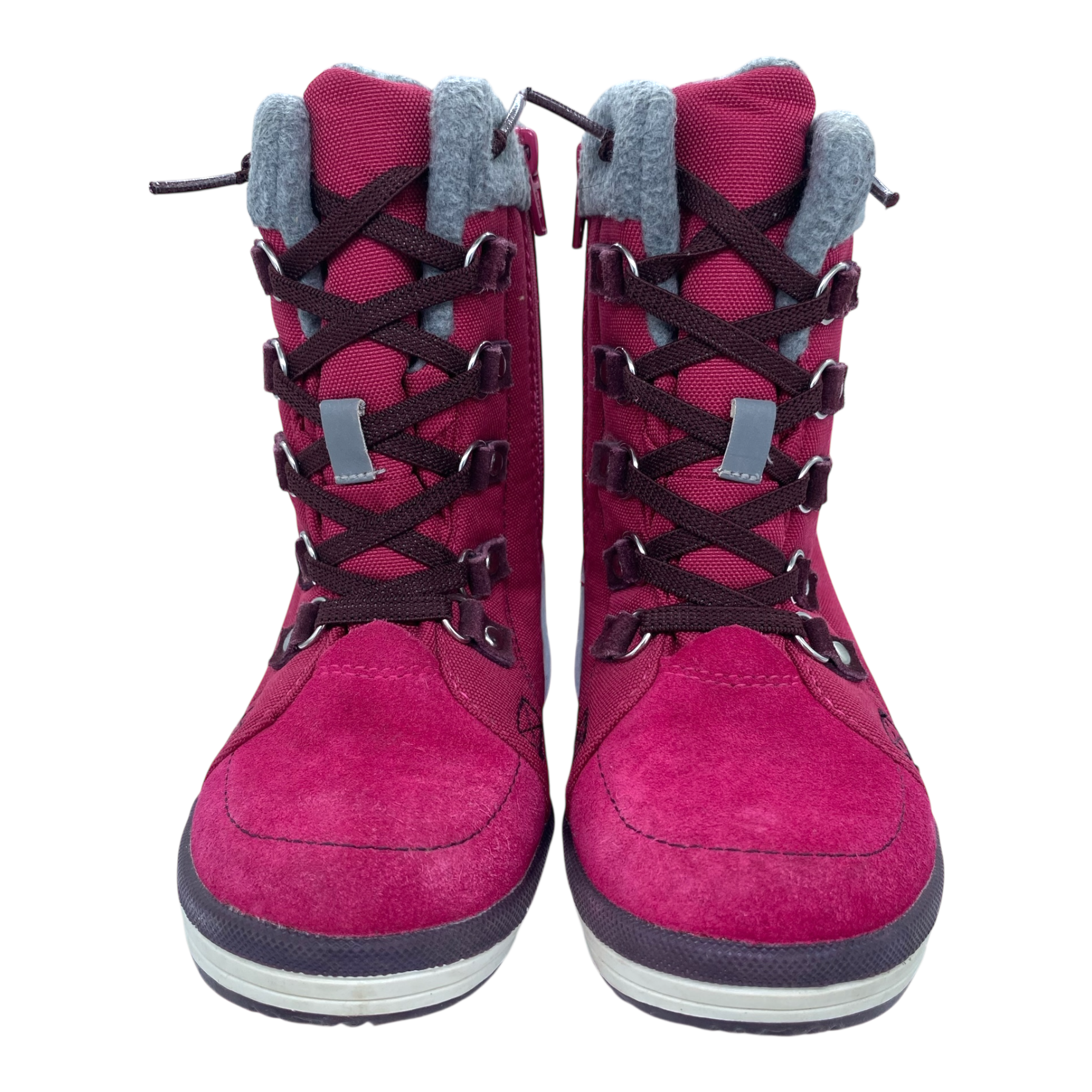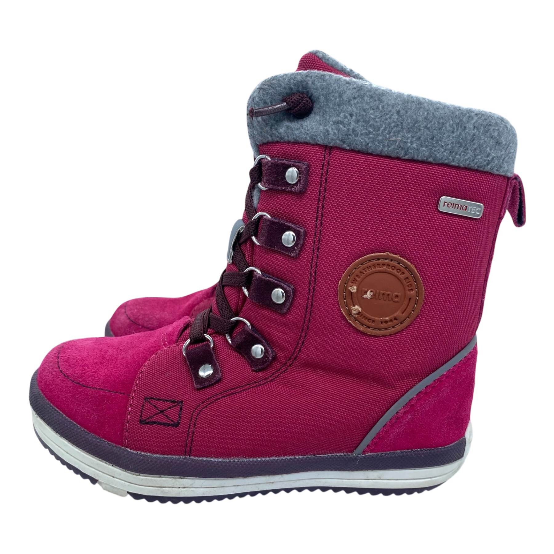 Reima Freddo winter shoes with zipper on the side. Shoes are originally waterproof and a great choice for a stroll in the city and fun outings in snow. The upper is made of beautiful cow suede and textile and the thermoplastic rubber outsole guarantees a good grip on various grounds.
