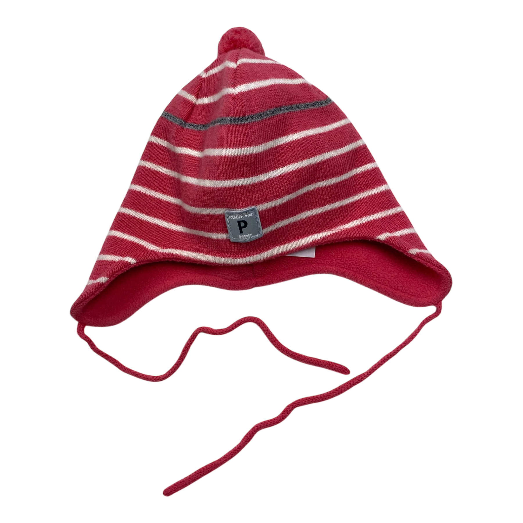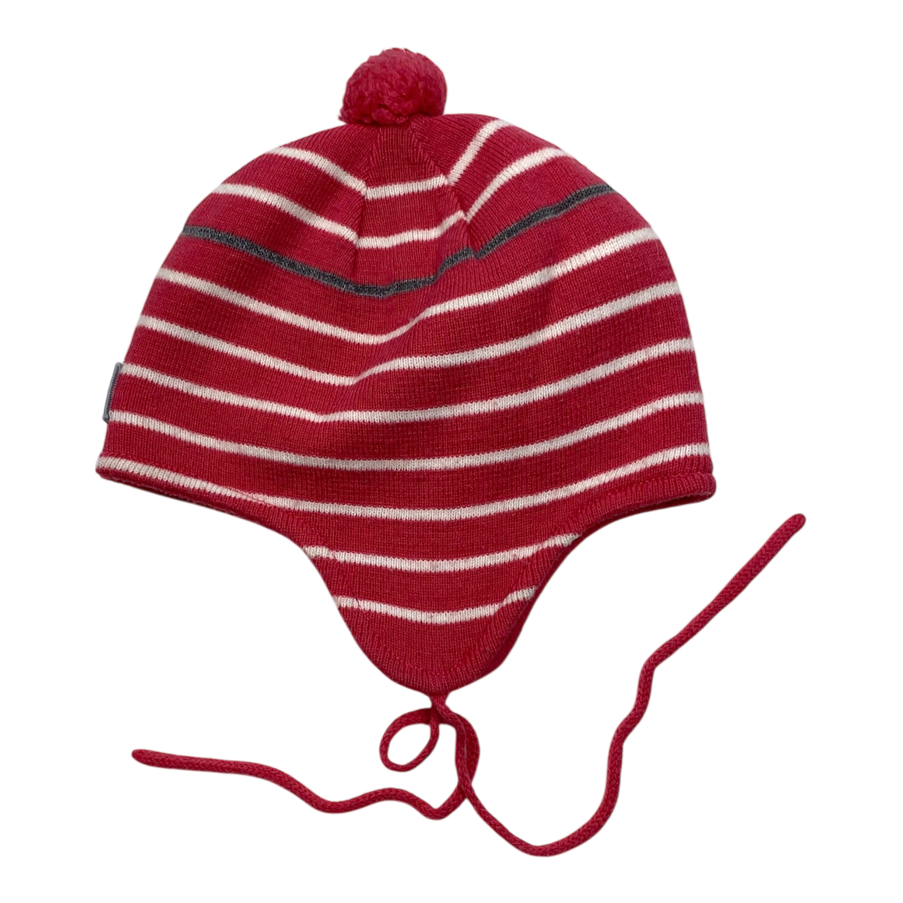 Polarn O. Pyret wool beanie with a pom and strings to tie with in stripe print.