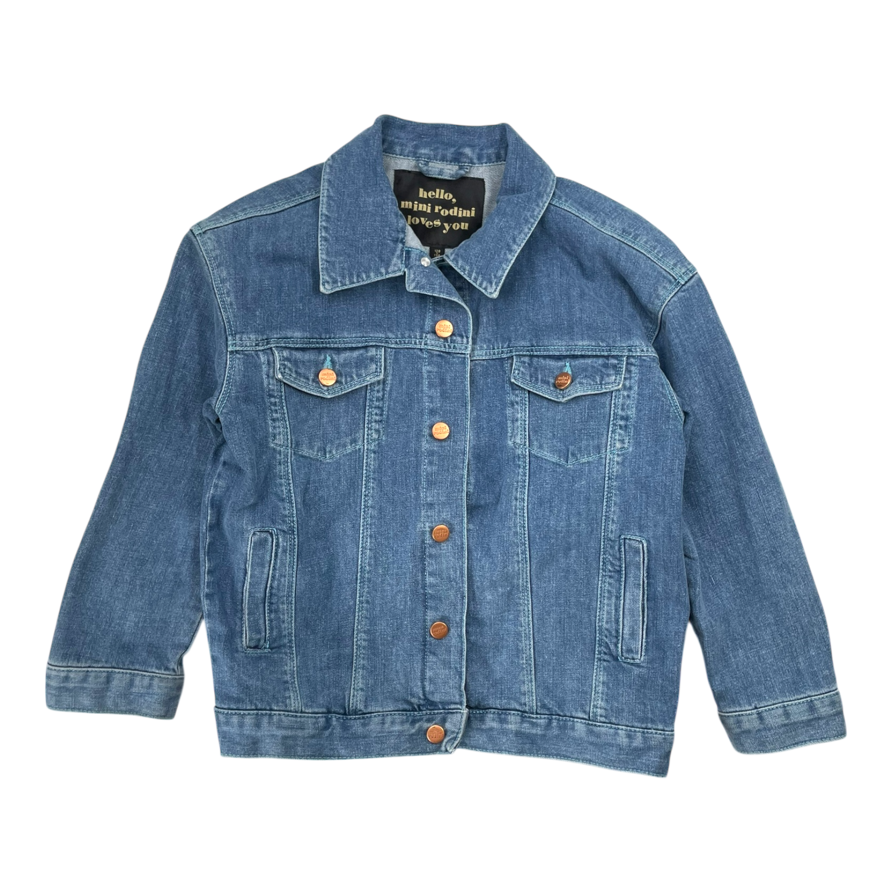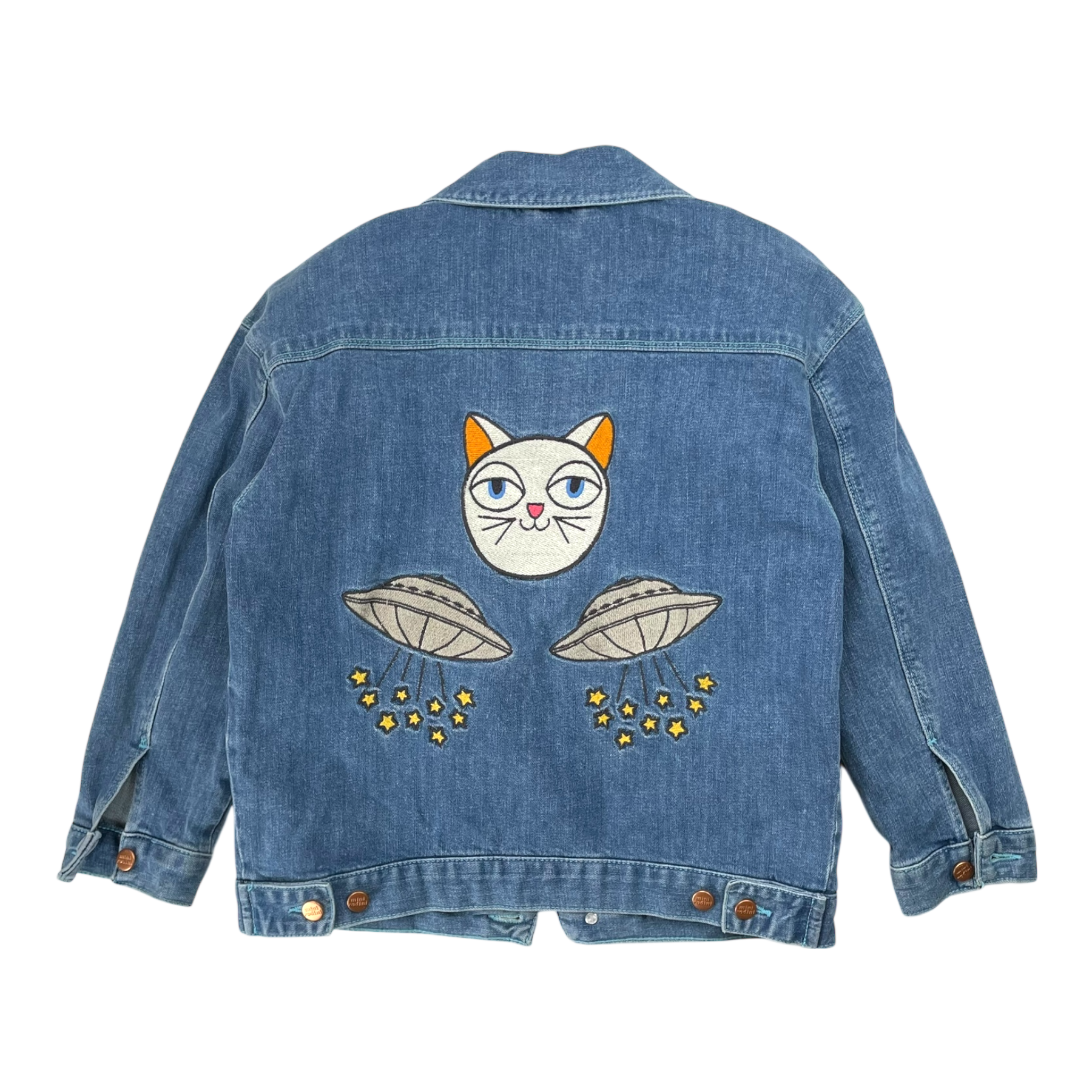 Mini Rodini jean jacket with a space cat embroidery on the back.
